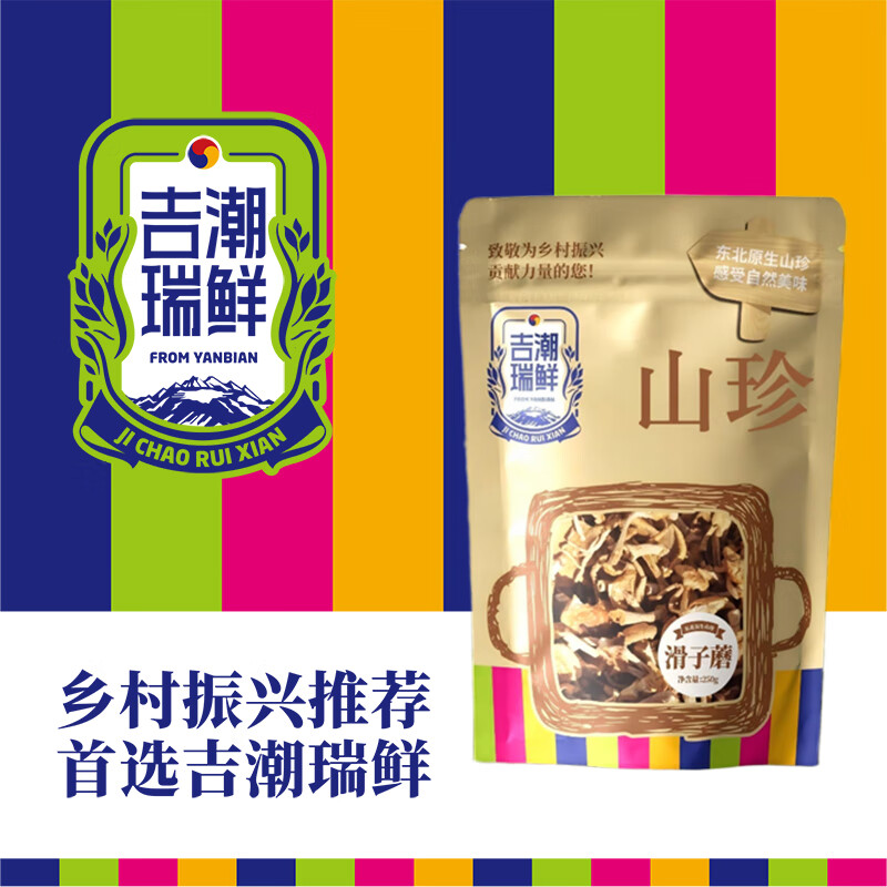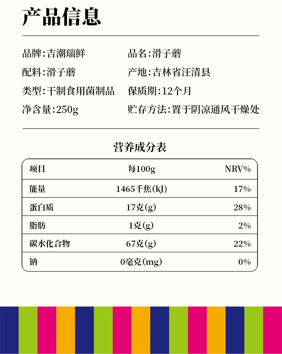 吉潮瑞鲜滑子蘑250克*1袋 配料:滑子蘑 产地:吉林省汪清县 类型:干制食用菌制品 保质期:12个月净含量:250g 贮存方法:置于阴凉通风干燥处