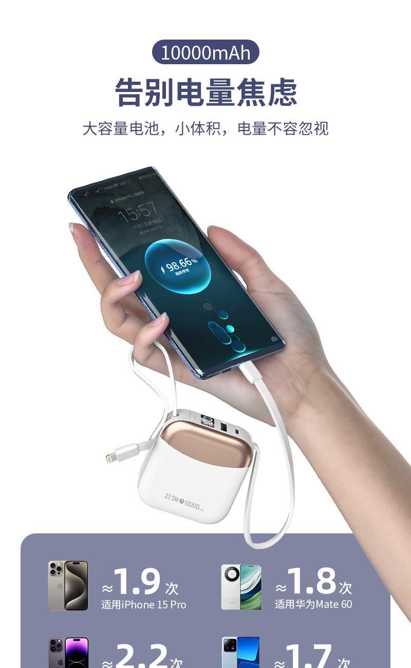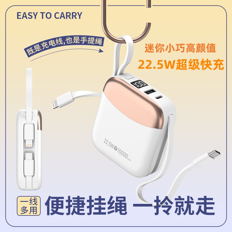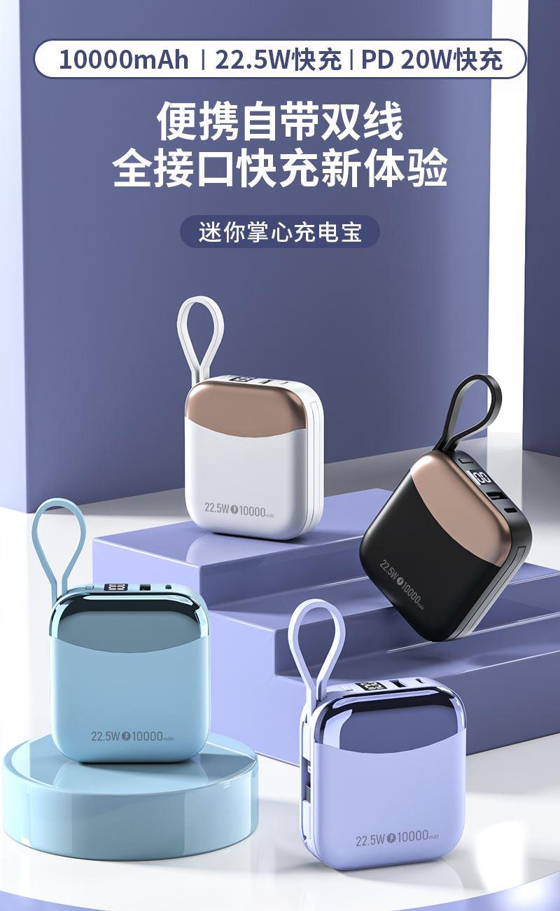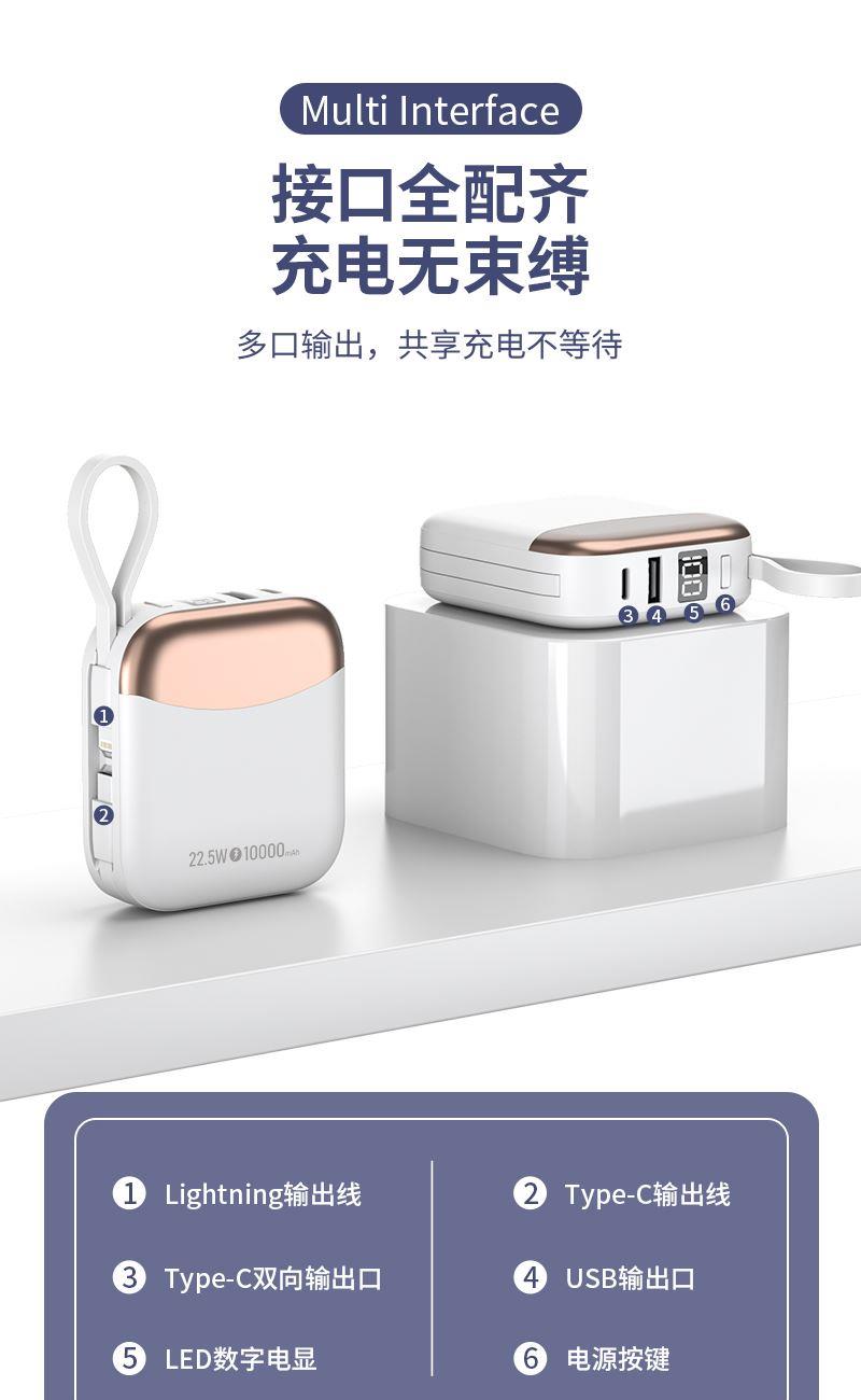 小身材,大容量,自带双线,迷你小巧快充,自带便携挂绳,一拎就走,可上飞机。