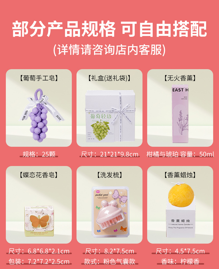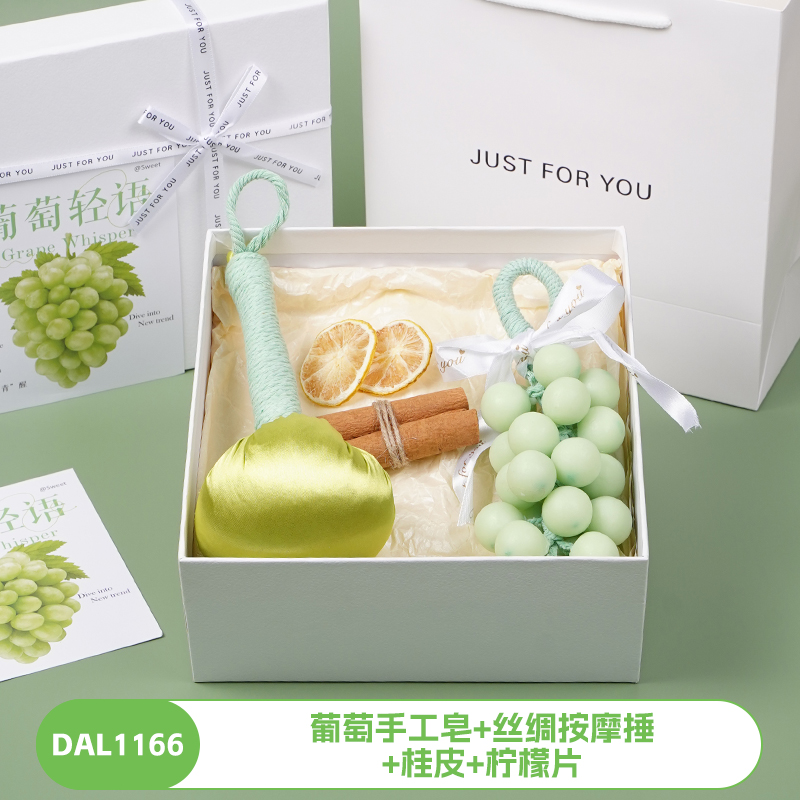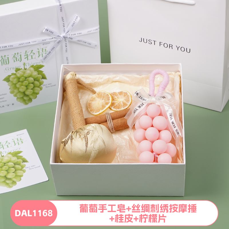 编码:DAL1166 内配:葡萄手工皂+丝绸按摩捶+桂皮+柠檬片 编码:DAL1167 内配:葡萄手工皂+丝绸刺绣按摩捶+桂皮+柠檬片 编码:DAL1168 内配:葡萄手工皂+丝绸刺绣按摩捶+桂皮+柠檬片 编码:DAL1169 内配:葡萄手工皂+小花擦手巾+柠檬片 编码:DAL1170 内配:葡萄手工皂+柠檬香薰蜡+柠檬片+桂皮