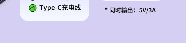 Type-C线输出:5V/ 3A;9V/ 2.22A;12V /1.67A;10V/2.25A