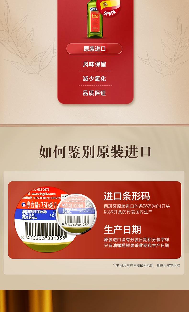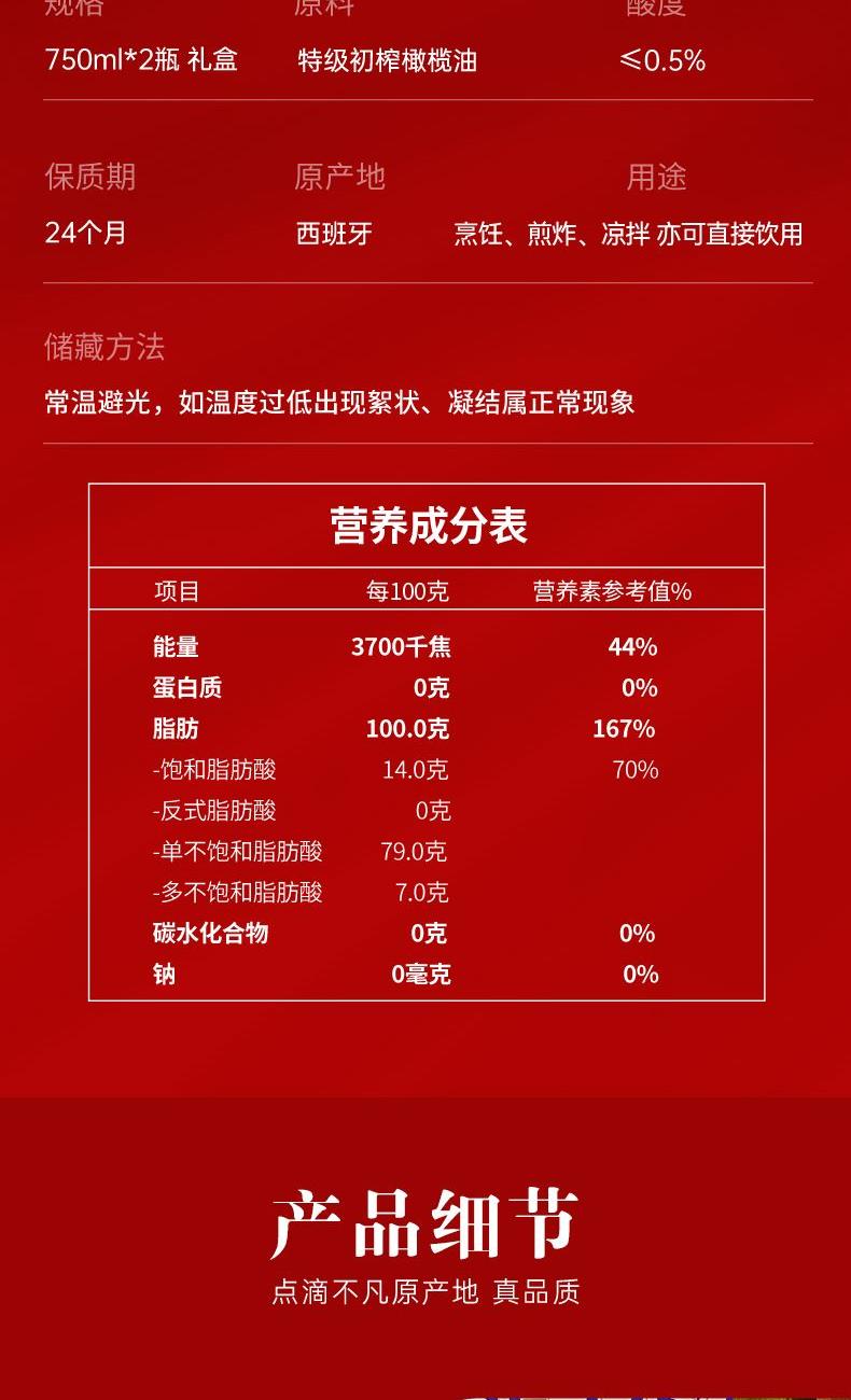 西班牙百年企业, 原瓶原装进口,西班牙皇室用油 产品类型:特级初榨橄榄油 产地:西班牙 产品容量:750ml*2 保质期:2年