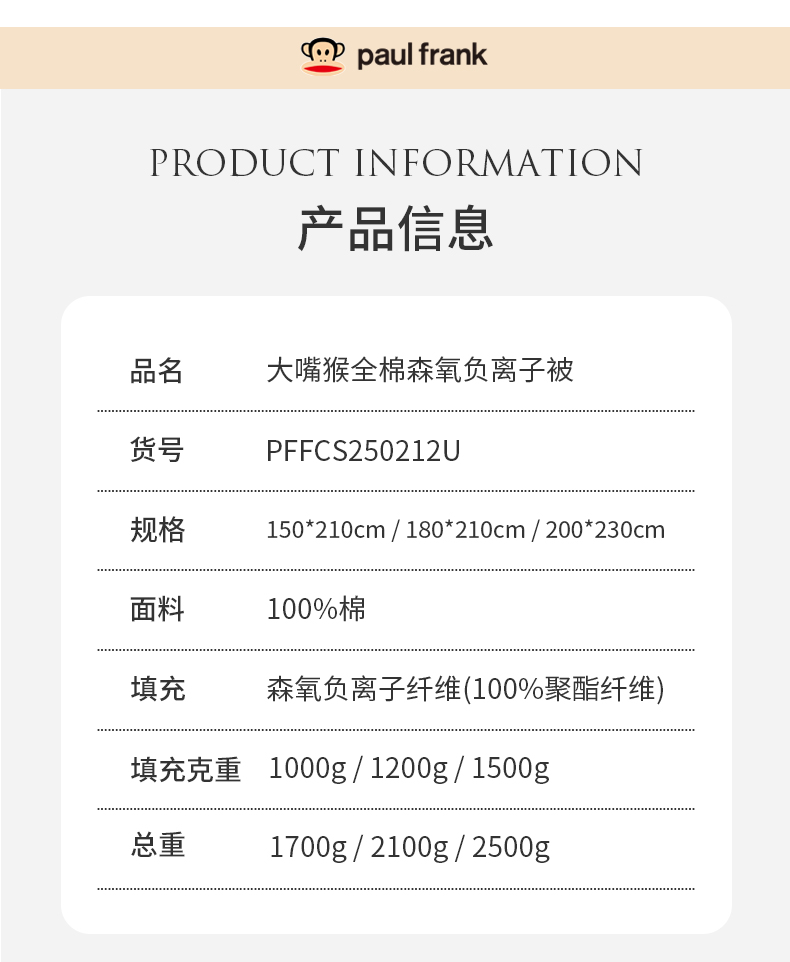 大嘴猴全棉森氧负离子被150×210cm(1700g)