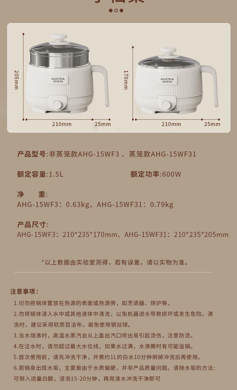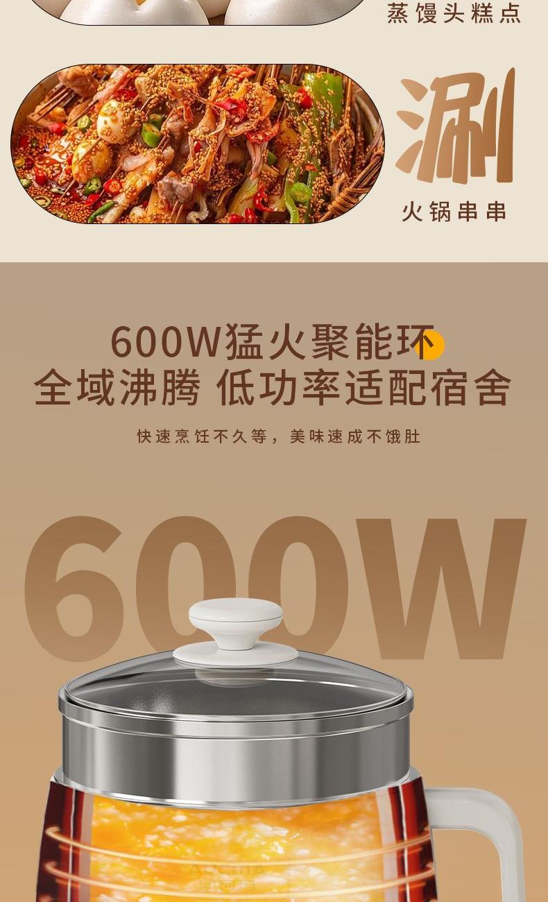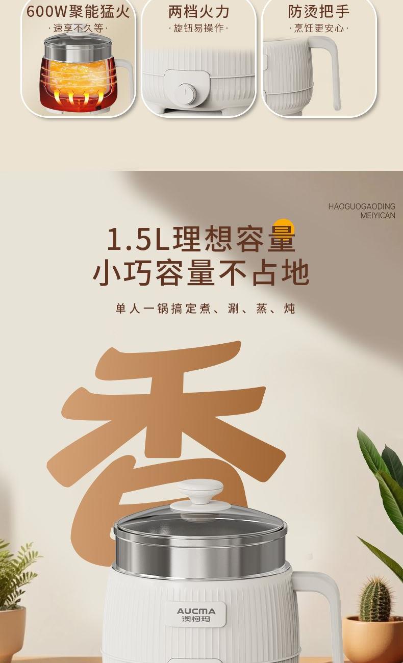 容量:1.5L 功率:600W 产品尺寸:210*210*145mm 一锅多用:煮、涮,轻食早餐,快手料理,美味同步 产品升级整圈发热管,效率高,加热更快 超温断电保护,控温多重防护 产品选用对人体健康安全食品级材料,轻油少烟,易清洗 产品采用防烫把手,操作快捷,双层锅体,隔热更耐用
