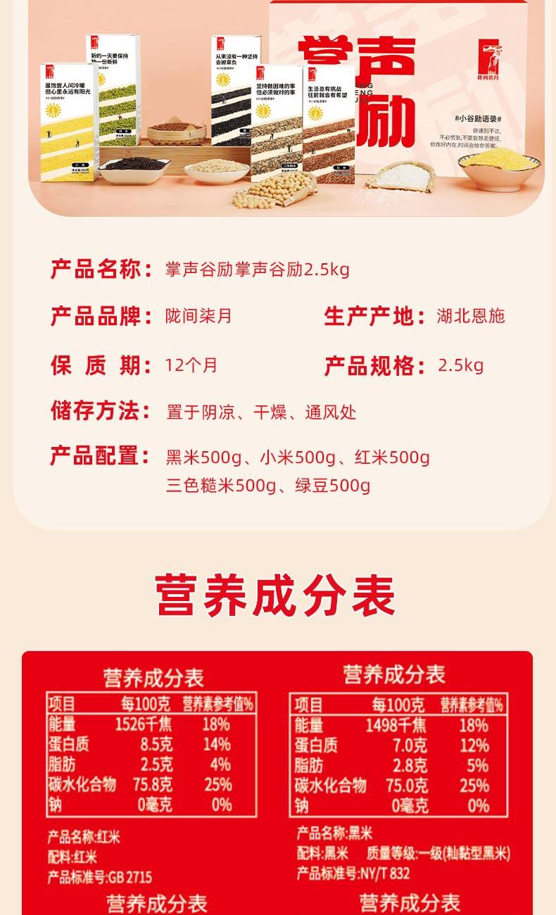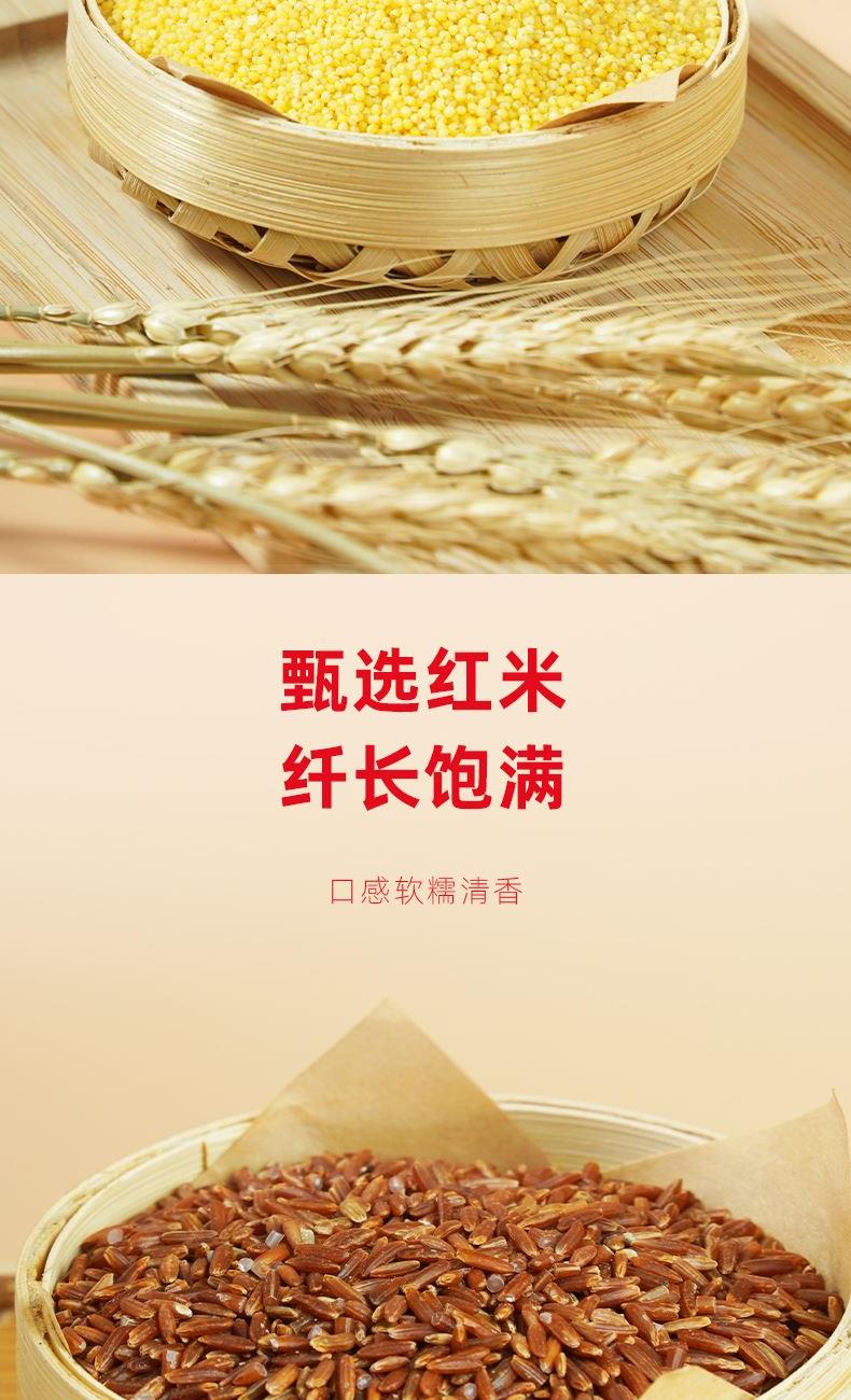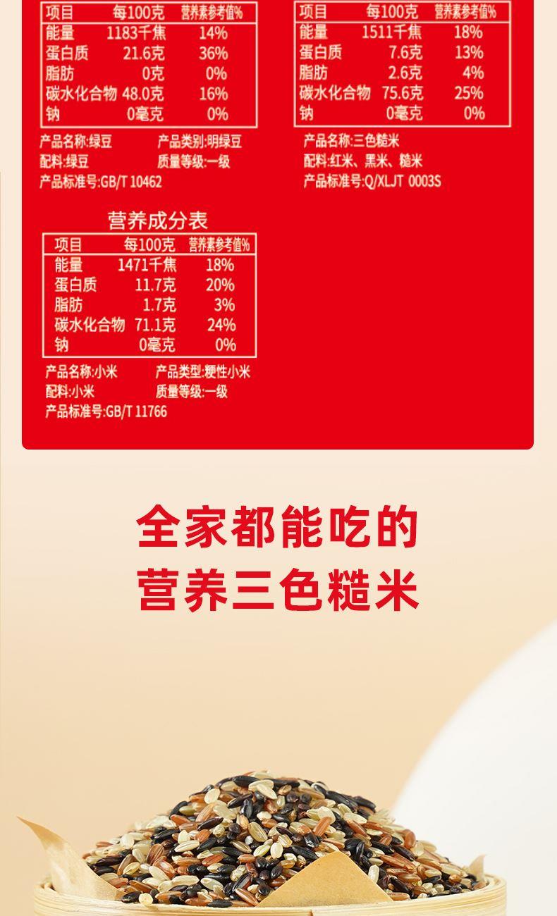1、严选好食材,膳食均衡搭配,健康心意之选; 2、黑米色泽黑亮,香糯粘稠,小米米油浓厚,红米色泽红亮,三色糙 米低脂高纤维,高饱腹感,轻食代餐,红小豆易出沙,绿豆易煮易熟,绵软沙糯。