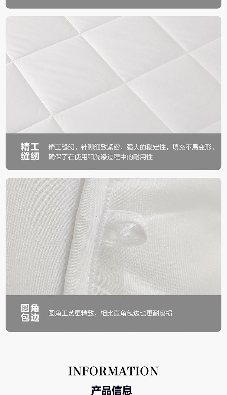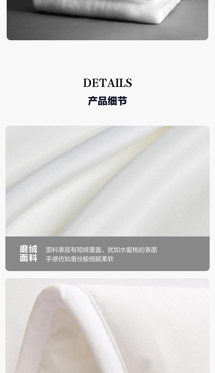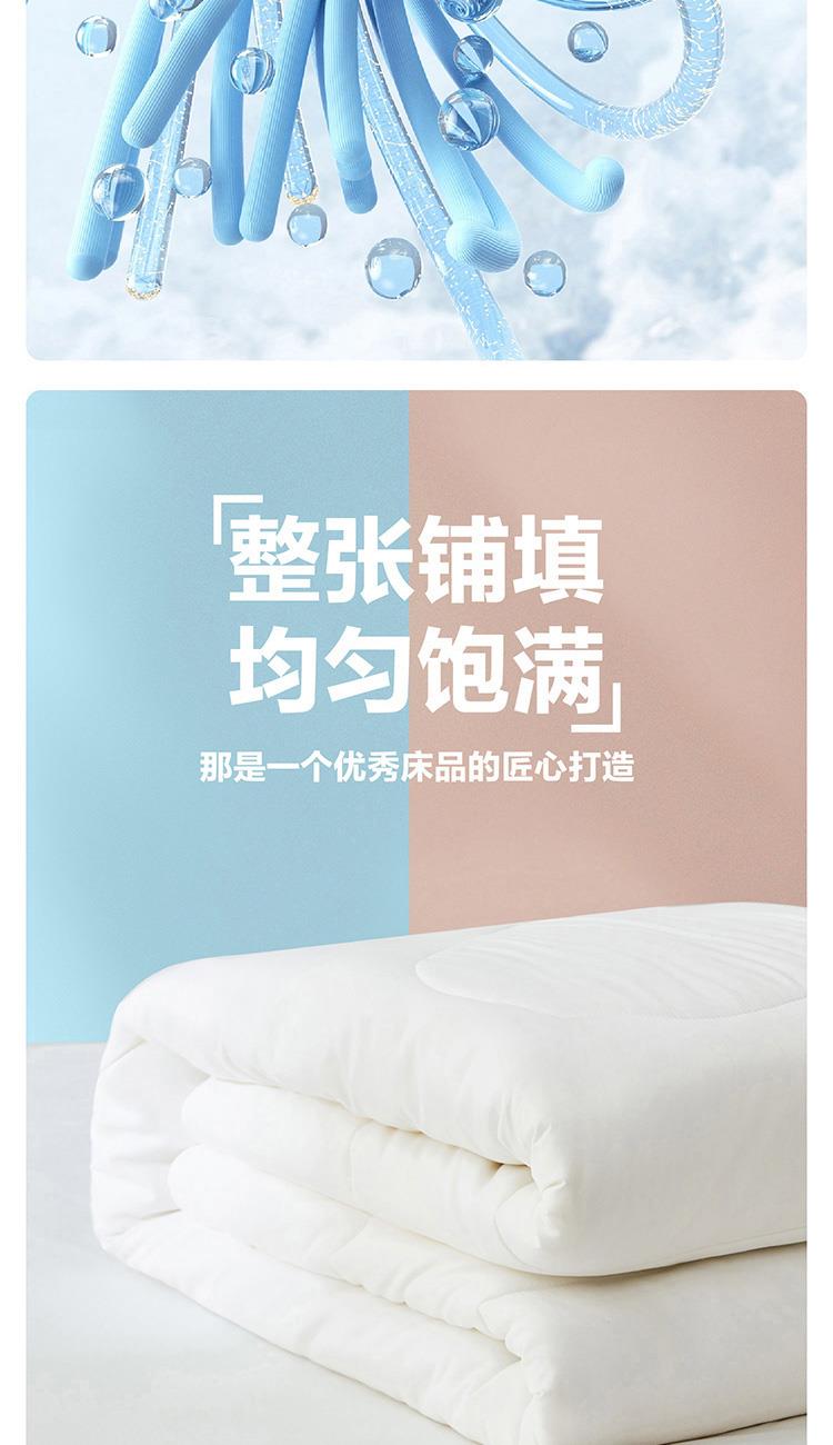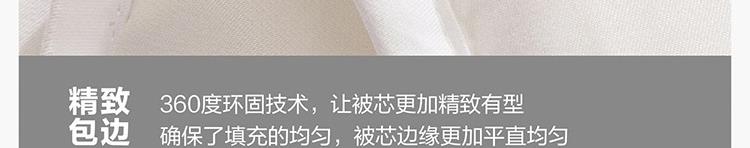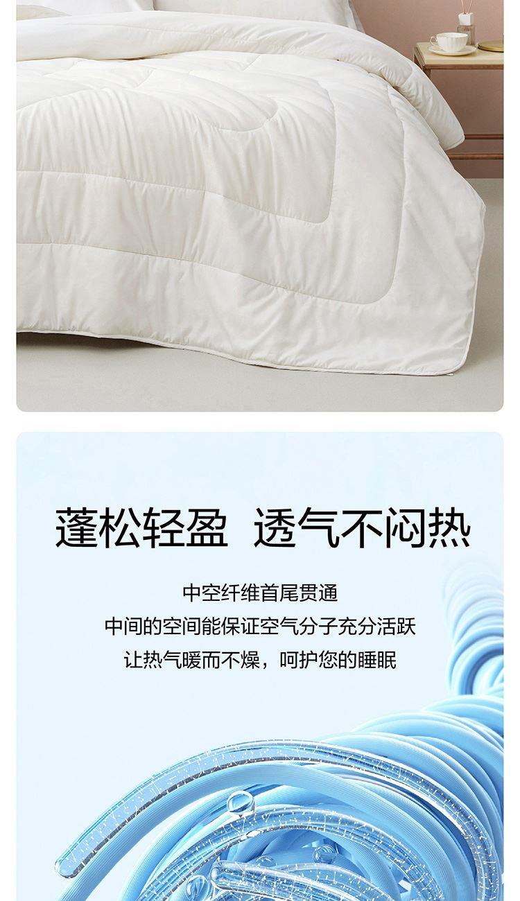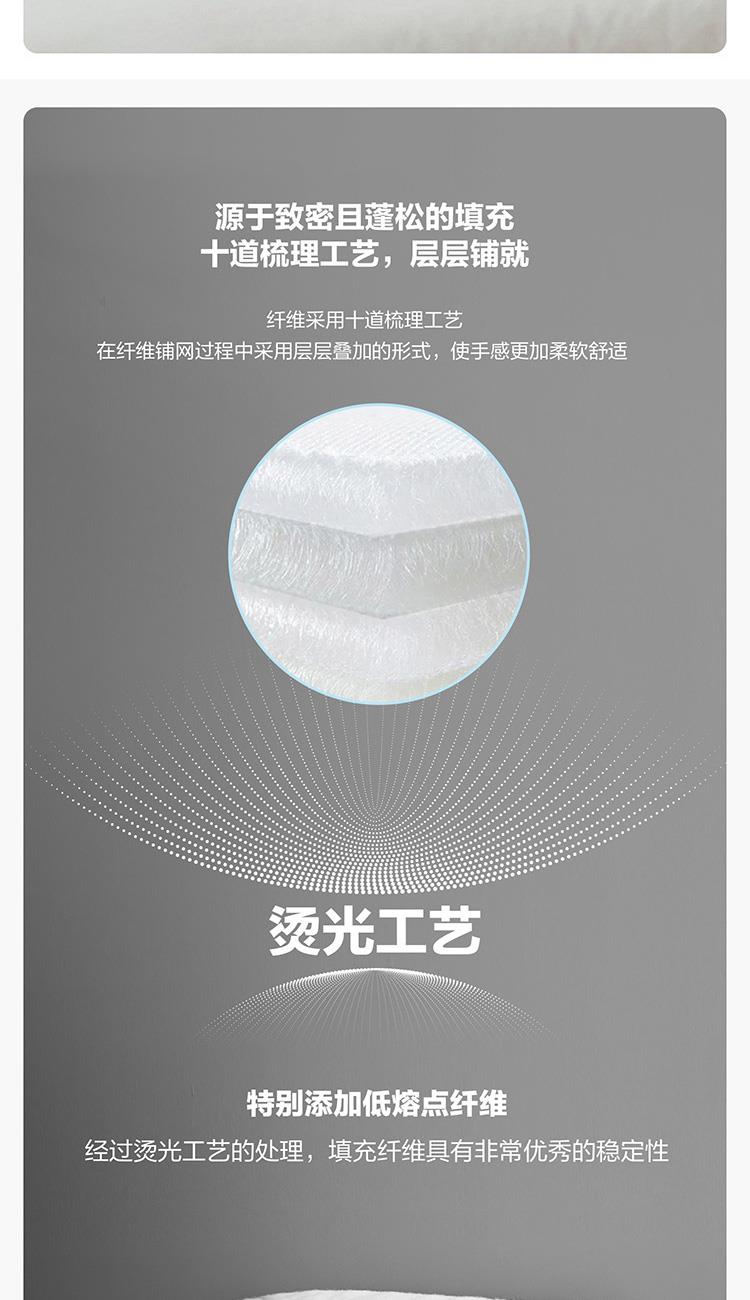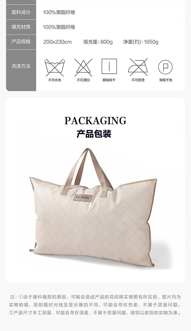 面料材质:聚酯纤维 填充材质:聚酯纤维 规格尺寸:200*230cm 填充重量:800g 外箱尺寸: 55*65*120cm 采用桃皮绒磨毛压花面料,表面附有细密的绒毛,手感绵密,亲肤舒适; 可迅速排湿;此外中空结构减少了纤维20%的重量,被芯保持轻柔且在挤压后纤维不易纠缠打结,更加蓬松,即便长期使用,也能保持良好的回弹性,带来舒柔温暖的睡眠体验。