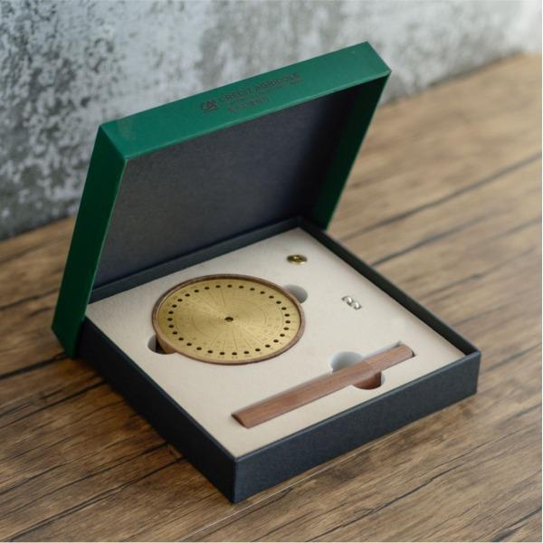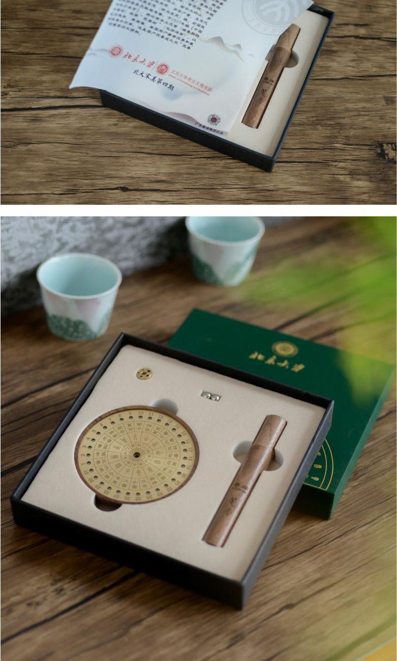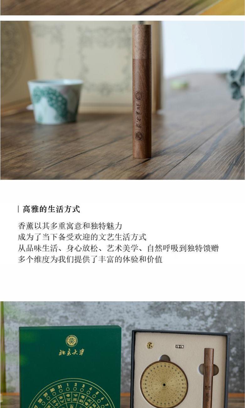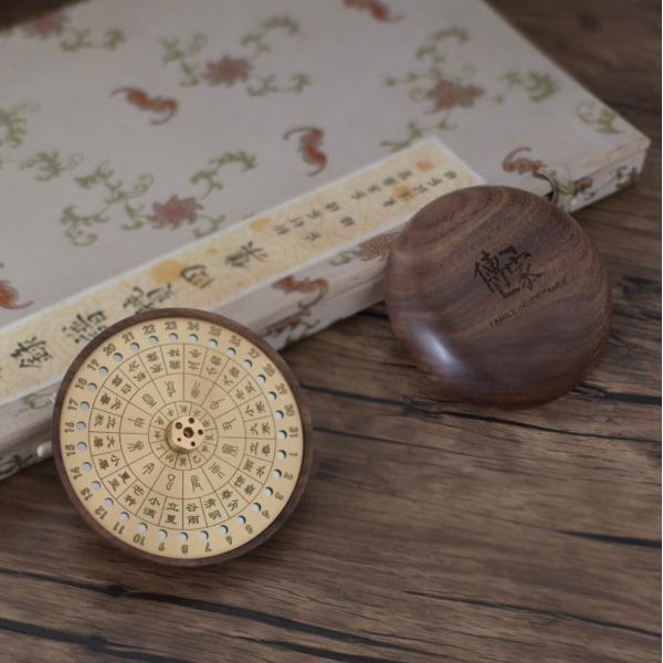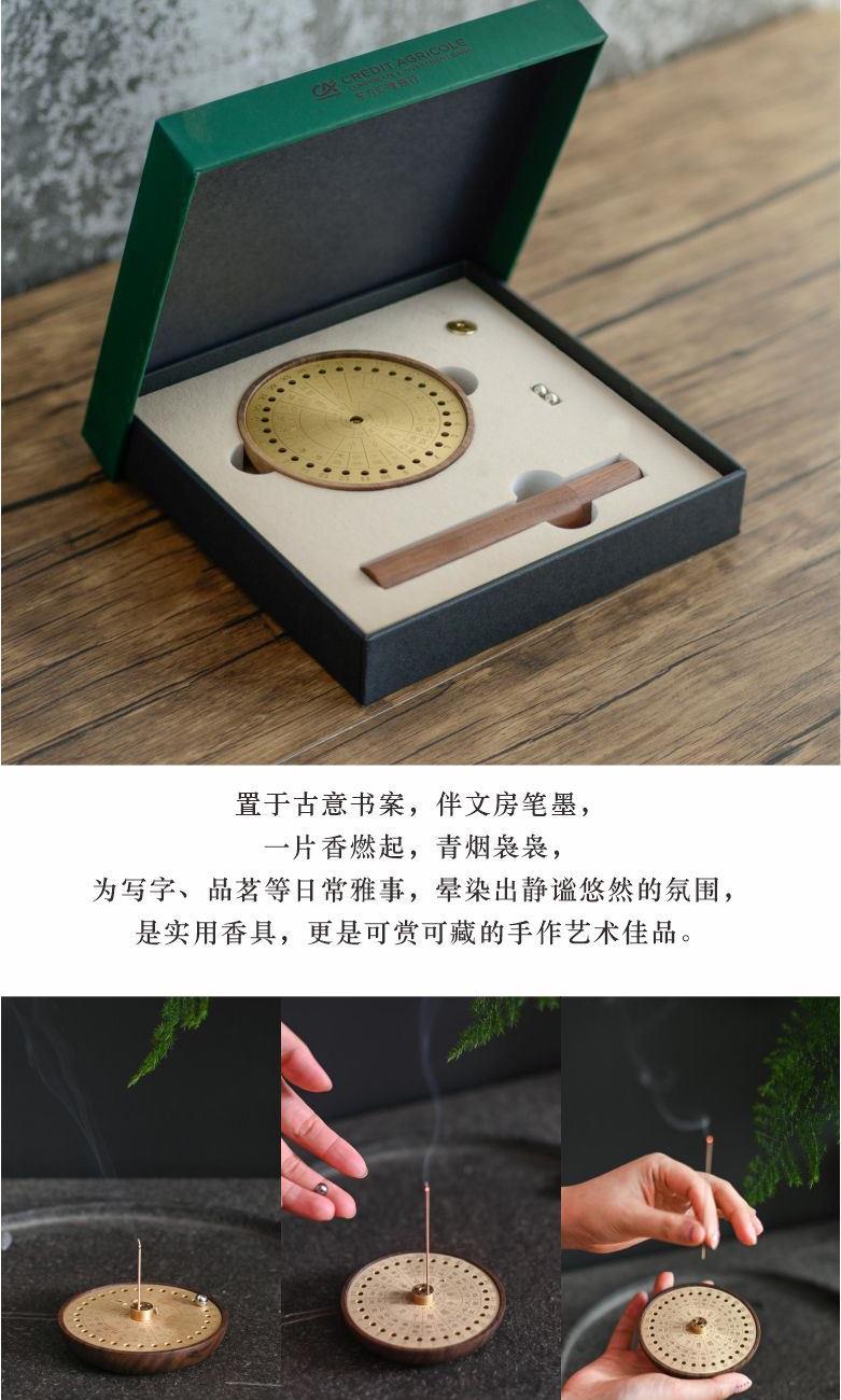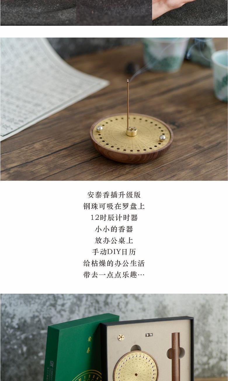 安泰·香器 作品以古代吉时工具“日晷”为原型,以黄铜和胡桃木为原材料,融入天干地支,二十四节气等元素,设计成日晷星盘状的日历香插。 香器集合了点香赏香,计时数历等多种功能,不仅是精美香盘,也是珍贵的传统文化结晶。造型别致雅观,与日晷如出一辙,赏之心安神泰,故得名安泰。 安泰香器 组合:香插+香管+强磁铁钢珠 材质:黑胡桃+铜 工艺:精车+切割 规格: 香座:φ9cm*1.8cm 包装盒:18cm*18cm*3cm 袋子:22*24*5.5cm 配香:星洲水沉