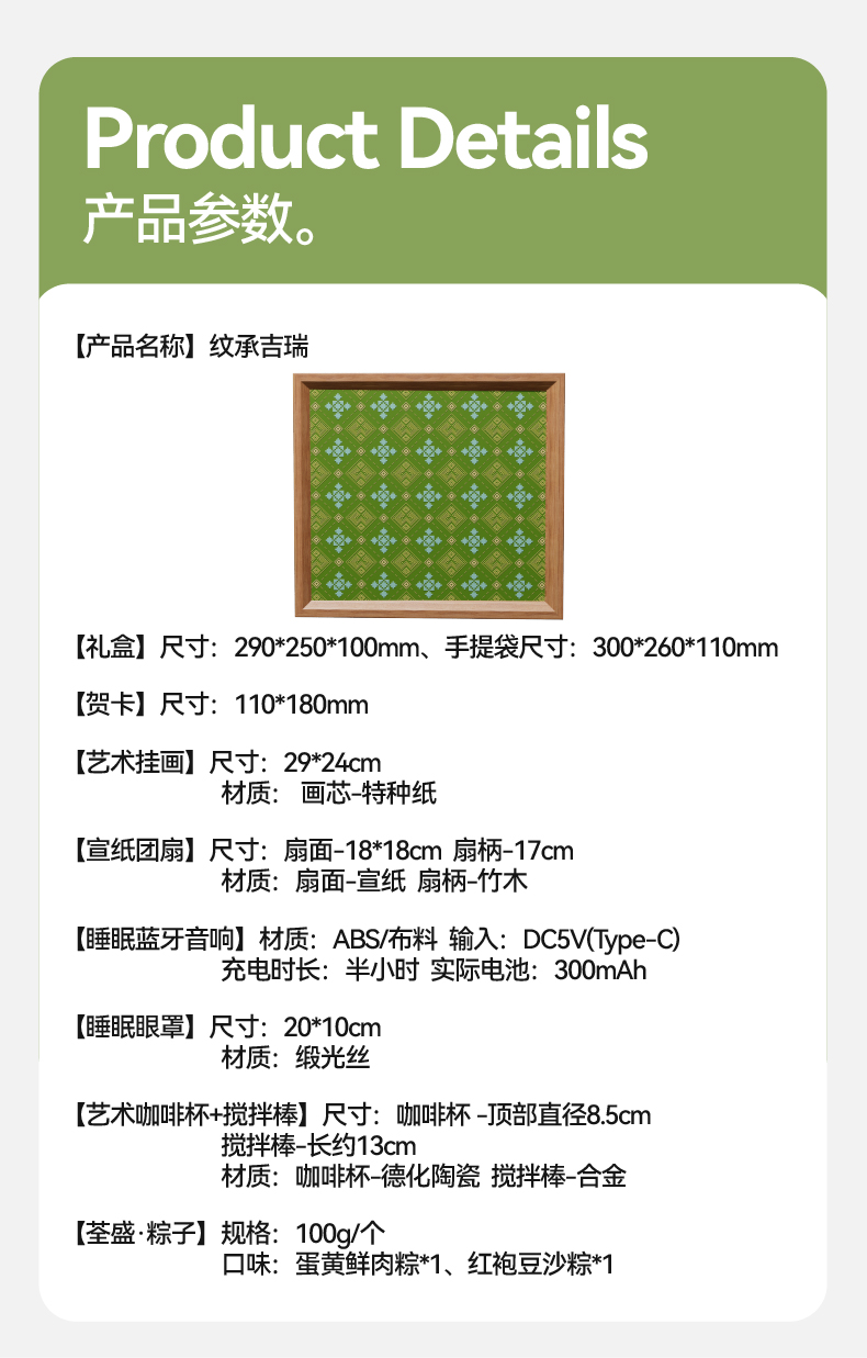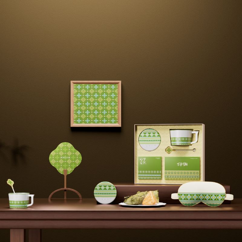 千年瑶纹,自山川云霭间走来 瑶族先民将日月星辰、花鸟虫鱼织入衣襟 针脚间藏着对自然的敬畏与生活的祈愿 端午临仲夏,我们撷取这份跨越山海的吉祥符号 让古老纹样在礼盒上新生 瑶纹铺展,如山川守候,如星辰垂护 每一道线条,皆是对安康的祈愿,每一寸构图,皆是对传统的敬承 纹中有礼,瑞自天成。 内配: 配置一:礼盒&手袋x1 配置二:荃盛·粽子x2 配置三:宣纸团扇x1 配置五:艺术挂画x1 配置四:睡眠蓝牙音响x1 配置五:咖啡杯x1 配置六:咖啡搅拌棒x1 配置七:睡眠眼罩x1 配置八:贺卡x1