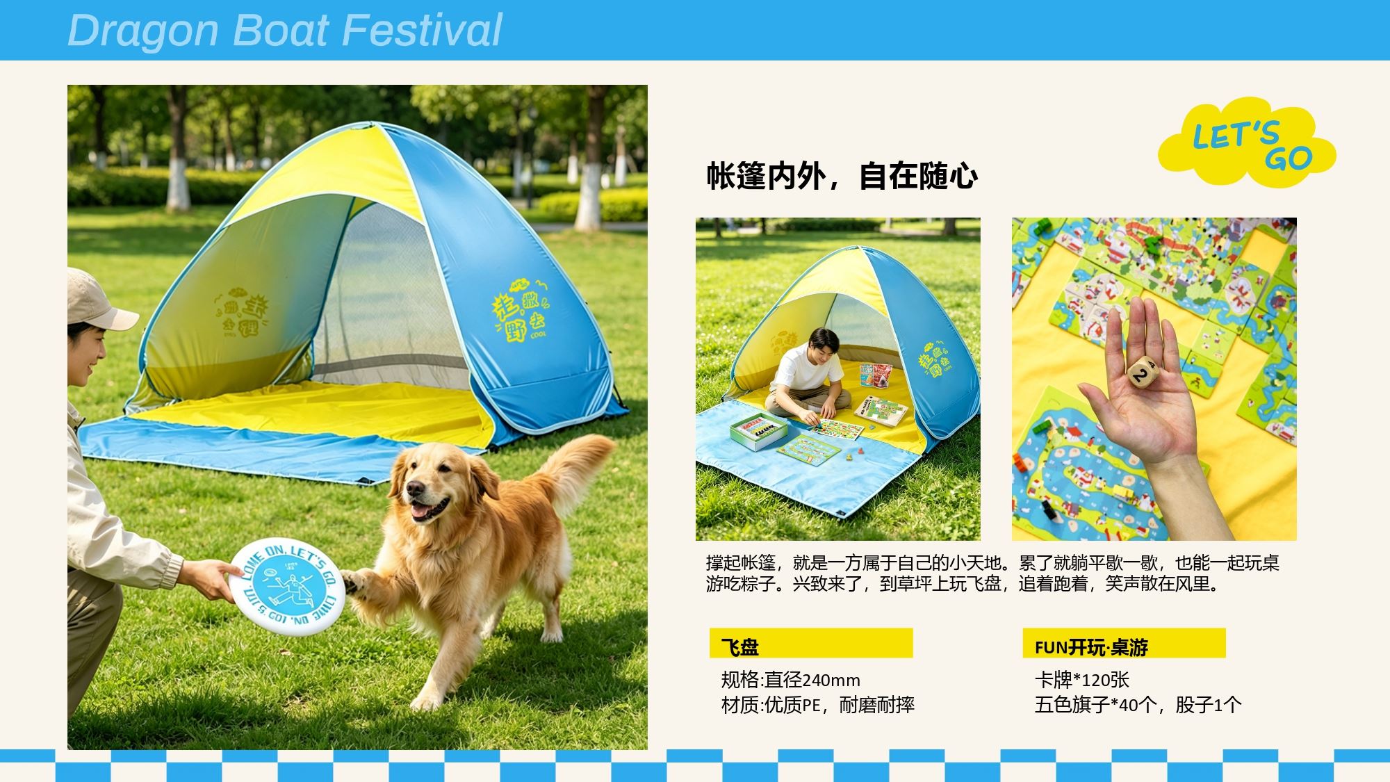 产品配置 帐篷*1 (1450*1650*1100mm) 帐篷收纳包*1,(直径480mm) 桌游FUN*1 飞盘*1,直径240mm 端午挂件*1 真真老老粽子*2 (蛋黄鲜肉粽/红袍豆沙粽)