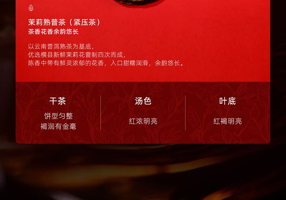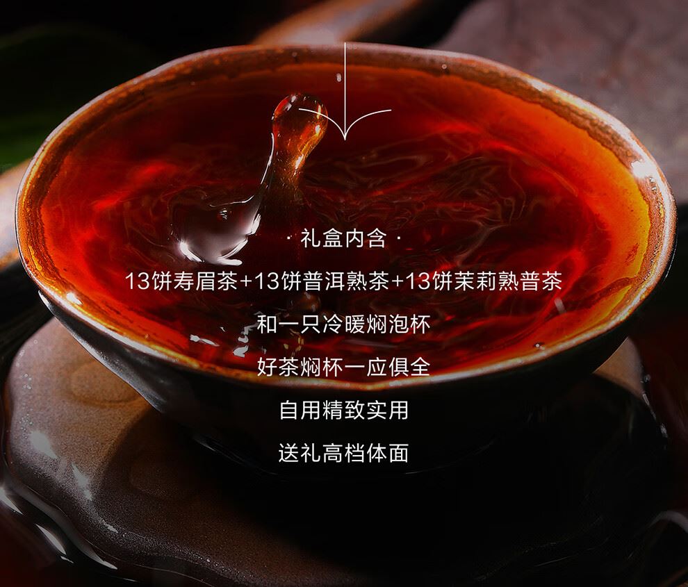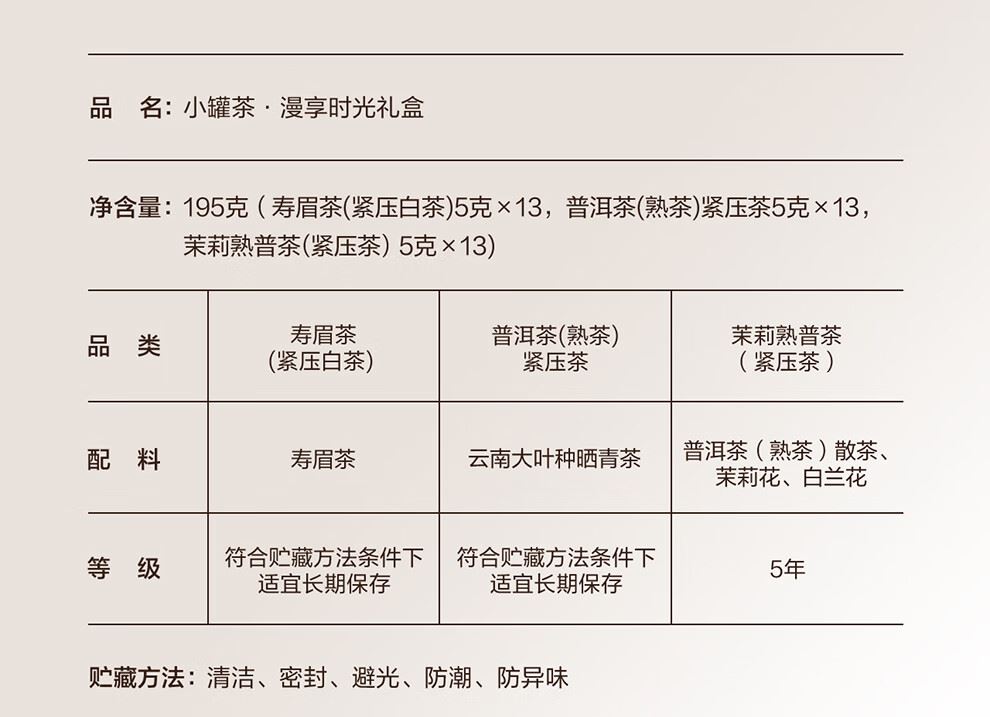 茶饼净含量:195克(寿眉茶(紧压白茶)5克x13饼,普洱茶(熟茶)紧压茶5克x13饼,茉莉熟普茶(紧压茶)5克x13饼)