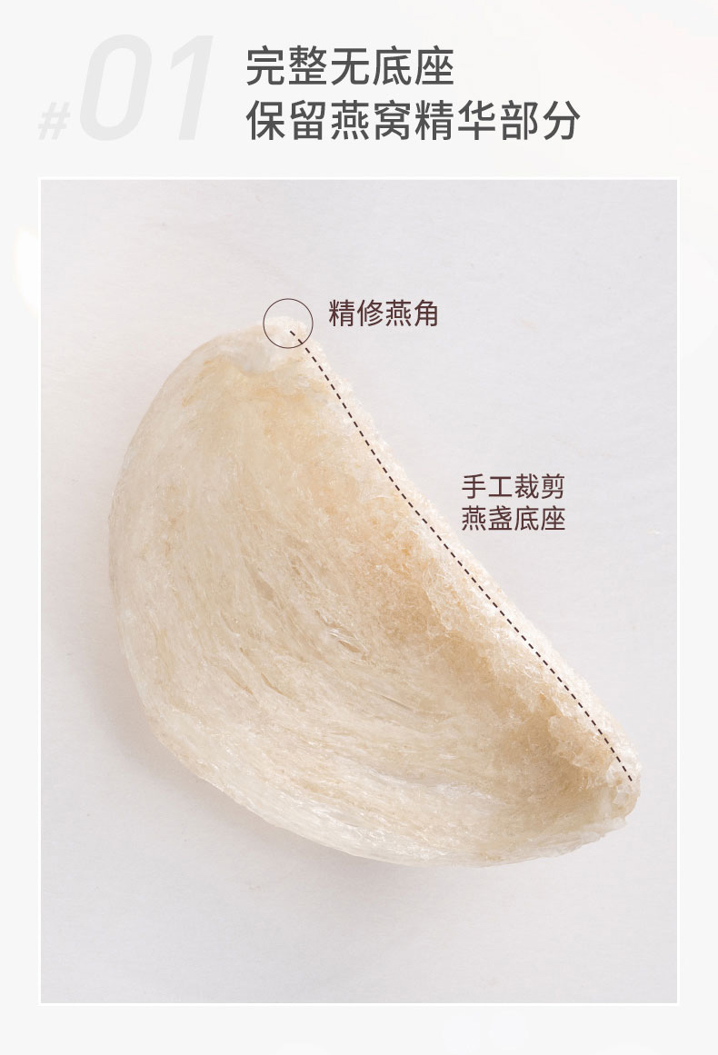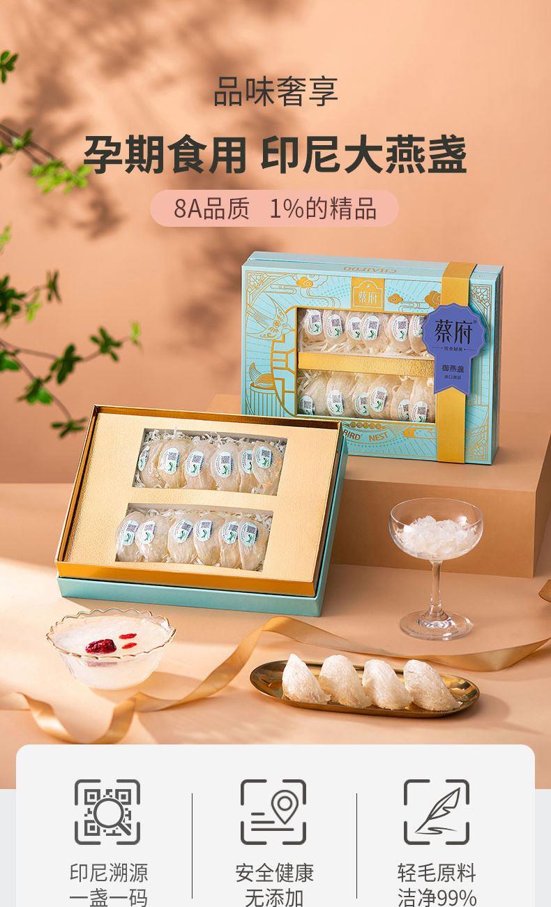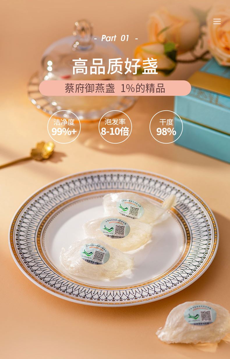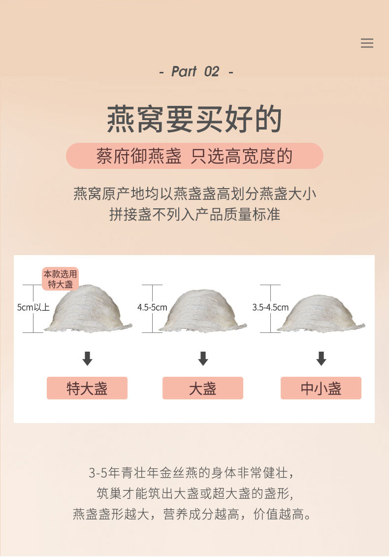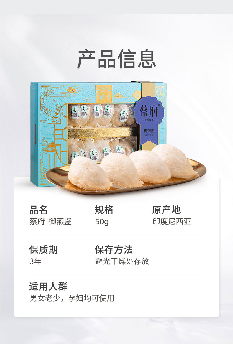 蔡府御燕盏 规格:50g 单品尺寸: 孕婴级大燕盏,正规溯源进口,颜色自然,不漂白,质量保证; 天然好燕窝,营养丰富; 底座薄,燕角小,燕盏大; 洁净大盏,蛋香味浓; 发头大,口感好,营养佳。
