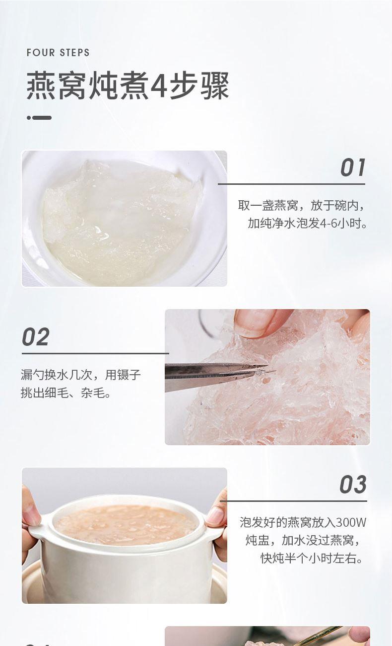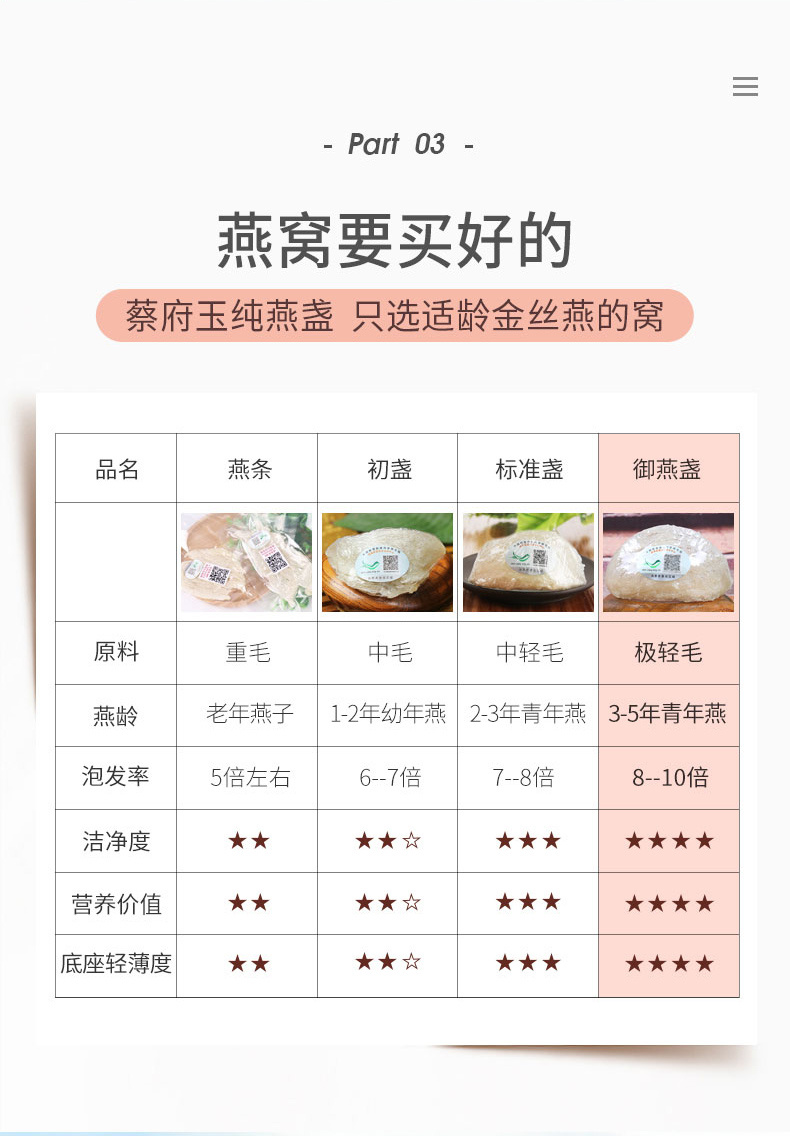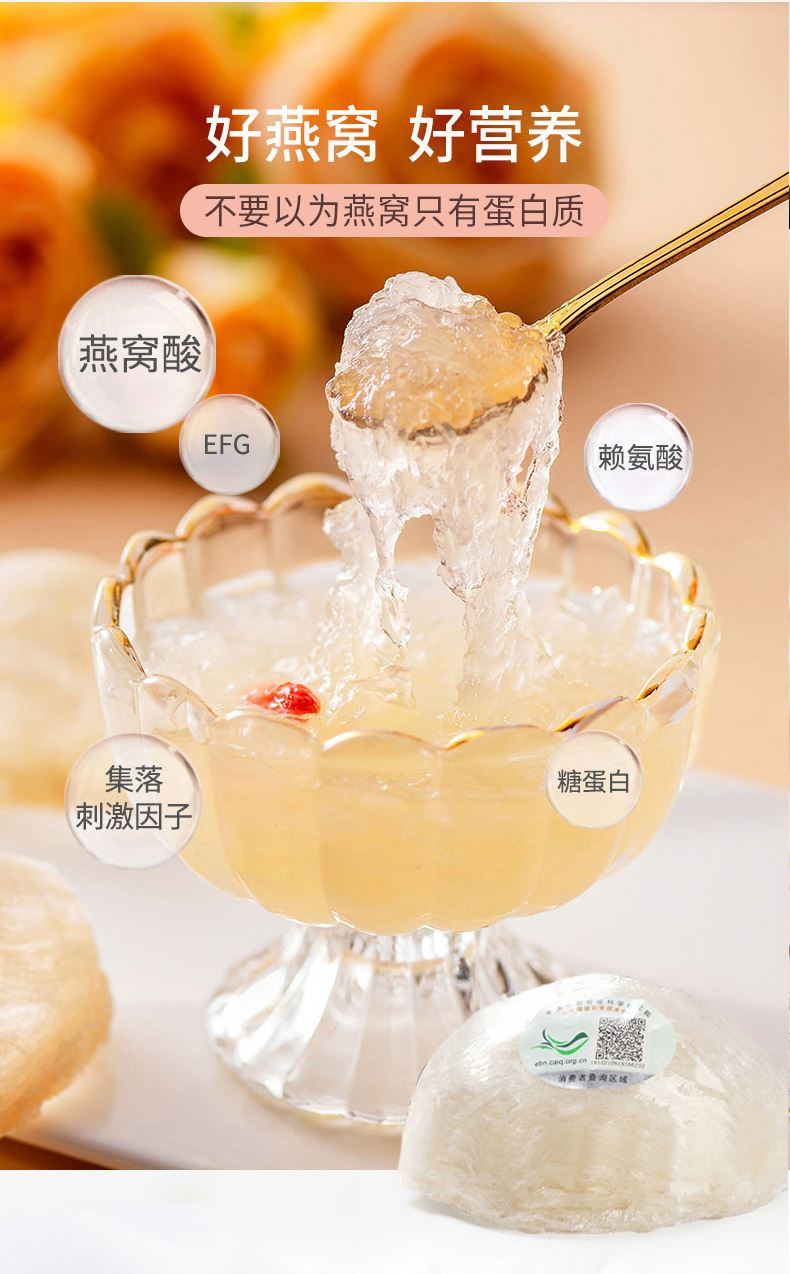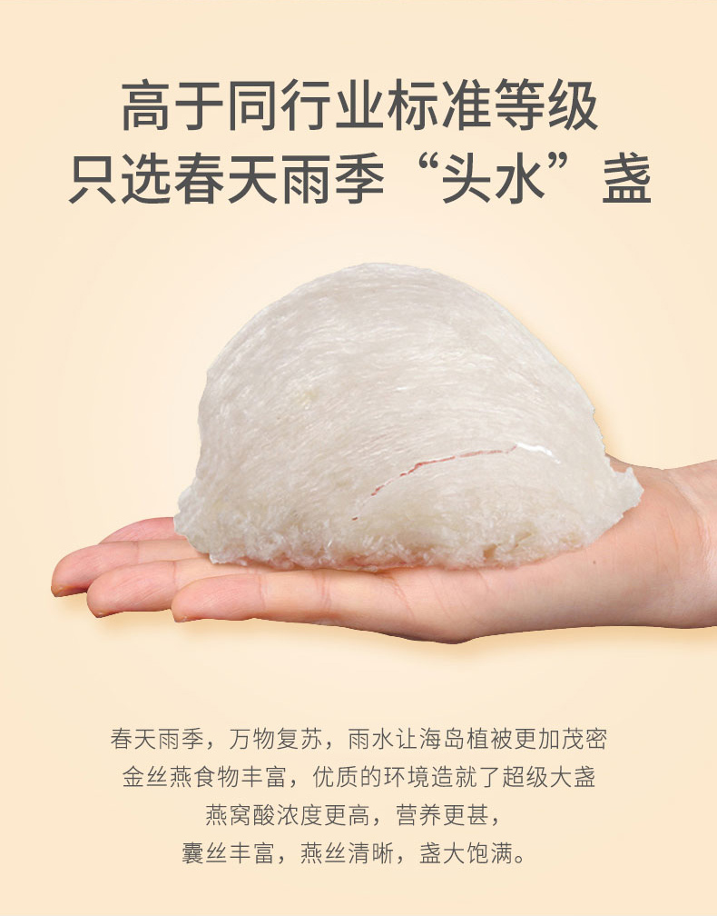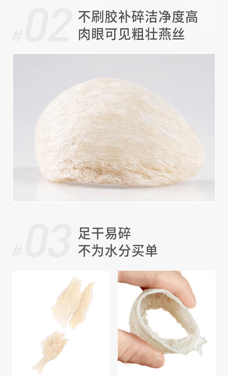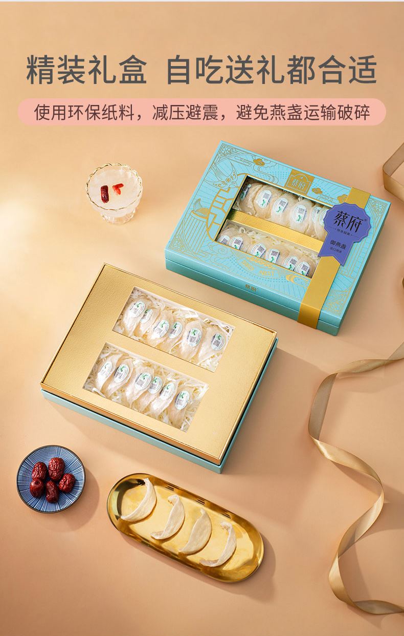 蔡府御燕盏 规格:50g 单品尺寸: 孕婴级大燕盏,正规溯源进口,颜色自然,不漂白,质量保证; 天然好燕窝,营养丰富; 底座薄,燕角小,燕盏大; 洁净大盏,蛋香味浓; 发头大,口感好,营养佳。