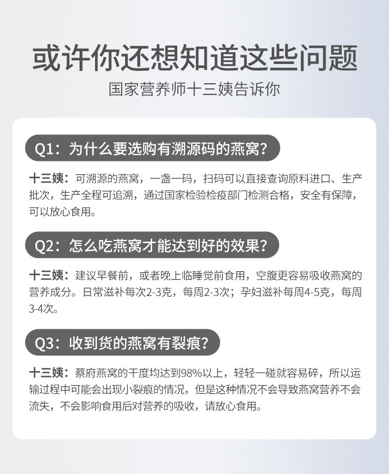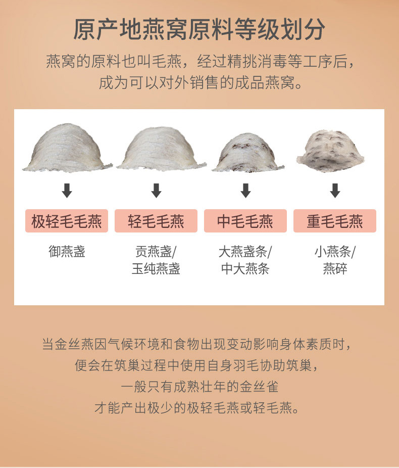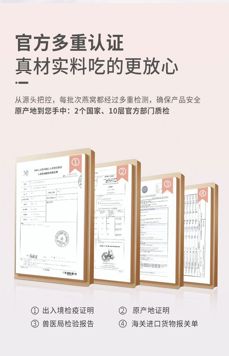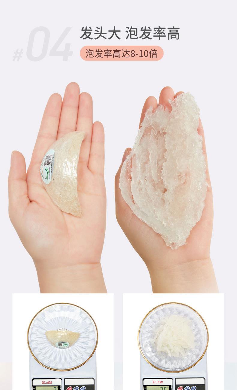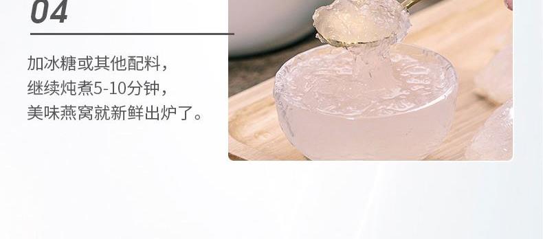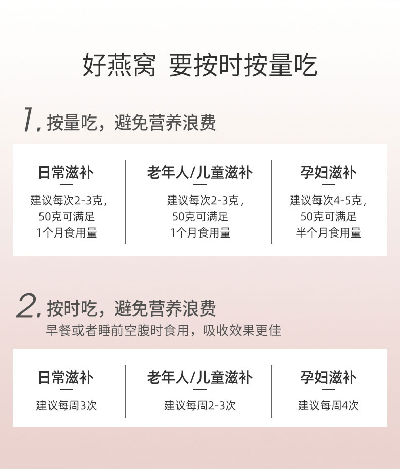 蔡府御燕盏 规格:50g 单品尺寸: 孕婴级大燕盏,正规溯源进口,颜色自然,不漂白,质量保证; 天然好燕窝,营养丰富; 底座薄,燕角小,燕盏大; 洁净大盏,蛋香味浓; 发头大,口感好,营养佳。