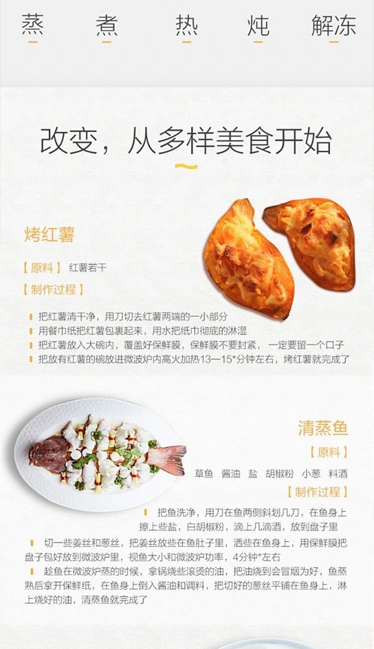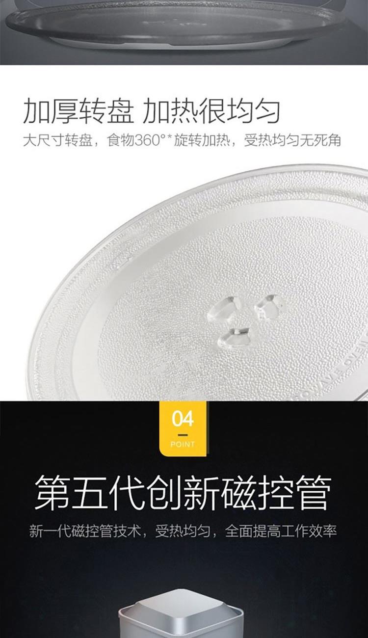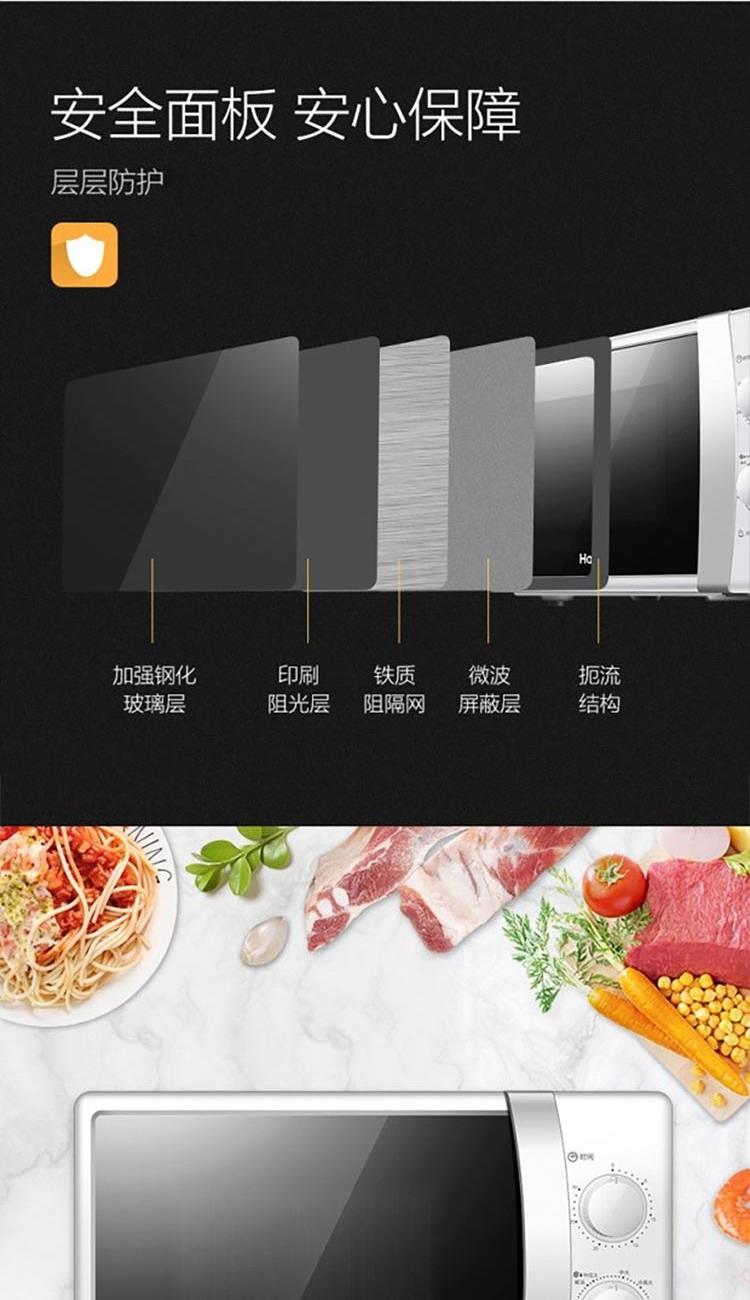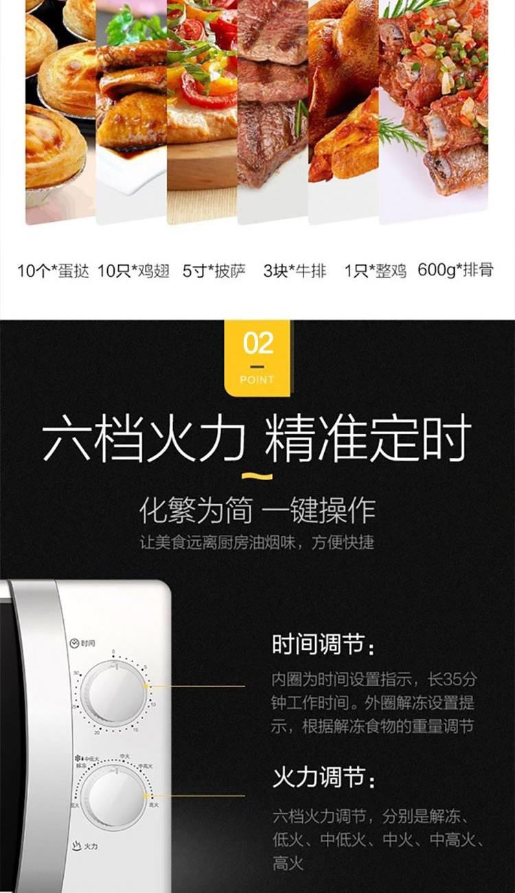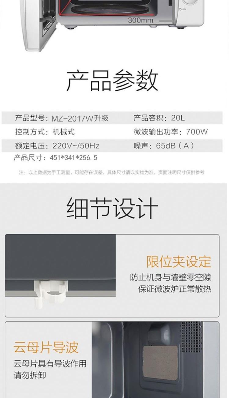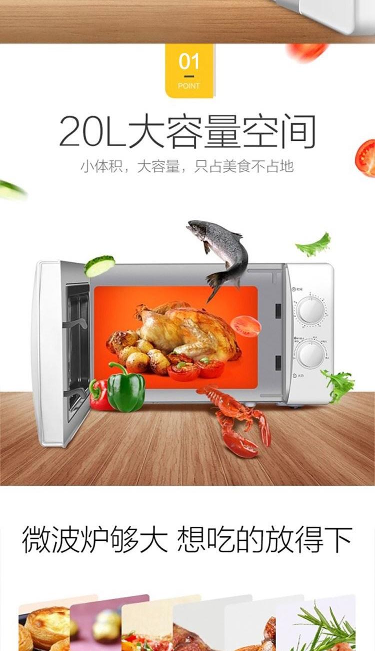 容积:20L 加热方式:转盘 开门方式:侧拉门 控制方式:机械式 操作方式:机械旋钮 微波功率:700W 能效等级:3级 产品尺寸:451*327*257 产品净重10 重量(含包装)11.3 1. 旋钮操作,一键操作; 2. 20升大容量空间; 3. 易清洗内胆