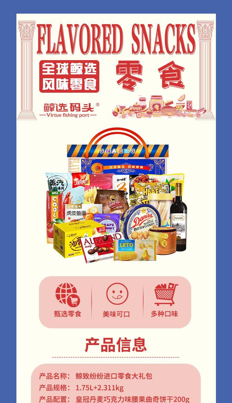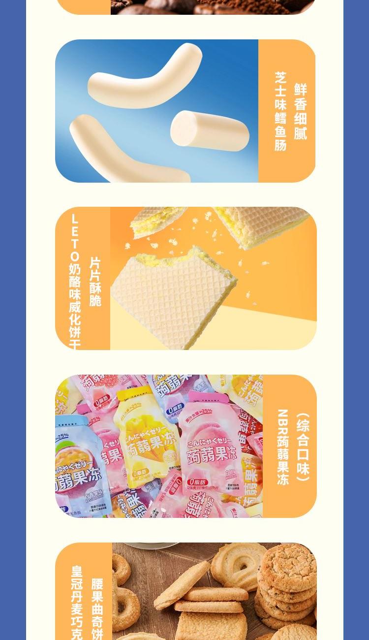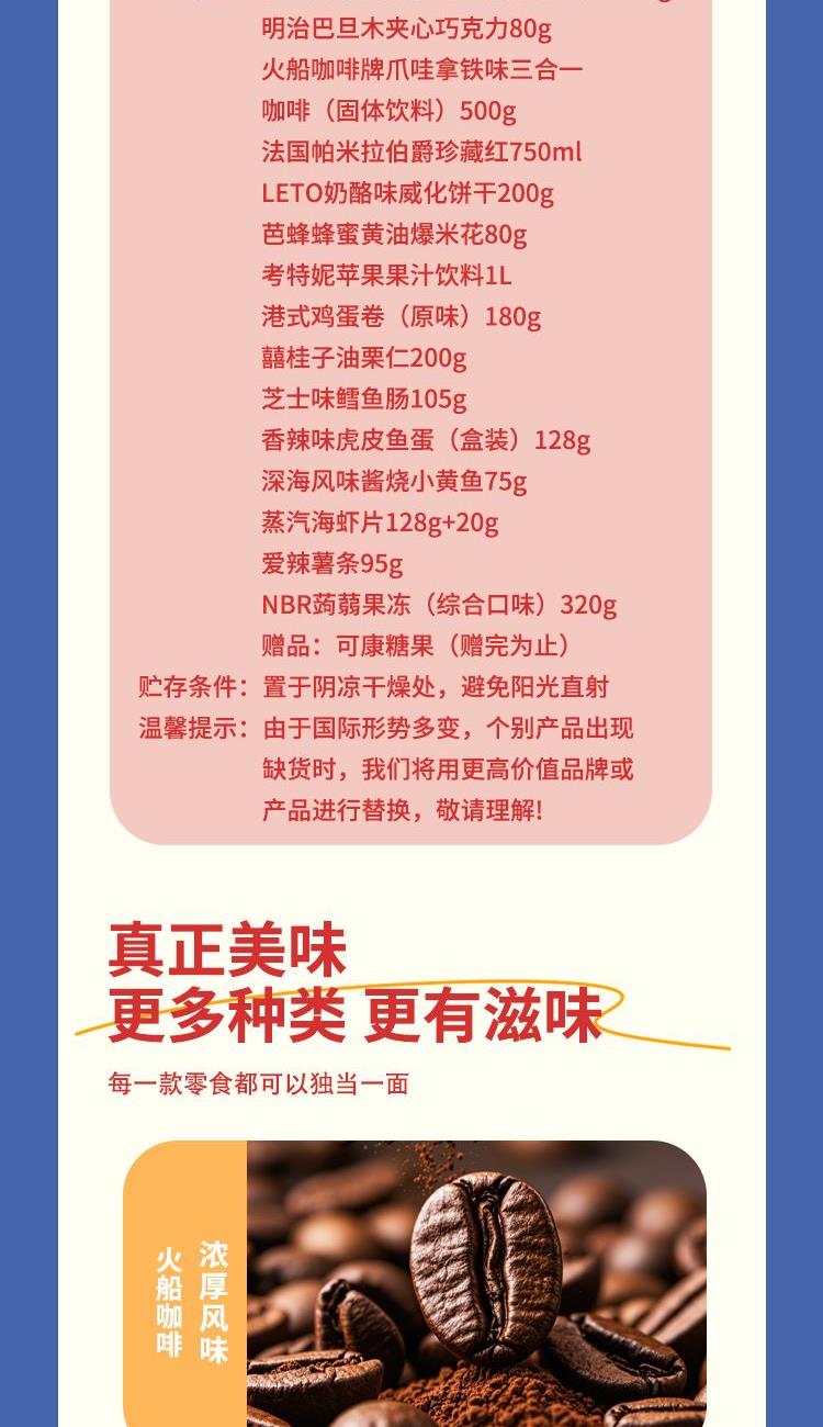 配置: 皇冠丹麦巧克力味腰果曲奇饼干200g罐装 明治巴旦木夹心巧克力80g 火船咖啡牌爪哇拿铁味三合一咖啡(固体饮料)500g 法国帕米拉伯爵珍藏红750ml LETO奶酪味威化饼干200g 芭蜂蜂蜜黄油爆米花80g 考特妮苹果果汁饮料1L 港式鸡蛋卷(原味)180g 囍桂子油栗仁200g 芝士味鳕鱼肠105g 香辣味虎皮鱼蛋(盒装)128g 深海风味酱烧小黄鱼75g 蒸汽海虾片128g+20g 爱辣薯条95g NBR蒟蒻果冻(综合口味)320g 赠品:可康糖果