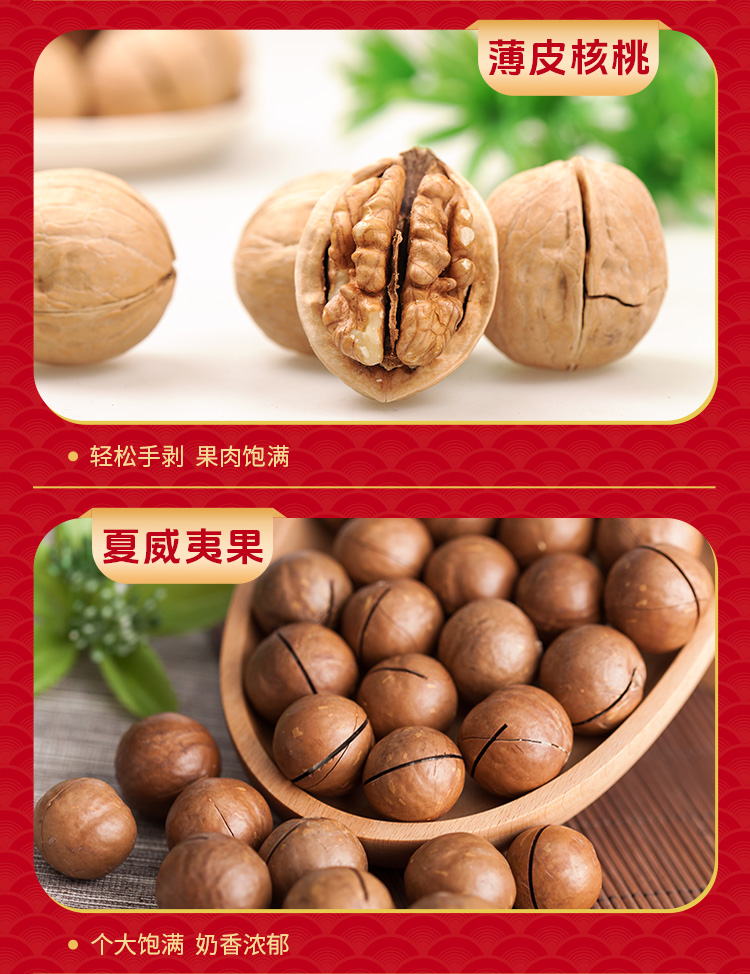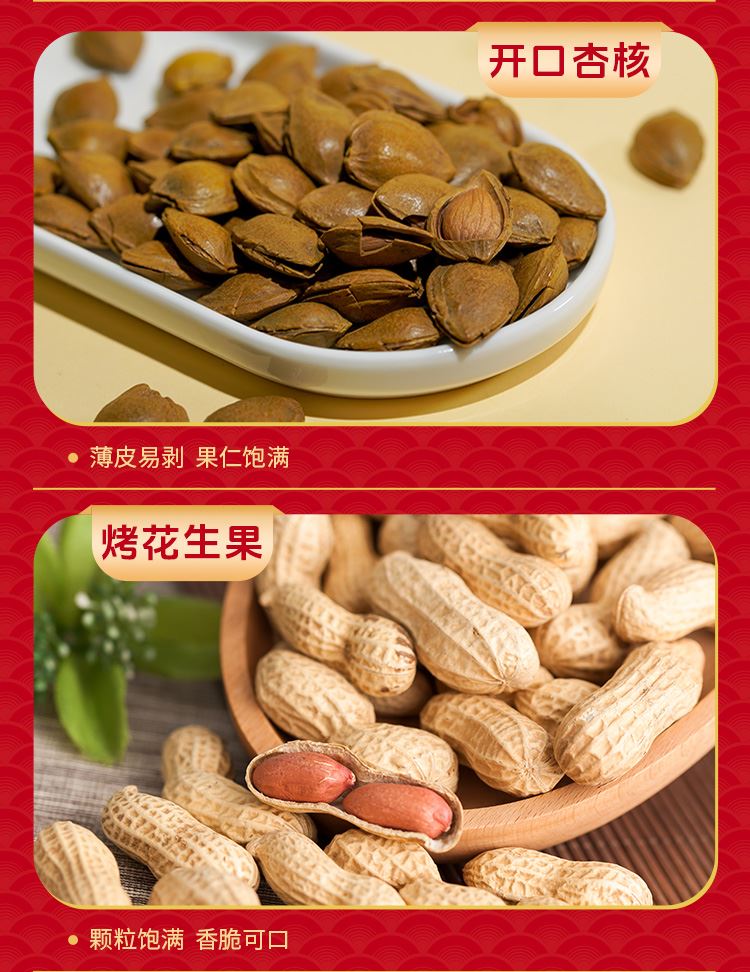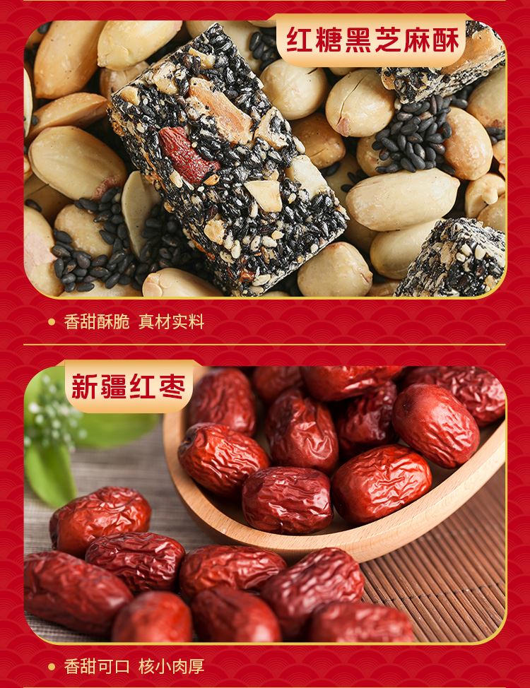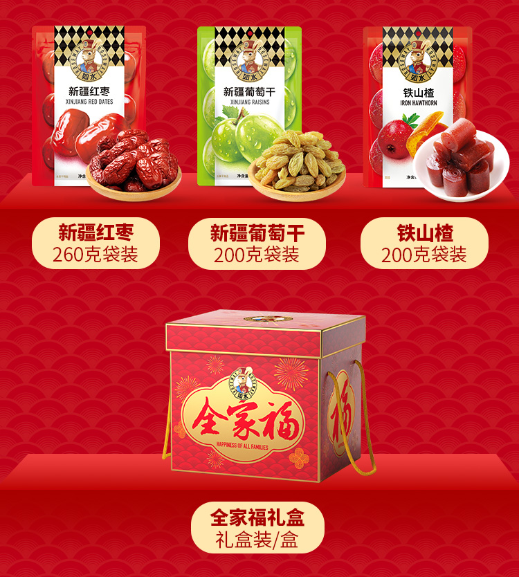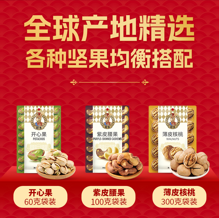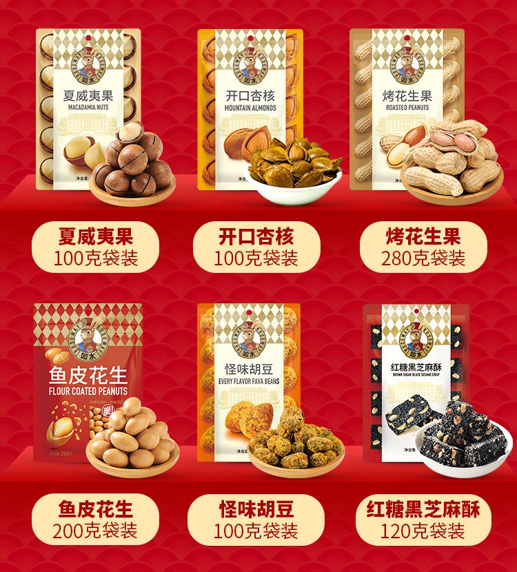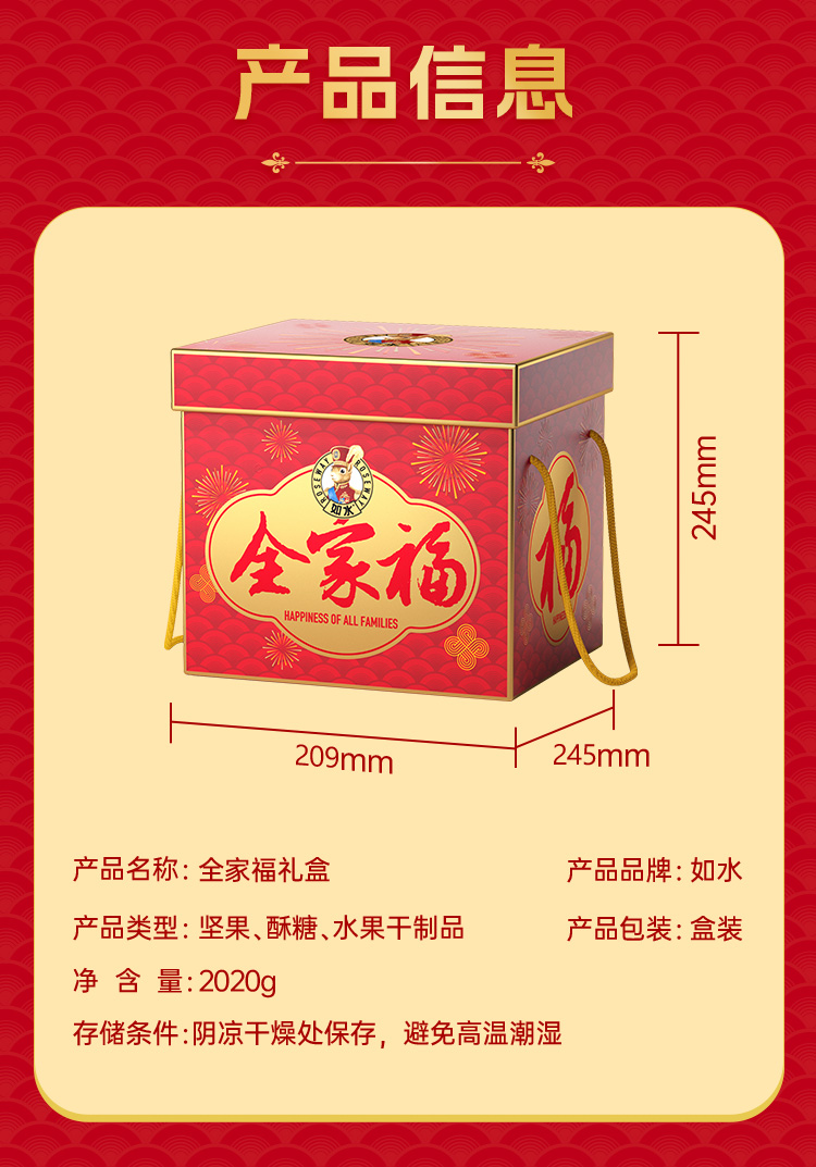 如水全家福礼盒 净含量:2020g 如水开心果60g 如水紫皮腰果100g 如水薄皮核桃300g 如水夏威夷果100g 如水开口杏核100g 如水烤花生果280g 如水鱼皮花生200g 如水怪味胡豆100g 如水红糖黑芝麻酥120g 如水新疆红枣260g 如水新疆葡萄干200g 如水铁山楂200g