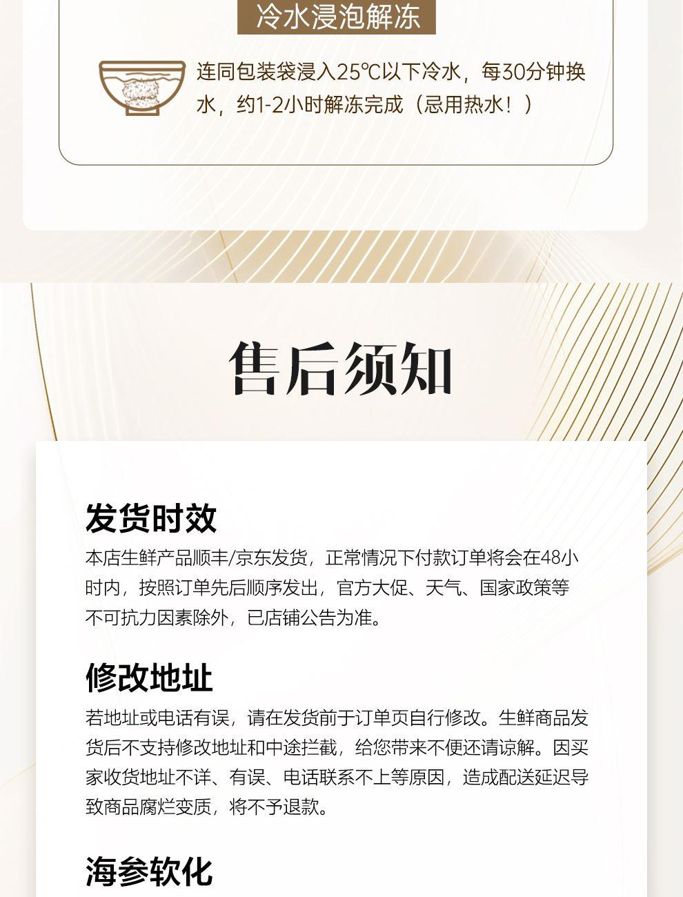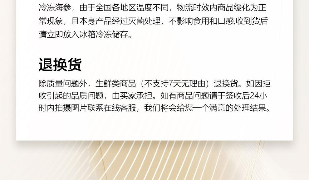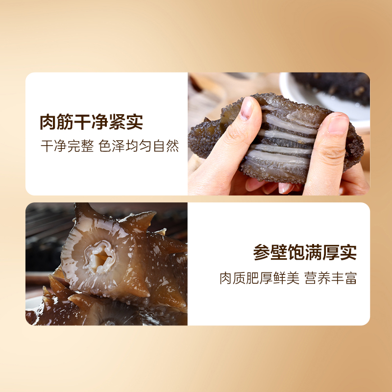 规格:大连即食海参1000克(约16-23头) 卖点: 京润堂大连即食海参选自黄金海域北纬39°的辽参,海域环境好,水质清洁、温度适宜,海参品质高。选取参龄5年以上的辽参,富含多种营养成分,如高蛋白含量,海参粘多糖, 维生素和多种微量元素,具有调节体质、抗疲劳、抗肿瘤等潜在功效。