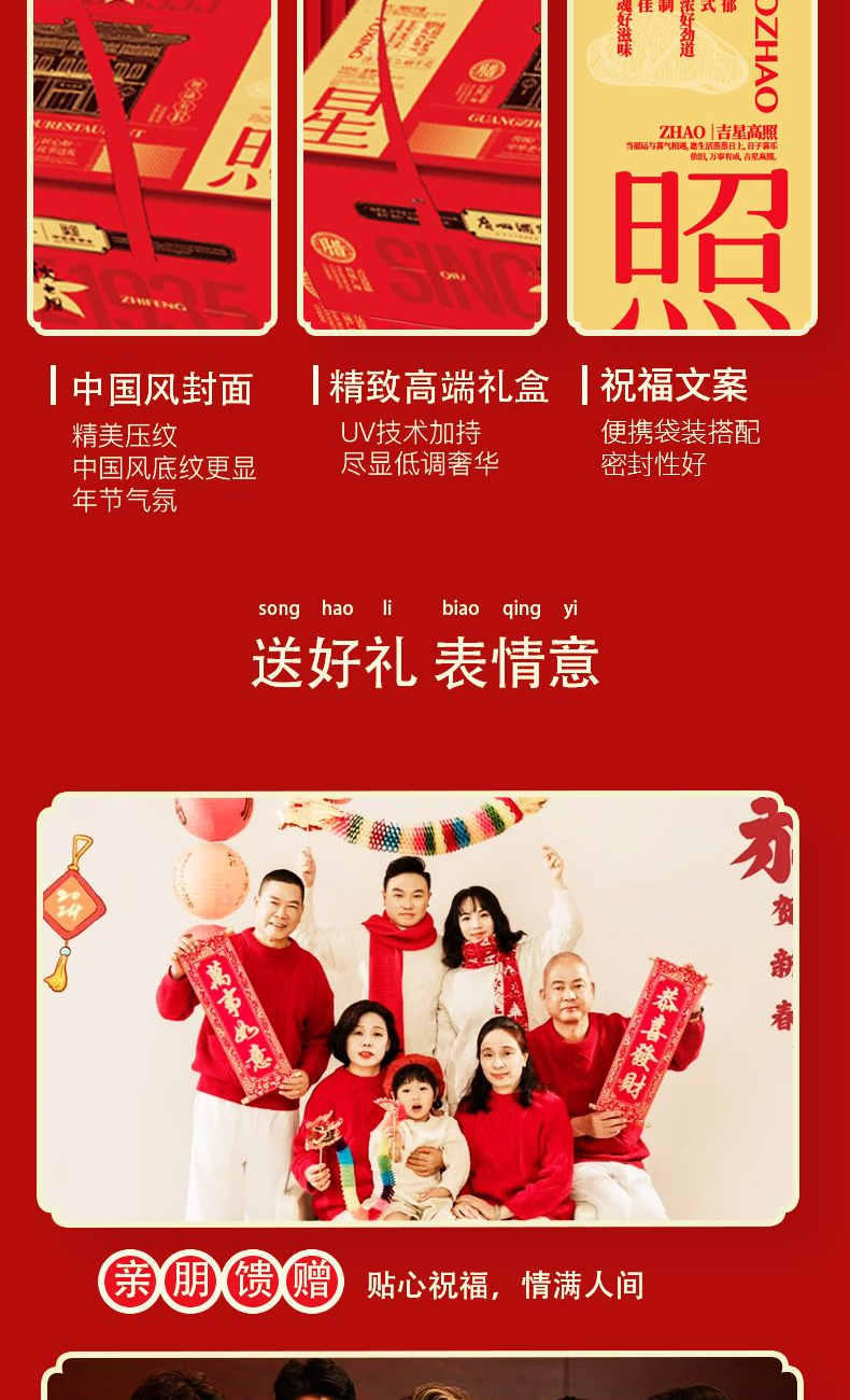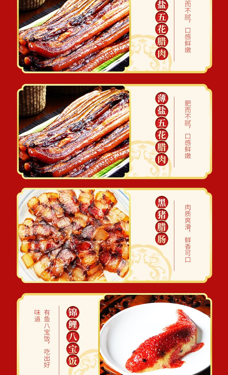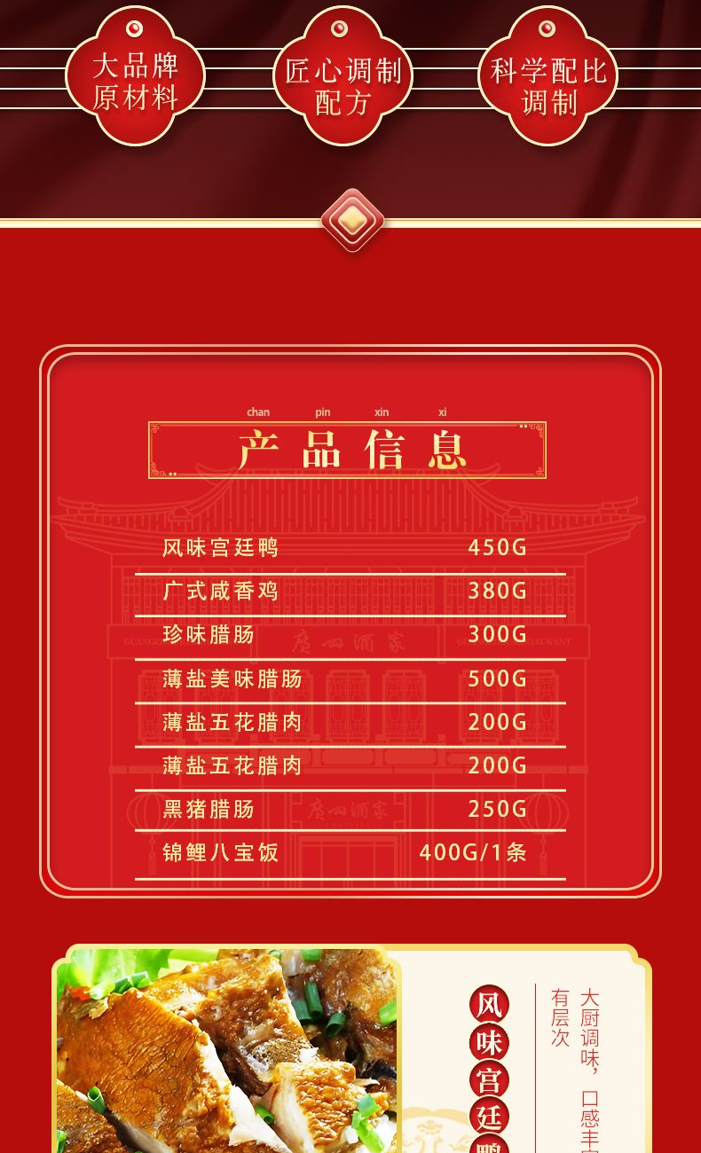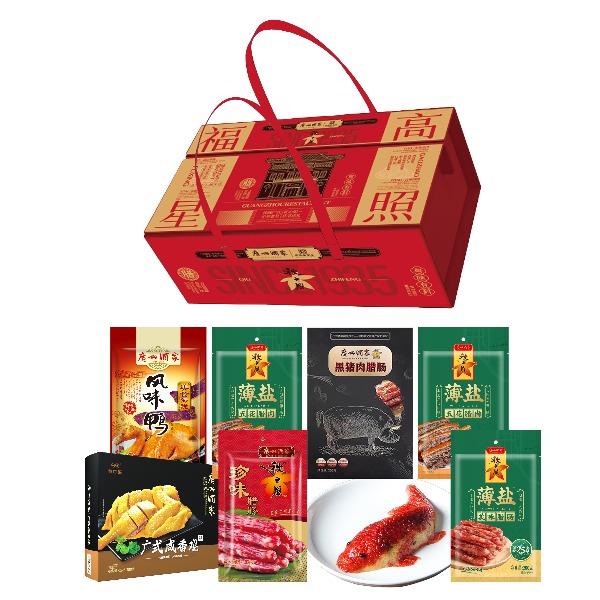 “食在广州” 承百年广府匠心,选上乘天然原料,遵古法生晒工艺 铸就一味甘香醇厚、寓意吉祥的岭南家宴至味 礼盒尺寸:35*22*15.5cm 内容物:珍味腊肠300g 广式咸香鸡380g 薄盐五花腊肉200g 薄盐五花腊肉200g 黑猪腊肠250g 风味宫廷鸭450g 薄盐美味腊肠500克 赠:嘉庆斋锦鲤八宝鱼