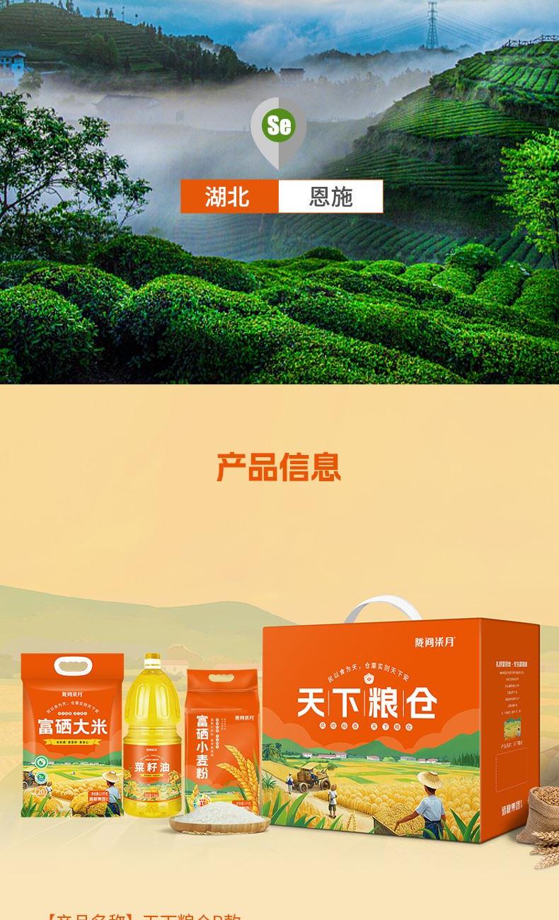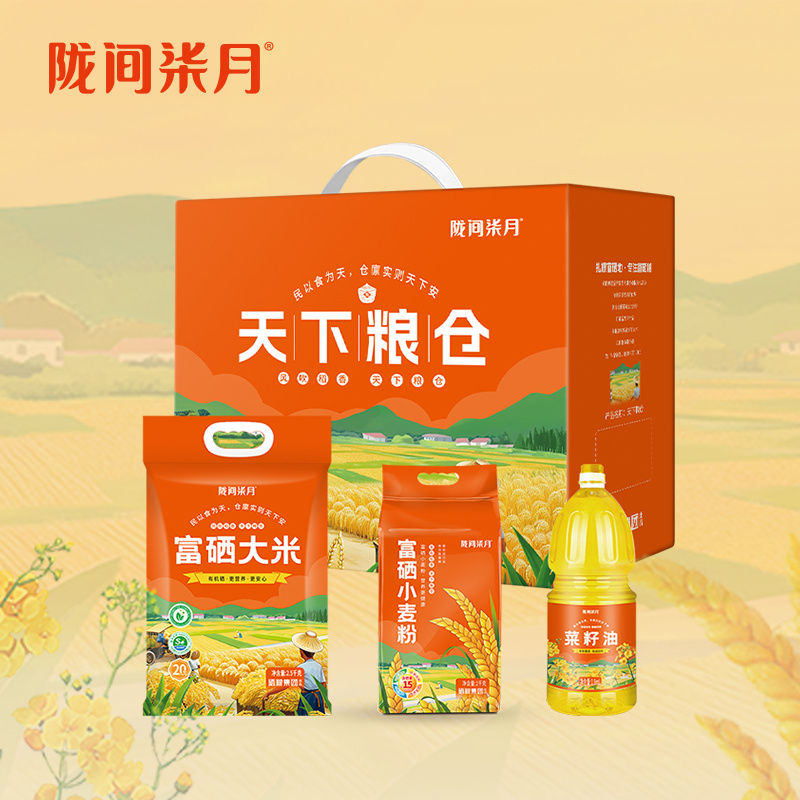 产品信息 品 名:天下粮仓B 规 格:富硒大米2.5kg、菜籽油1.8L, 富硒小麦粉1kg 包 装:长38cm宽17.5cm高30cm 产品特色 1、富有机硒认证,每100g平均硒含量≥20ug。 2、菜籽油油品透亮、香味浓郁,含有丰富的维生素E以及油酸、亚油酸、亚麻酸等; 3、富硒小麦粉,面粉自然白净,粉质细腻,筋度适中,延展性高,适合家庭面食制作:做饺子、面条、馒头、包子、烙饼、面包等 4、精美礼盒,送礼佳品。