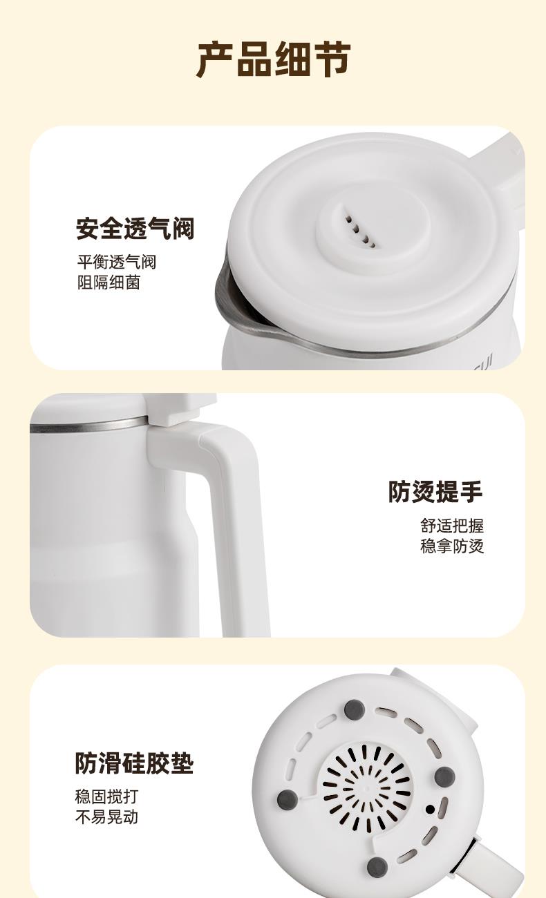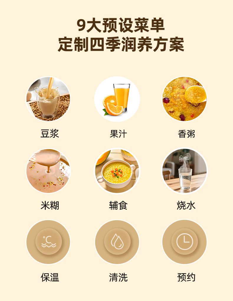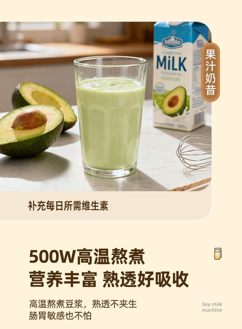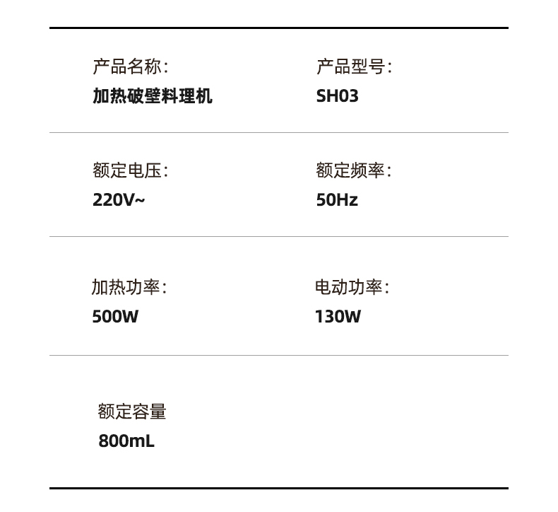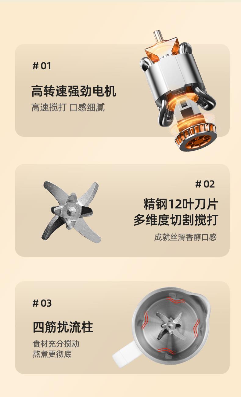 功率:500W 容量:800mL 304不锈钢内胆、干豆免泡直打 高温熬煮、细腻免滤无渣感 强劲破壁、触控大屏 低音降噪、高速强劲电机、精钢12叶刀片多维度切割搅打、四筋扰流柱 9大预设菜单、12小时智能预约、一键高温清洗 包装方式:彩盒+网购包装