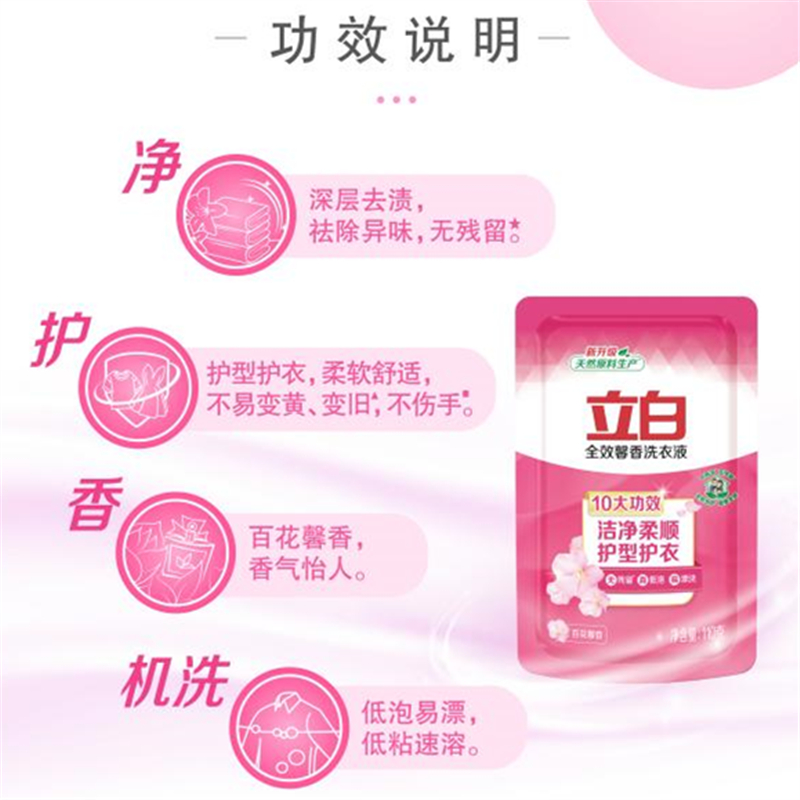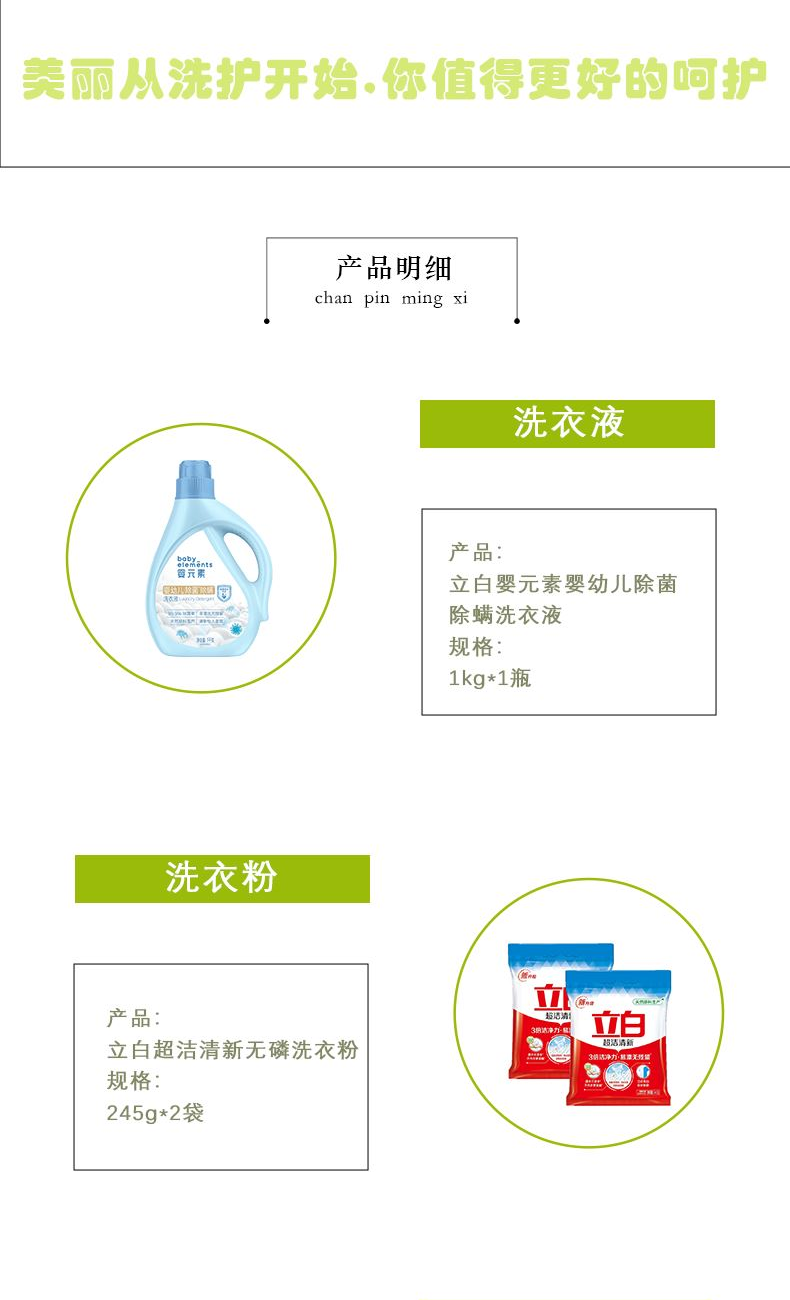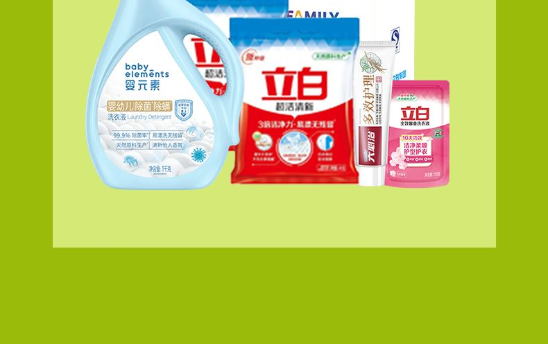 产品配置: 立白婴元素婴幼儿洗衣液1kg*1瓶 立白超洁清新无磷洗衣粉245g*2袋 六必治多效护理牙膏120g*1支 立白全效馨香洗衣液110g*1袋 产品卖点: 可选产品丰富多样,礼箱随心组合,多种价位因需而定,充分满足各种送礼需求,是商务送礼、单位福利的用心之选。