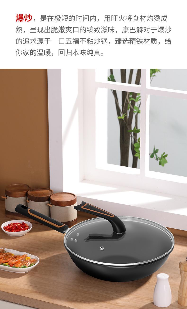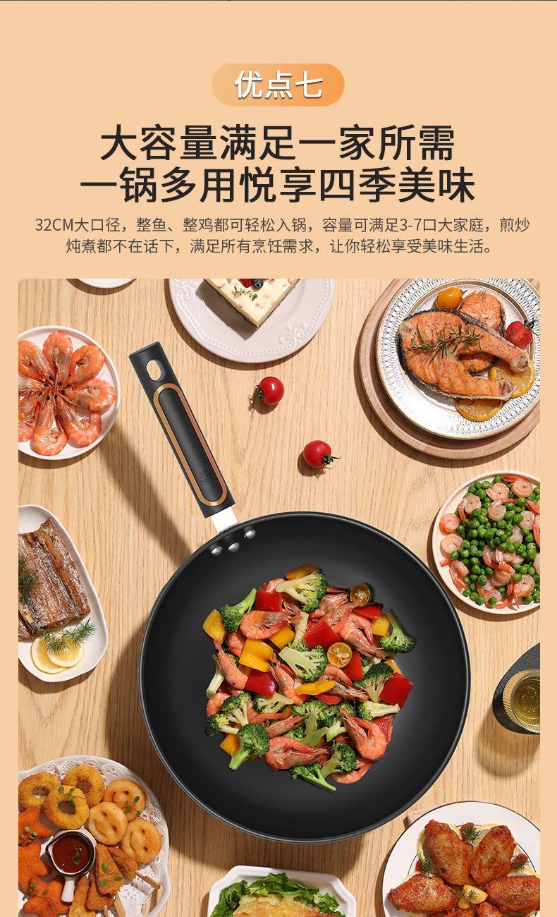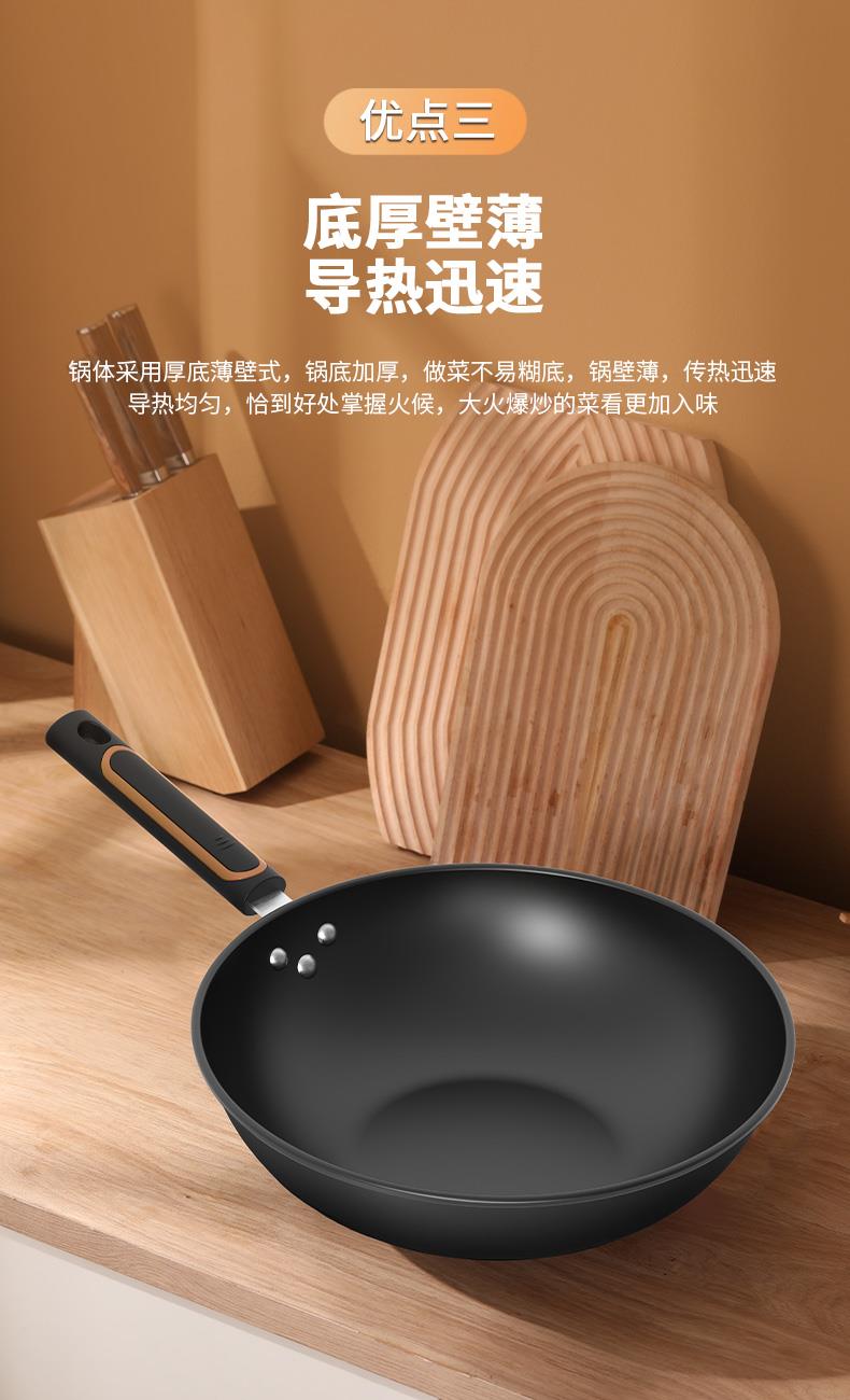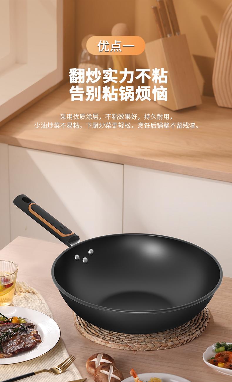 ◎翻炒不易粘,爆炒更随心。翻炒不易粘,在少油甚至是无油的条件下,都可以达到不易粘的效果,轻松翻面,爆炒随心,让烹饪更简单。
