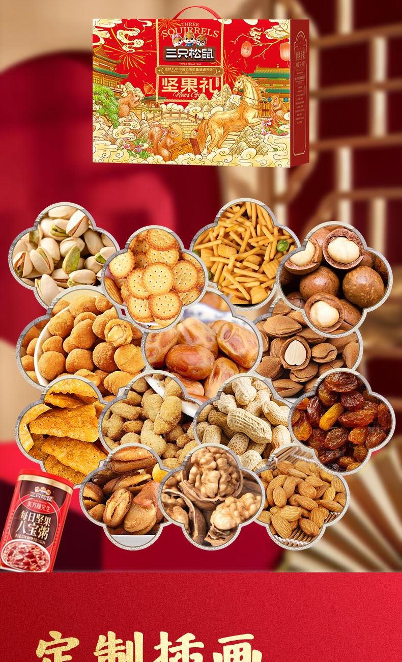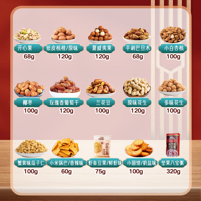 内容物:开心果/68g 纸皮核桃/原味/120g 夏威夷果/120g 手剥巴旦木/68g 小白杏核/100g 椰枣/100g 玫瑰红葡萄干/120g 兰花豆/100g 蒜香味花生/120g 多味花生/100g 蟹黄味瓜子仁/100g 小米锅巴/香辣味/60g 虾条豆果/鲜虾味/75g 小圆饼/奶盐味/100g 坚果八宝粥/320g 礼盒尺寸:41*29*18cm 品类丰富,产品便携包装 购物不止于下单,服务长期保持 性价比极高,各价位都有,满足不同选择