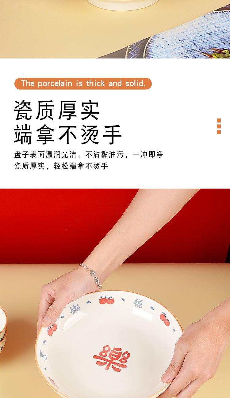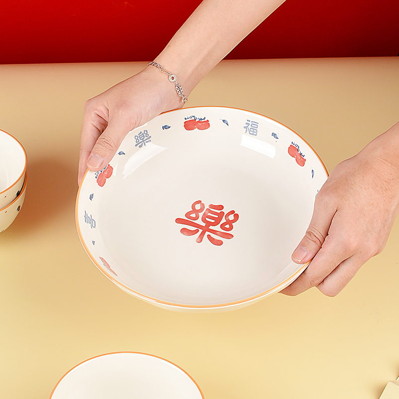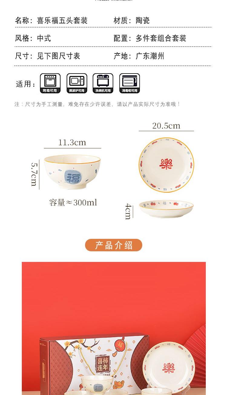 产品组成:整套=4碗+1盘+彩盒 产品材质:新骨瓷 产品规格:陶瓷碗=口径11.2cm,高度5.5cm;盘=口径20.5cm 彩盒尺寸:46.3*24*7.3cm 外箱毛重:27kg 外箱尺寸:63.5*47*50cm ------- ”生活美学搭子”。让每一天,每一刻都自带vibe, 把这套“喜乐福”餐具当礼物再合适不过。细腻瓷质摸得到的踏实,灵动花纹藏着“愿大家常享乐、常伴福”的期许。花纹里的“福”气看得见,用它装着家常菜,连饭菜都多了份温馨。 送长辈是孝心,送手足是心意,让每一次围坐用餐,都是“意满、乐足、福常在”的幸福滋味~轻松拿捏生活里的小确幸,让日子“city感”十足!幸福感直接拉满! 三餐烟火暖,四季皆安然。选意乐福陶瓷,喜乐常伴,福气满满。