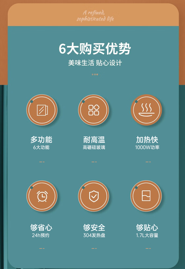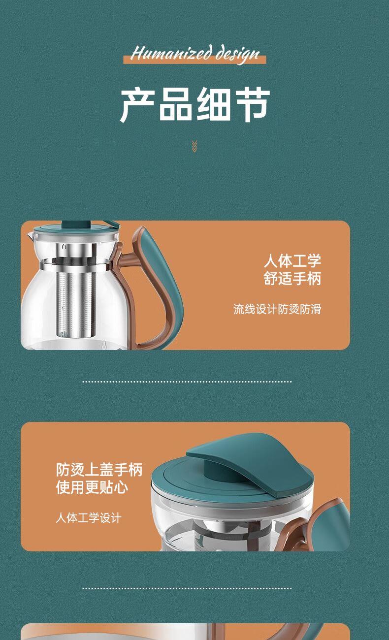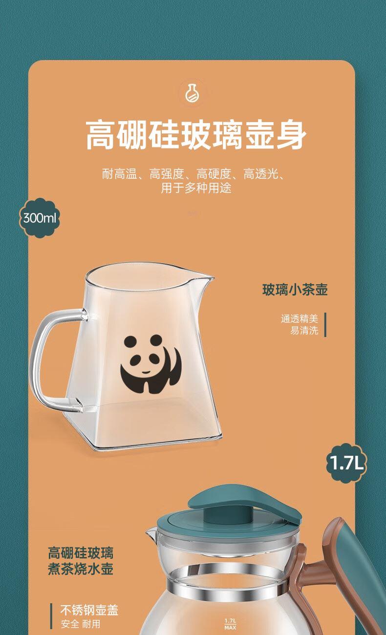 1.7L大容量,适合一家人使用,左边暖饮+右边烹煮 60秒智能提壶记忆,0.3L暖饮杯55°C恒温,入口温热刚刚好 1000W大功率,聚能发热304不锈钢发热盘,快速沸腾现煮现喝 304不锈钢滤网,茶水分离,高硼硅壶体可视耐高温,大口径壶口易清洗 缺水断电,安全防干烧 8大轻养功能,24小时预约/保温,3档固定温度+随心调温(35-95°C) 智能触控玻璃面板,轻音烹煮不打扰 花式茶饮,便捷养生,温热茶汤畅享