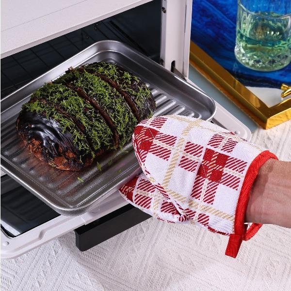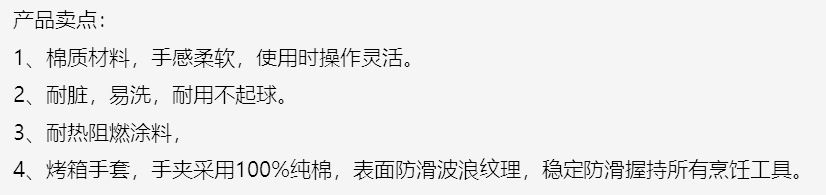 型号:Z-SD0510A 规格:手套*1,手夹*1,隔热垫*2,围裙*1 尺寸:手套:15*27CM,手夹:14*14CM,隔热垫:17*20CM,围裙 :70*90CM 颜色:红色 面料:涤纶 包装方式:袋子 产品卖点: 1、棉质材料,手感柔软,使用时操作灵活。 2、耐脏,易洗,耐用不起球。 3、耐热阻燃涂料, 4、烤箱手套,手夹采用纯棉,表面防滑波浪纹理,稳定防滑握持所有烹饪工具。