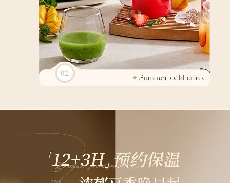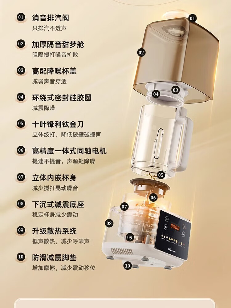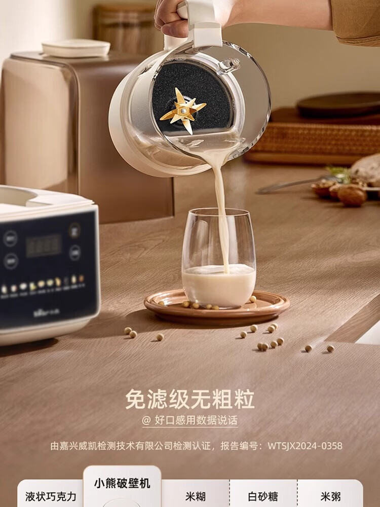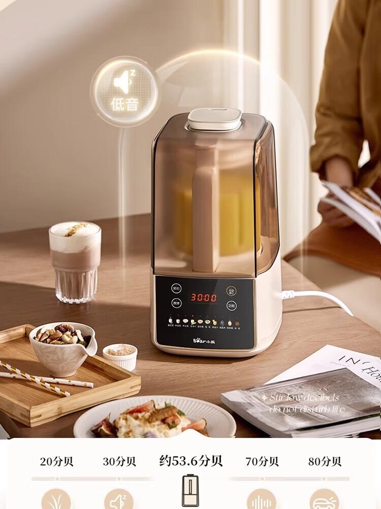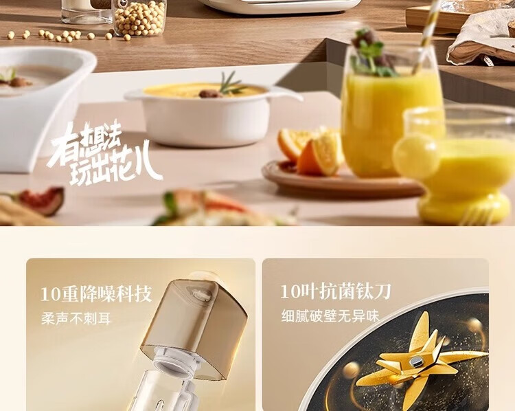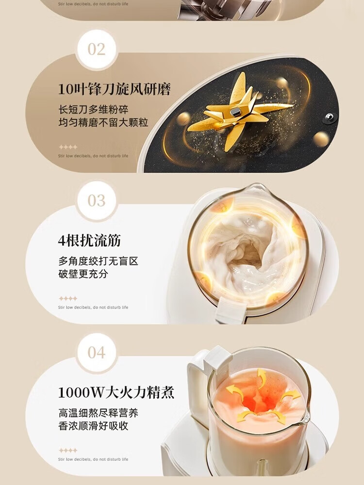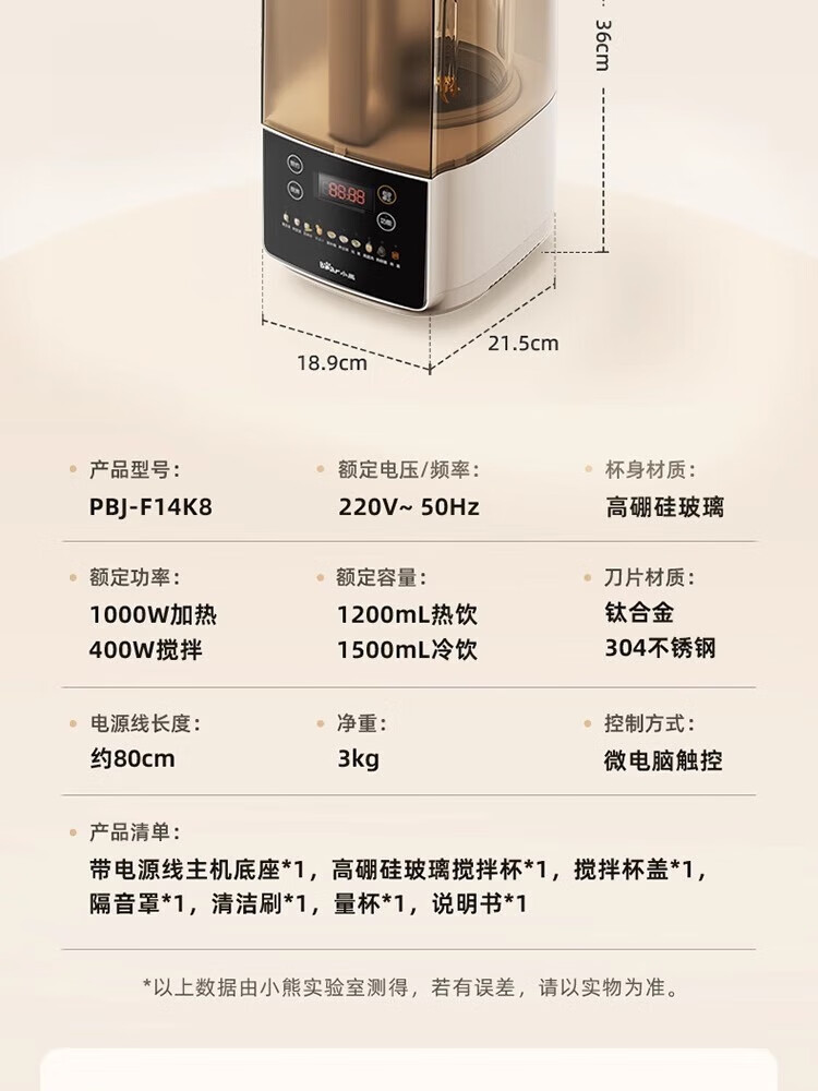参数: 容量 1.5L 额定功率 1000W 产品重量 3Kg 产品尺寸 417×230×394mm 箱数 1台/箱 卖点: 1、1.5L容量,10重降噪科技 2、防糊底盘,强劲破壁 3、1000W高温熬煮,10大预设菜单 4、12H预约3H保温 5、10叶风力钛金刀
