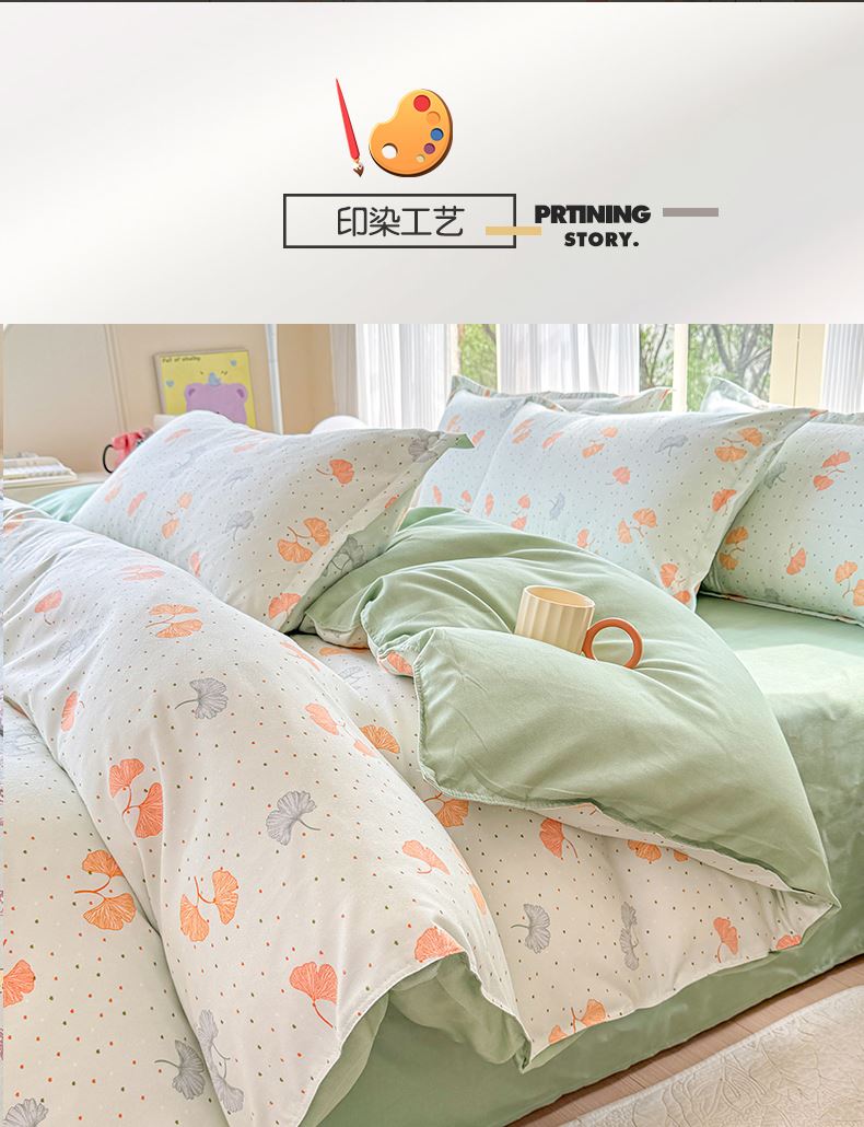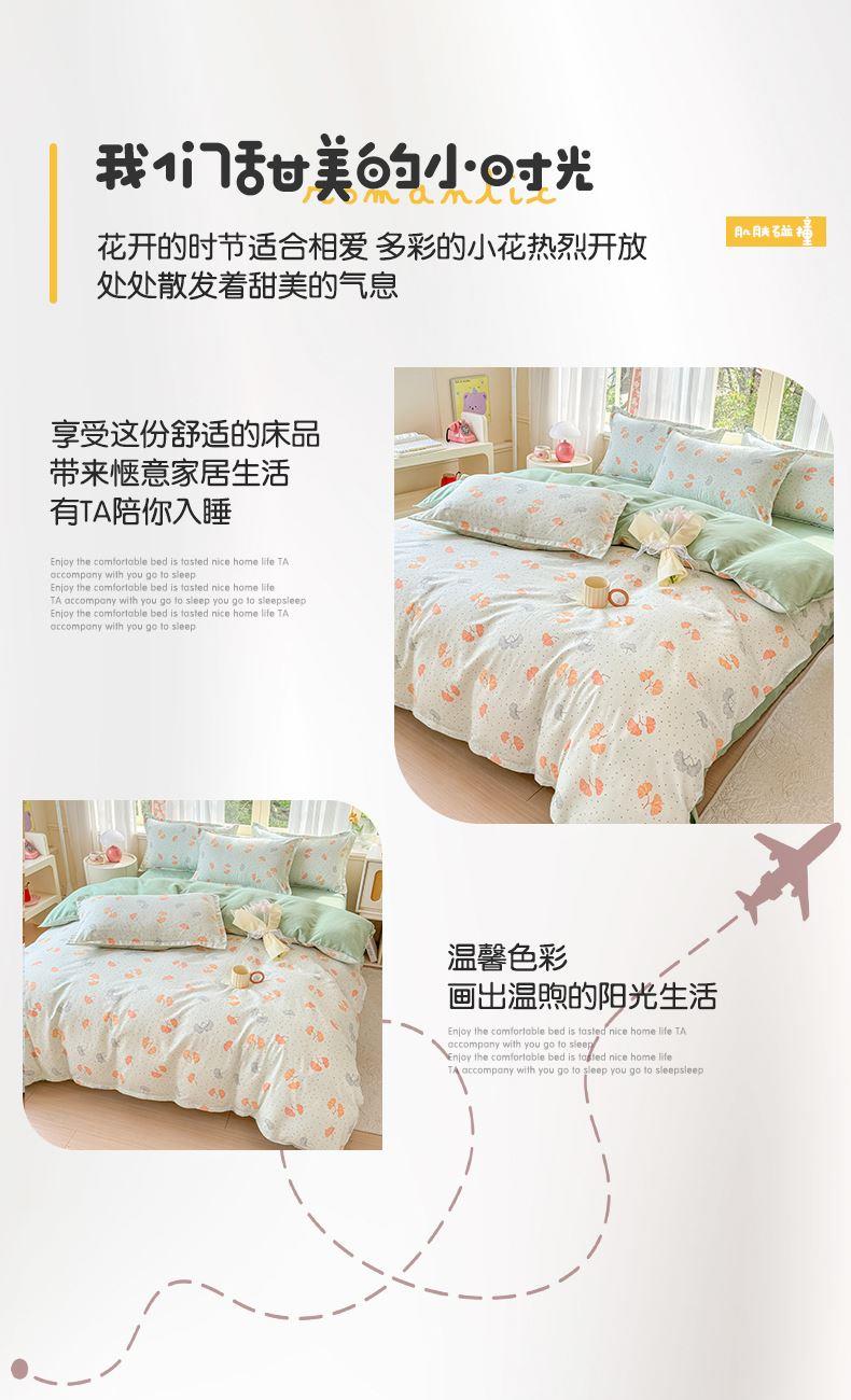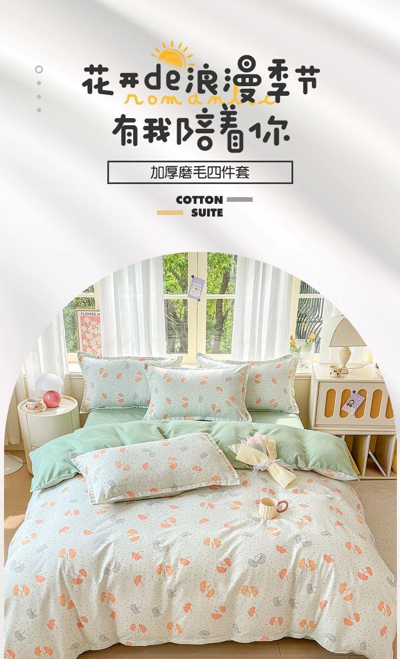 被套:200×230cm 床单:230×230cm 枕套:48×74cm 适用:1.5M-1.8M床 面料:磨绒(聚酯纤维) 印染工艺:环保印花 包装:精美手提盒 甄选柔肤棉面料,质地柔软 细腻,搭配时尙印花点缀柔和色彩的选择 手感舒适亲肤细腻 ,一起感受美好邂逅。