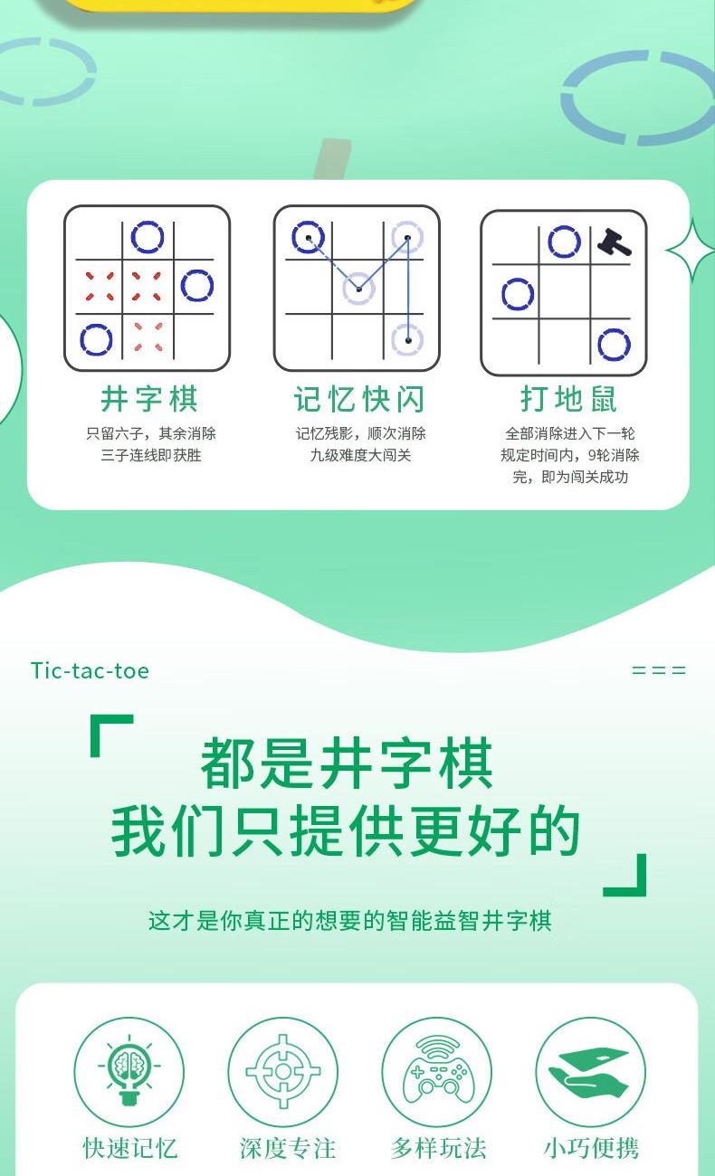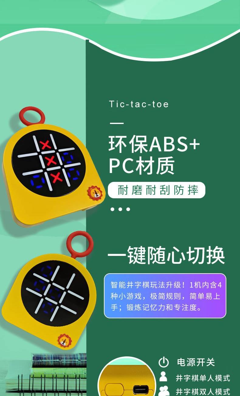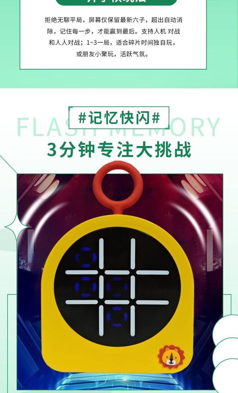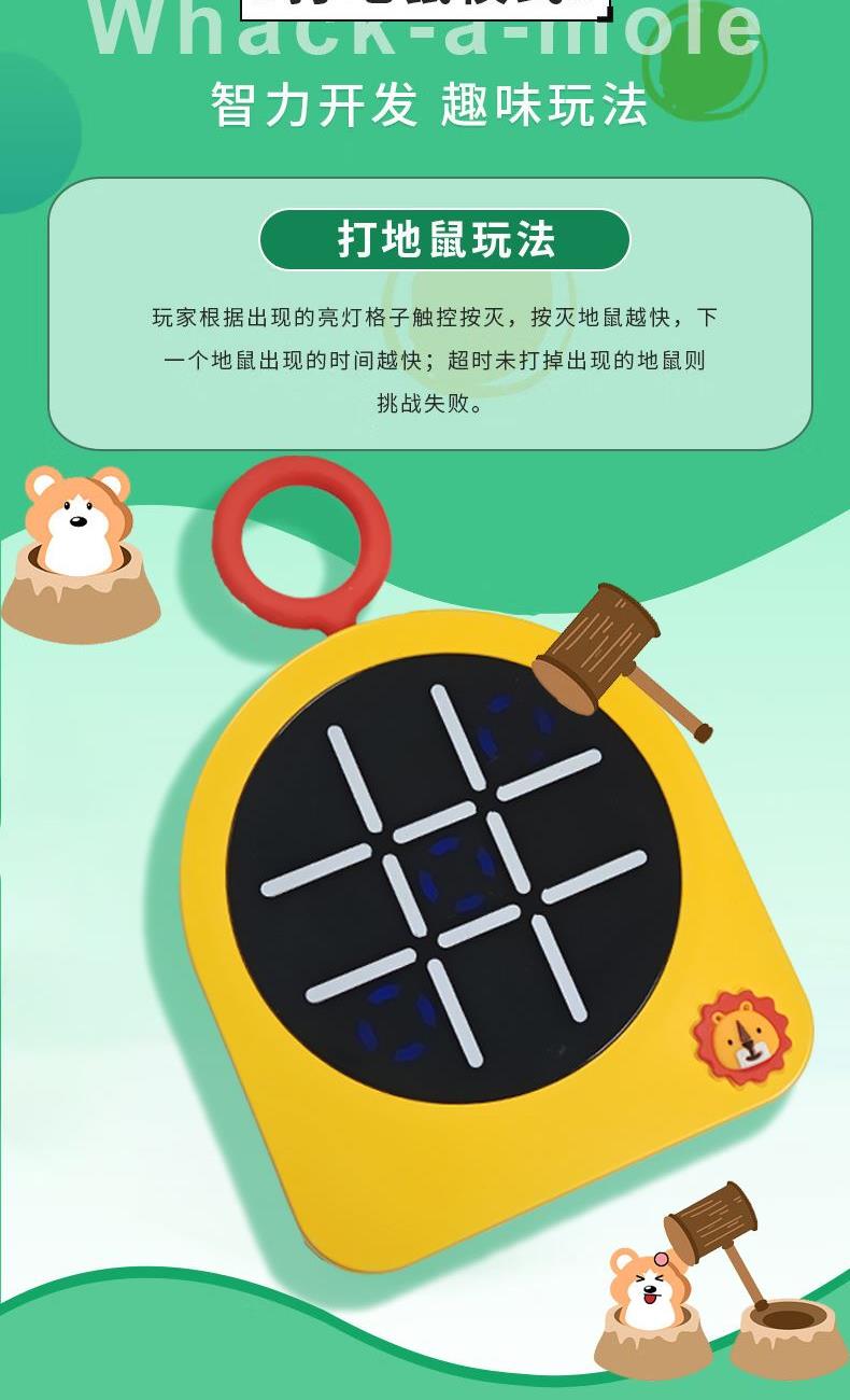 人机对战、双人对战、记忆快闪、打地鼠等趣味玩法 好友互动、亲子互动、人机互动娱乐 锻炼思维能力、记忆能力,提升专注度 内置电池,小巧便携