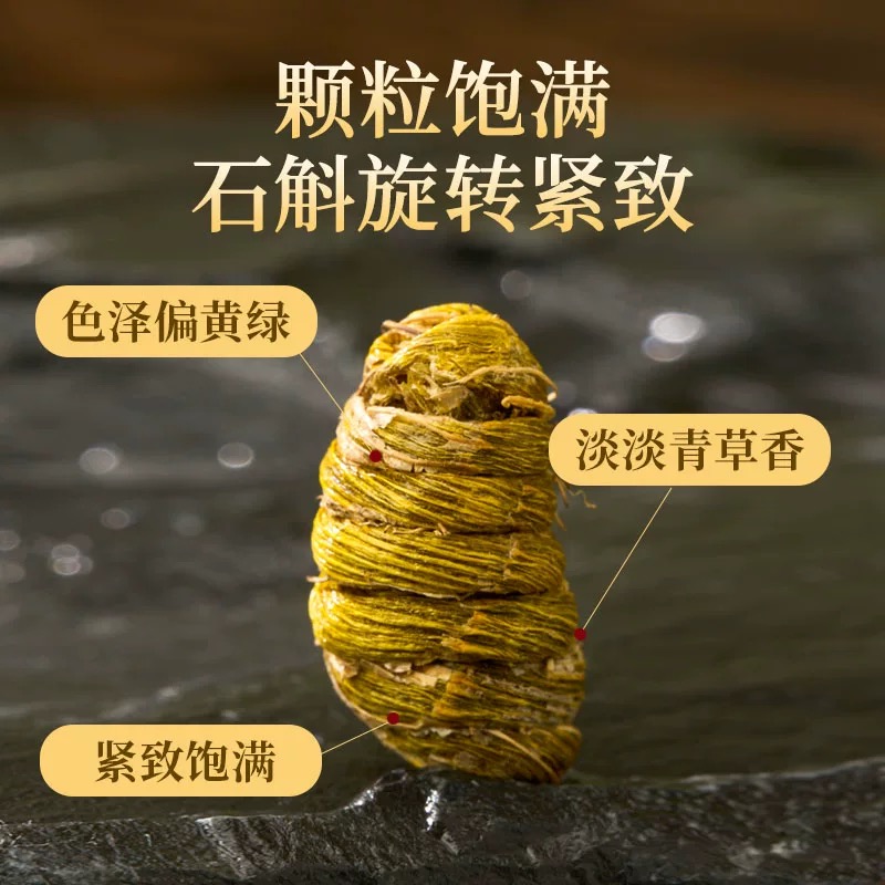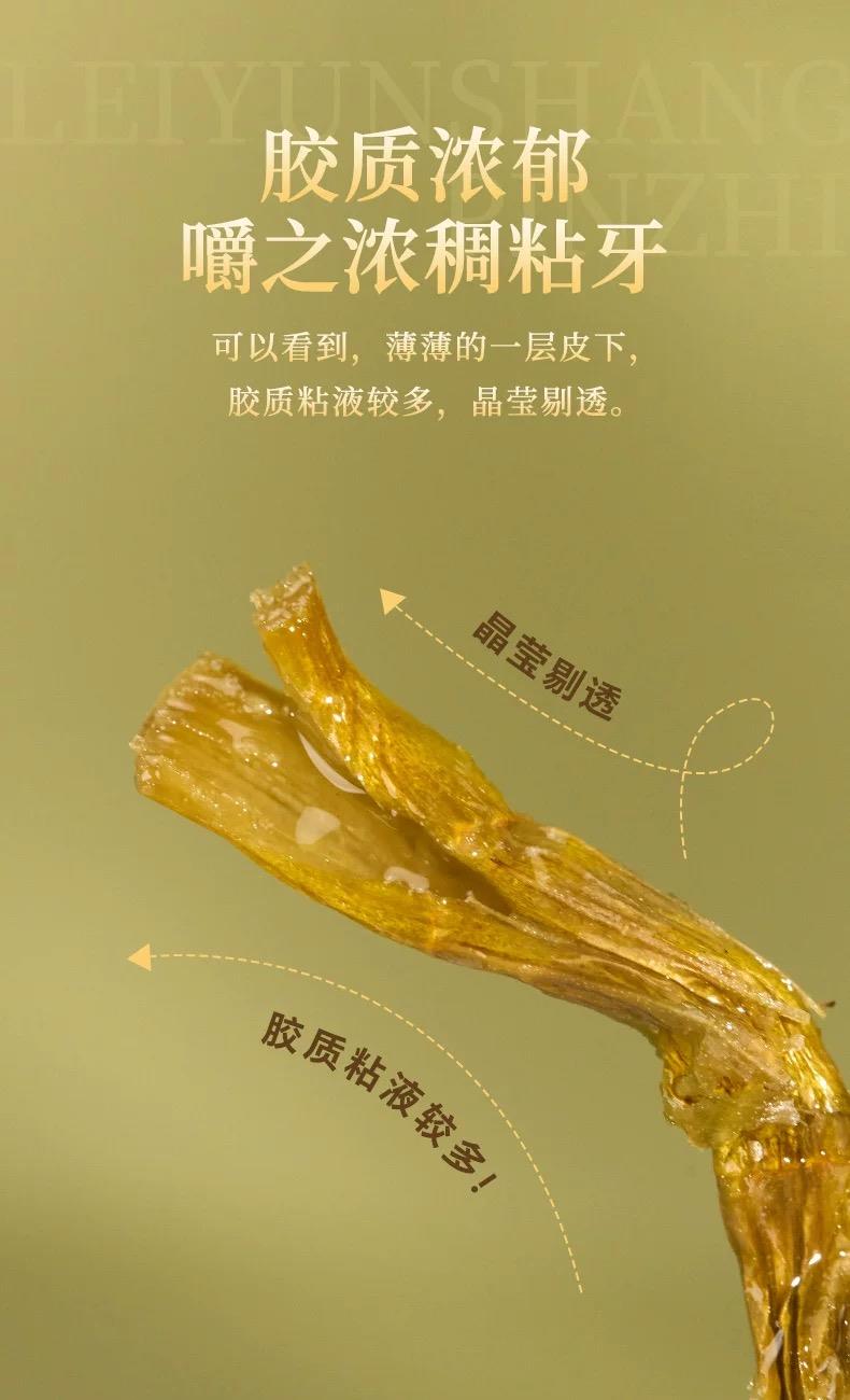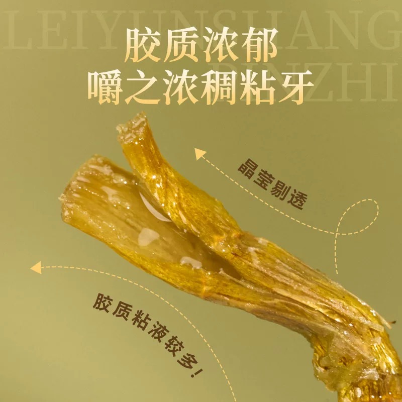 品优量少、纹理清晰可见、颗粒饱满、石解旋转紧致、胶质浓郁、嚼之浓稠粘牙