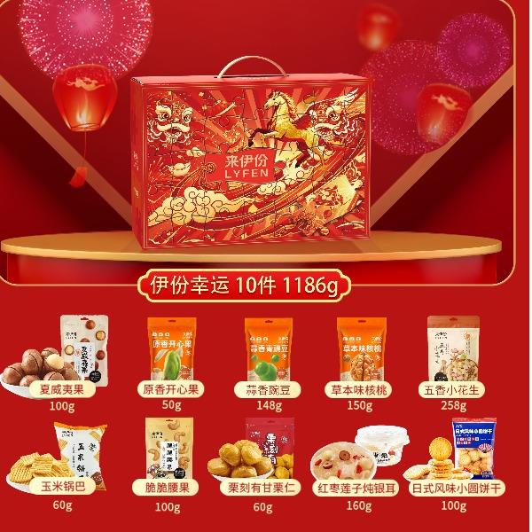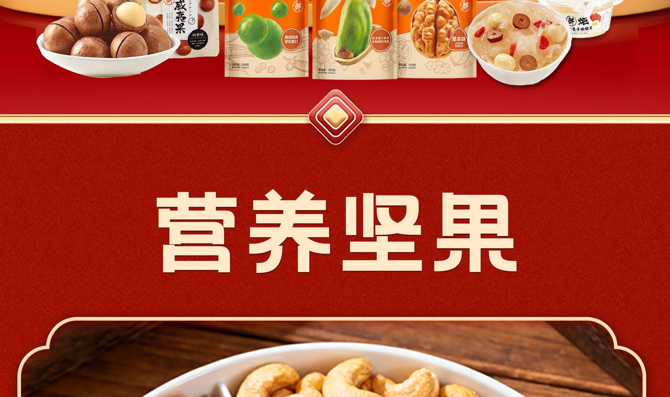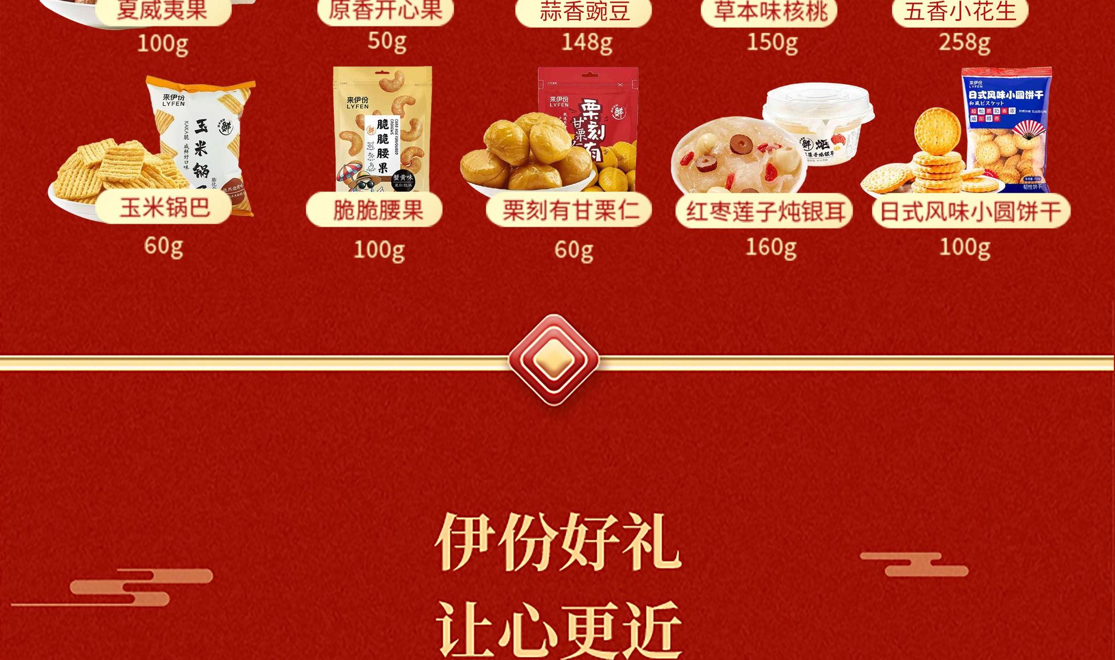 来伊份作为上市企业 产品线非常丰富,强调“新鲜”零食作为保障 产品设计贴心,方便携带 礼盒 尺寸:370*150*270mm 内容物:原香开心果50g 草本味核桃150g 夏威夷果100g 脆脆腰果100g(蟹黄味) 栗刻有甘栗仁60g 五香小花生258g 蒜香青豆148g 日式风味小圆饼干(奶盐味)100g 玉米锅巴(孜然烧烤味) 60g 红枣莲子炖银耳160g