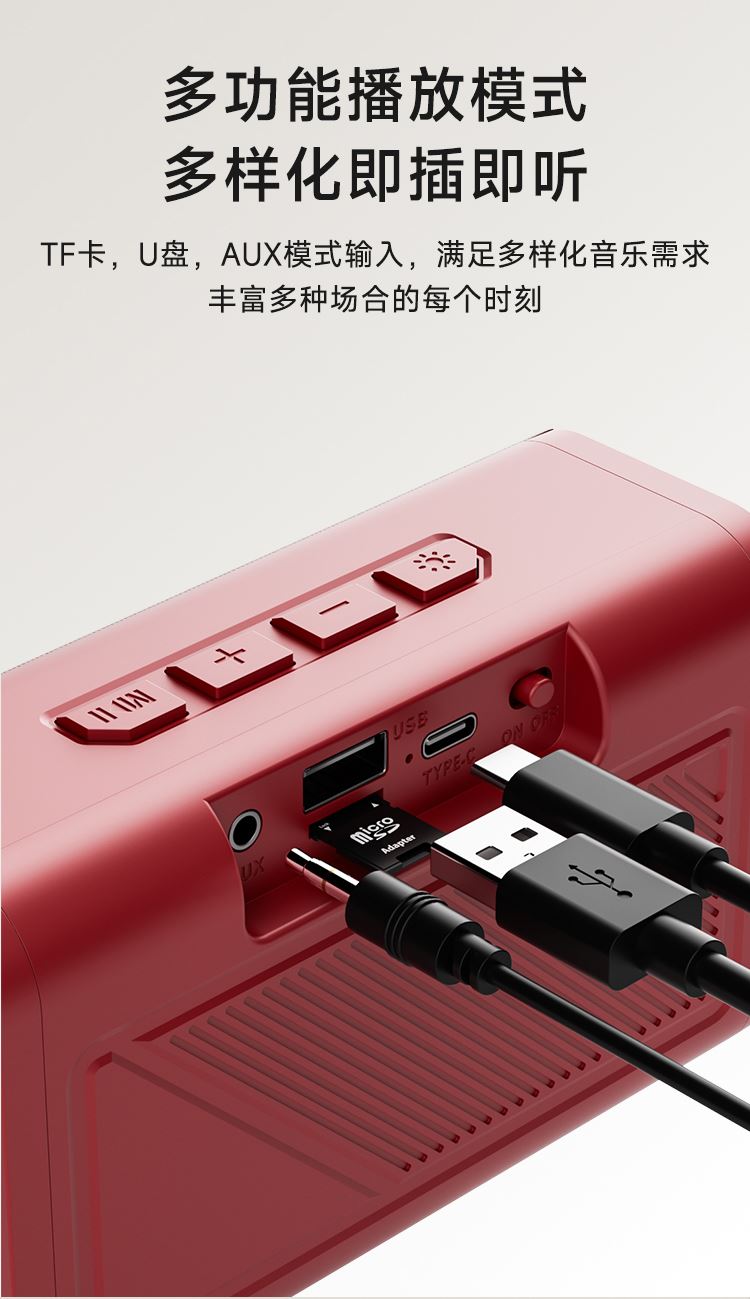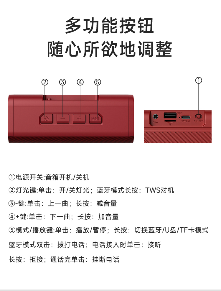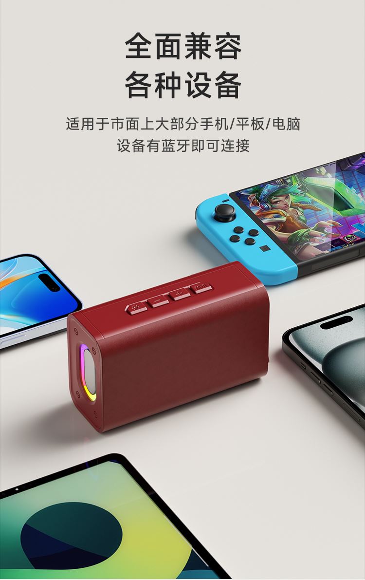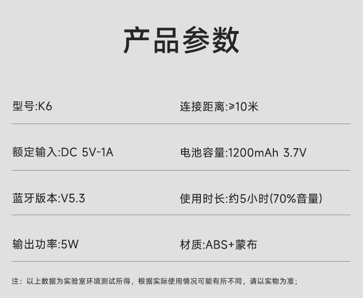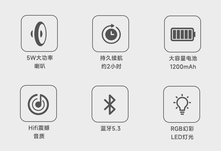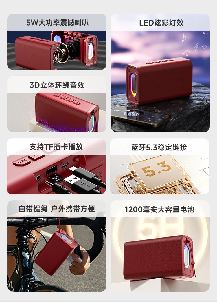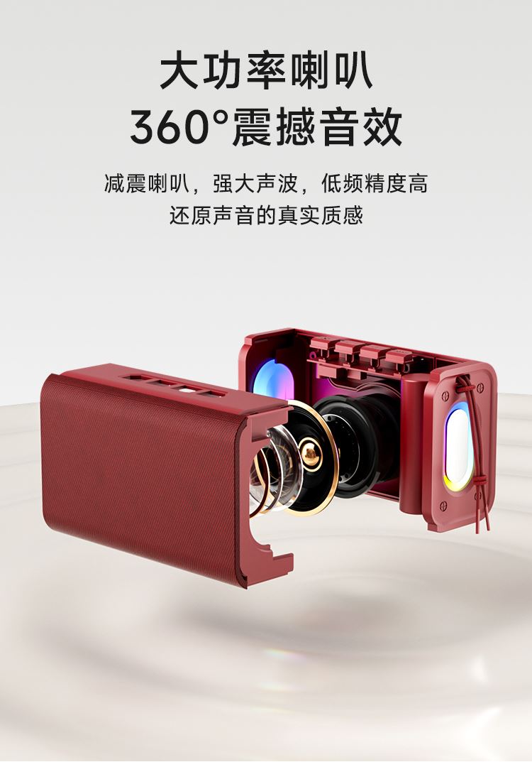 额定输入:DC 5V-1A 蓝牙版本:V5.3 输出功率:5W 连接距离:≥10米 电池容量:1200mAh 3.7V 播放时长:约5小时 材质:ABS+蒙布 大功率喇叭、360°震撼音效、减震喇叭,强大声波,低频精度高,还原声音的真实质感 预设彩色LED灯光效果,散发出时尚气息,满满的气氛感,视觉与听觉的双重享受 蓝牙传输稳定,声音清晰与控制同步,稳定流畅 1200mAh锂电池、大容量持久续航、向电量焦虑说再见,使用时长约5个小时,音乐停不下来