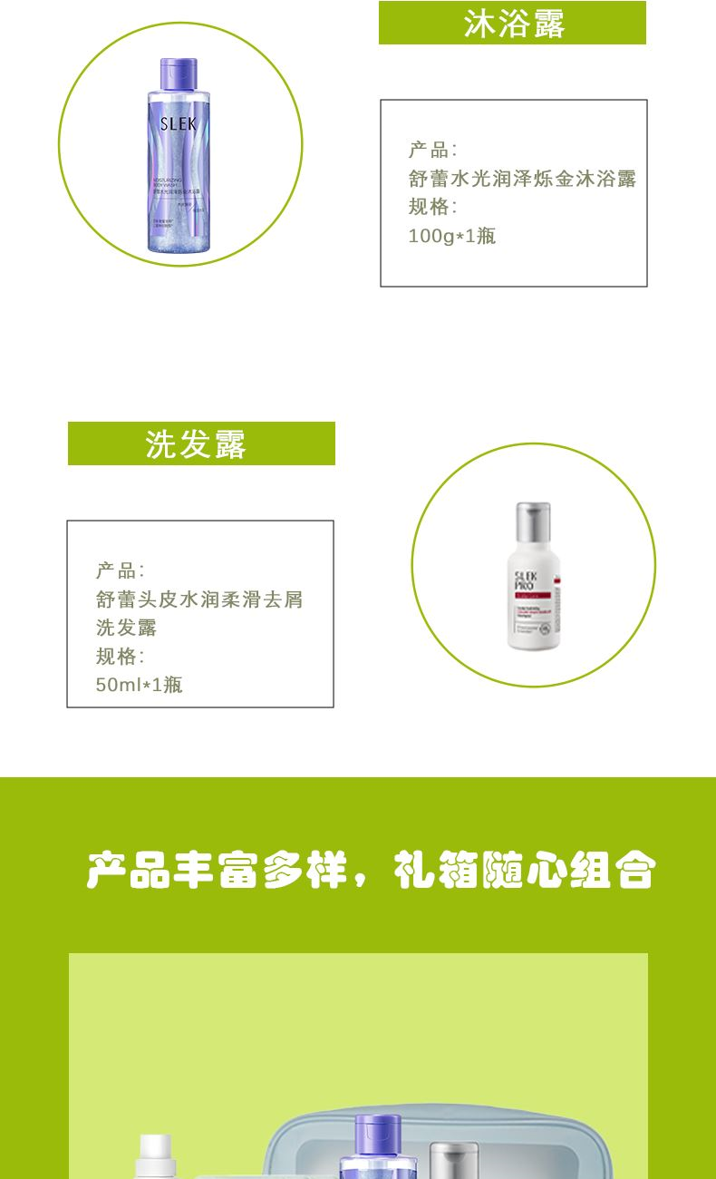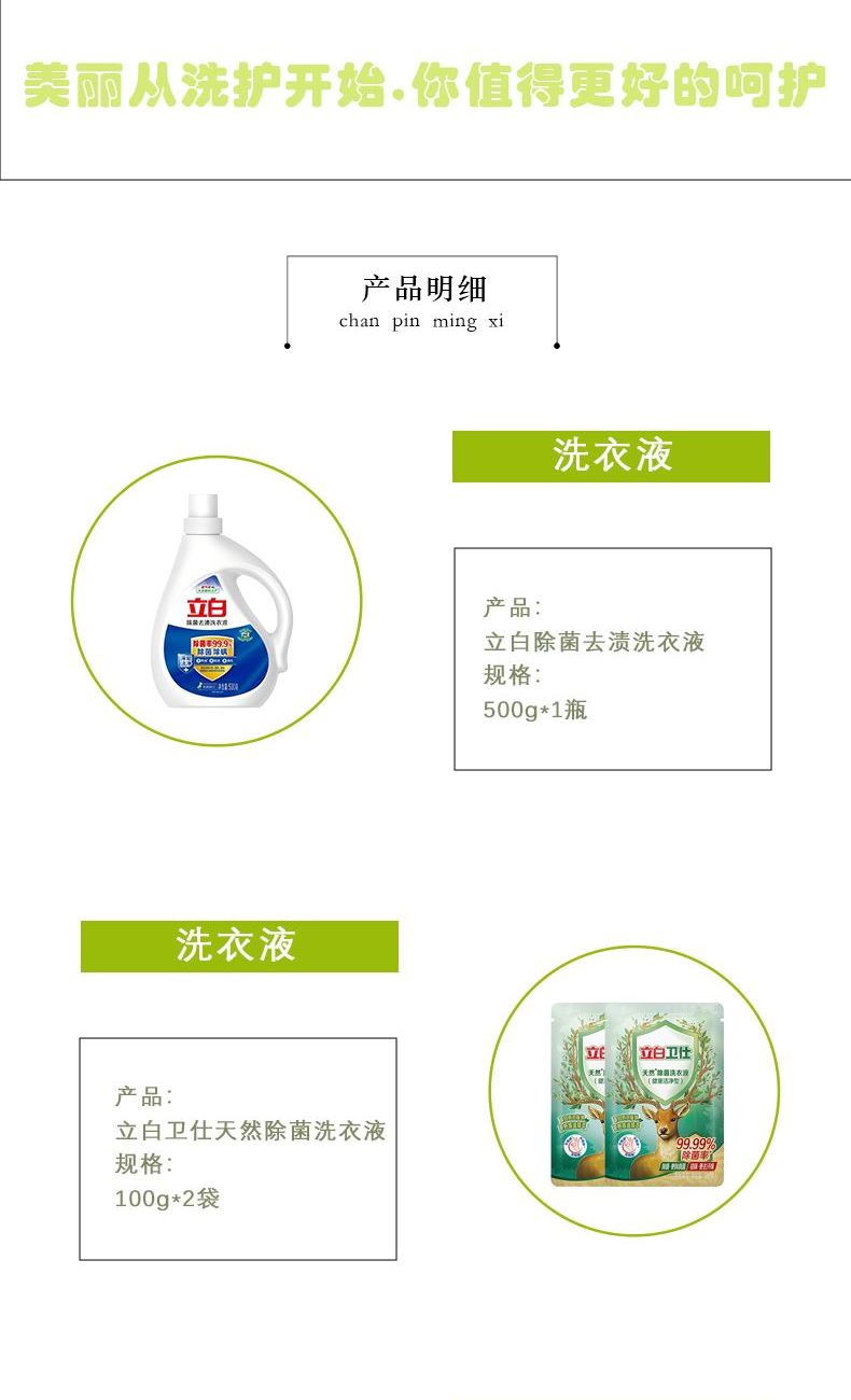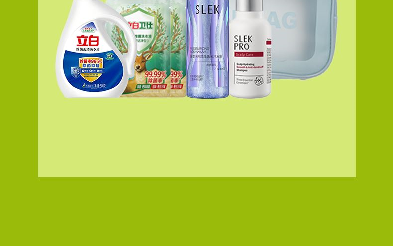 配置: 立白去渍洗衣液500g*1瓶 立白卫仕天然洗衣液100g*2袋 舒蕾水光润泽烁金沐浴露100g*1瓶 舒蕾头皮水润柔滑去屑洗发露50ml*1瓶 卖点: 可选产品丰富多样,礼箱随心组合,多种价位因需而定,充分满足各种送礼需求,是商务送礼、单位福利的用心之选。