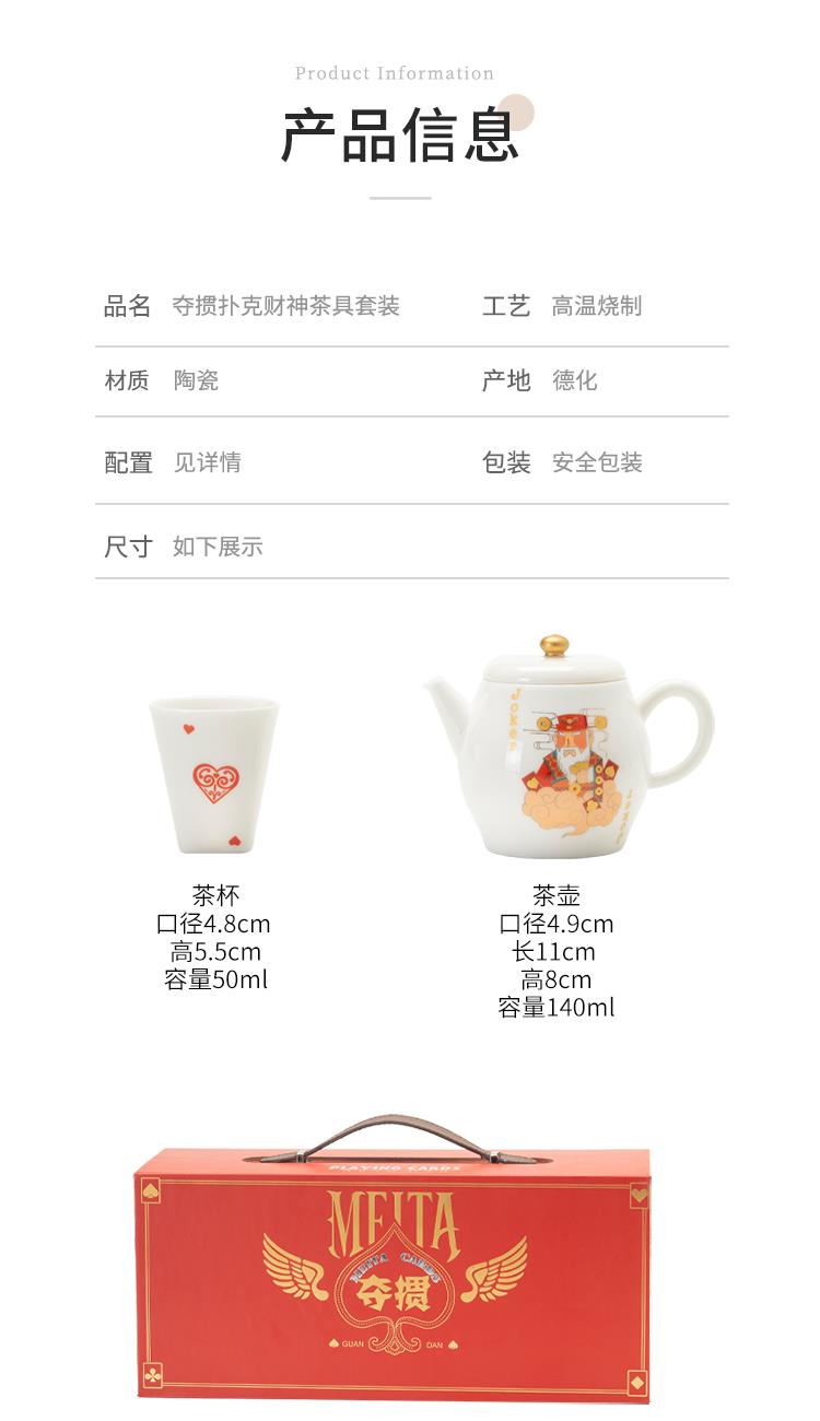 配置:品茗杯*4 壶*1 吸水茶盘*1 养生茶*2 扑克牌*2 礼盒*1 养生茶成分:西洋参、党参、黄芪、麦冬 材质:羊脂玉瓷 礼盒尺寸:36cm*14cm*16cm 产品尺寸: 品茗杯 4.8cm*5.5cm 容量50ml 壶5cm*11cm 容量140ml 养生茶:5.4cm*4.1cm 容量8g 扑克牌2副