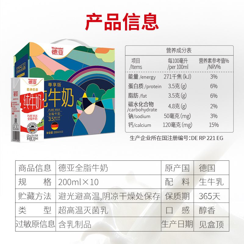 德亚优选全脂牛奶200ml*10礼盒(尊享版) 规格200mlx10 原产国:德国 配 料:生牛乳 保质期:365天