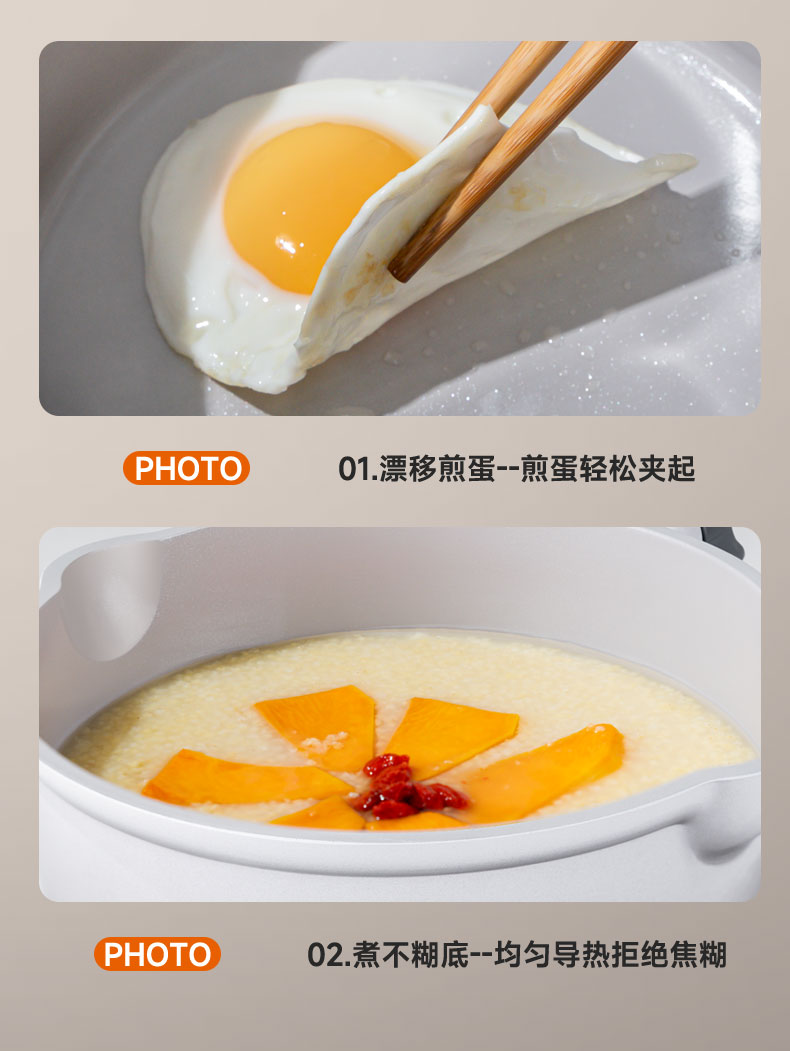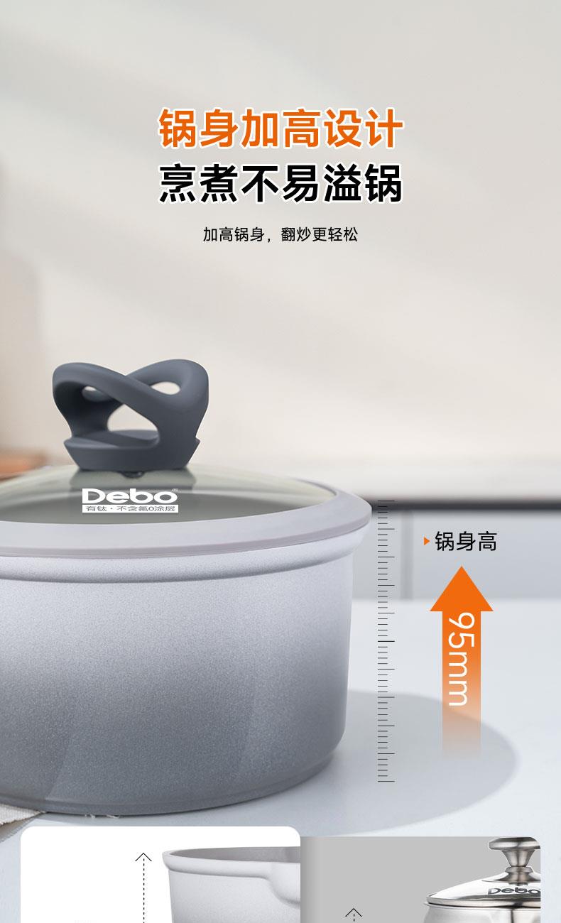 型号:DEP-980 口径:18cm 容量:2.2L 材质:铝合金 包装尺寸:430*130*235mm 配置:锅身*1、玻璃盖*1 1. 内钛外陶双面不粘,无惧各种易粘食材; 2. 有钛更健康,保持食材原汁原味; 3. 锅身双侧导流口设计,倒汤利落不外洒, 左右都顺手; 4. 独特的顶珠设计,可放置铲子, 保持台面干净整洁; 5. 好锅不挑灶,加厚复合锅底,适用更多炉灶。