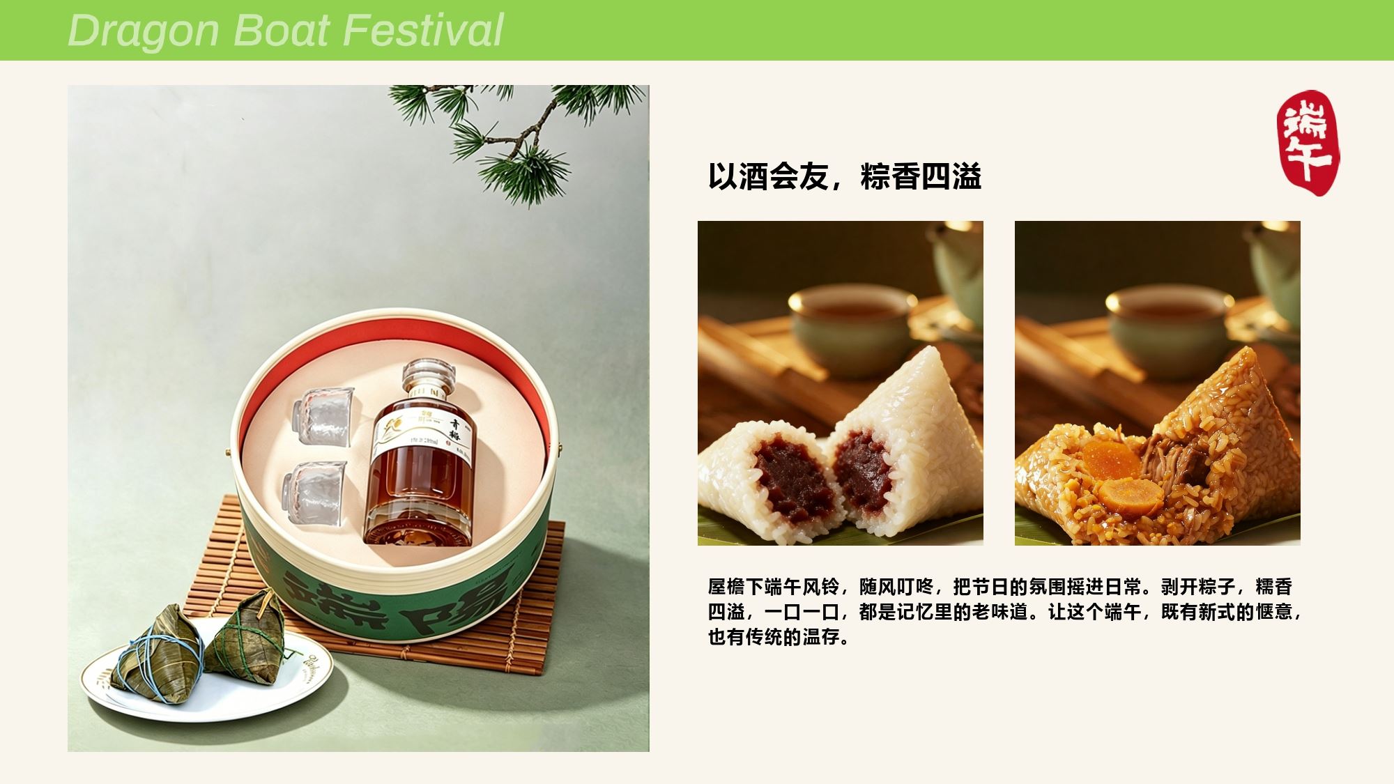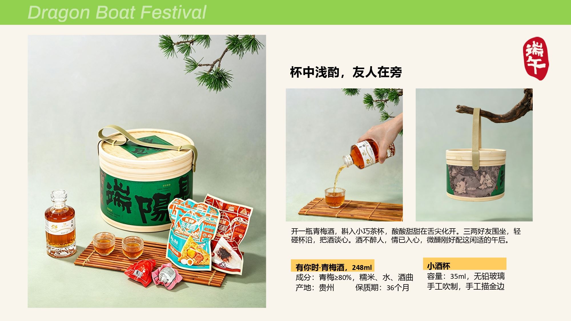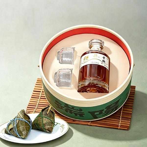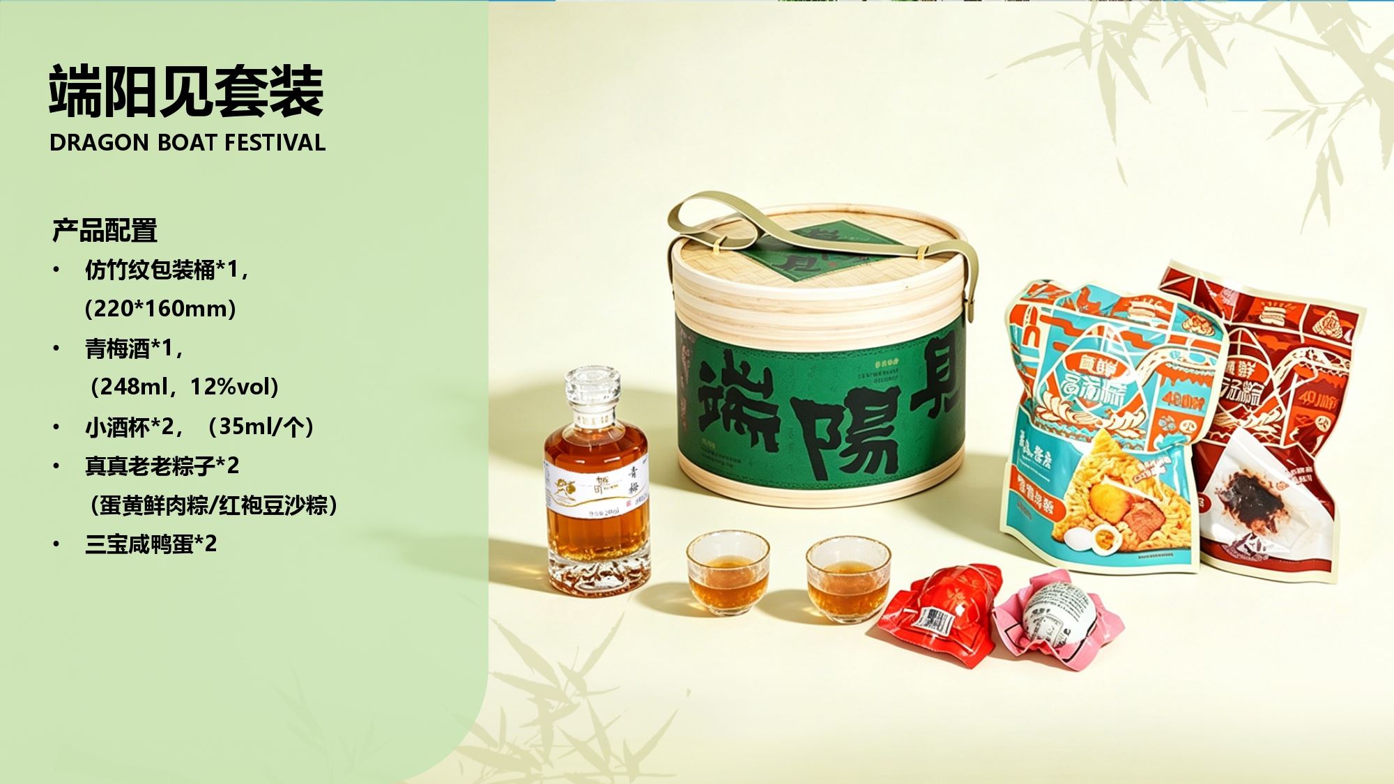 产品配置 仿竹纹包装桶*1, (220*160mm) 青梅酒*1, (248ml,12%vol) 小酒杯*2,(35ml/个) 真真老老粽子*2 (蛋黄鲜肉粽/红袍豆沙粽) 三宝咸鸭蛋*2