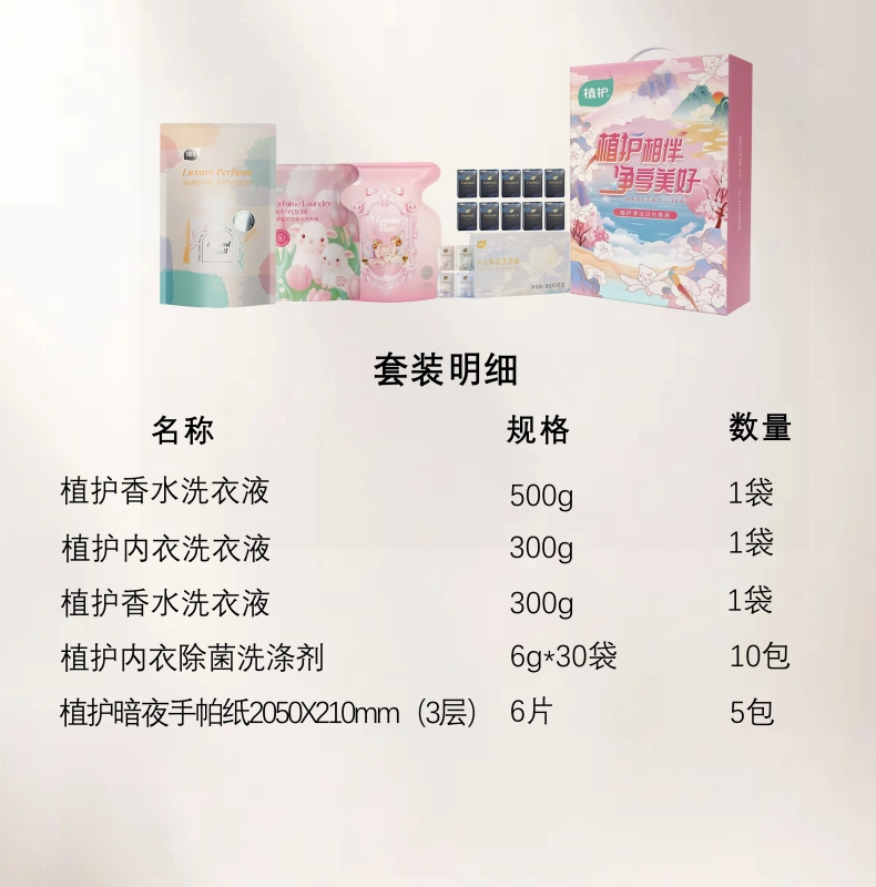 销售规格:植护香水洗衣液 500g/袋 *1袋+植护香水洗衣液 300g/袋 *1袋+植护内衣洗衣液 300g/袋 *1袋+植护内衣洗衣液6g*30袋+植护暗夜手帕纸6片*10包