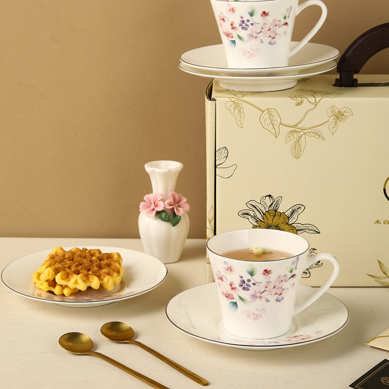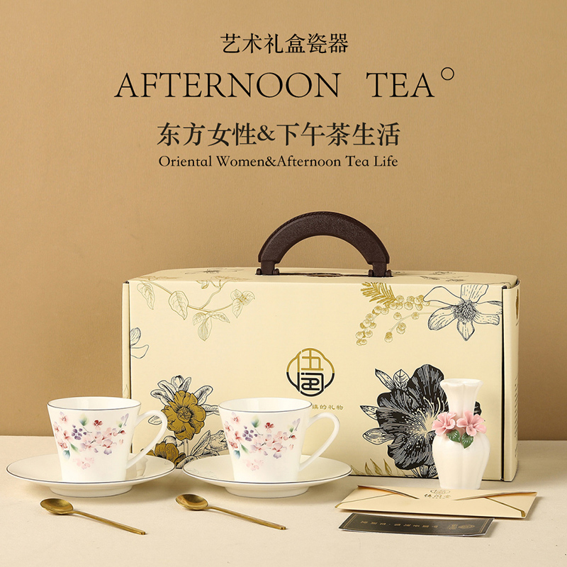 产品组成:茶咖杯2、碟子2、花瓶1、勺子2 产品材质:高骨瓷 产品工艺:贴花+描金 包装尺寸:37.5*18.2*11.5cm 外箱尺寸:39*36*40.5cm