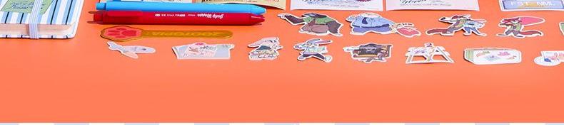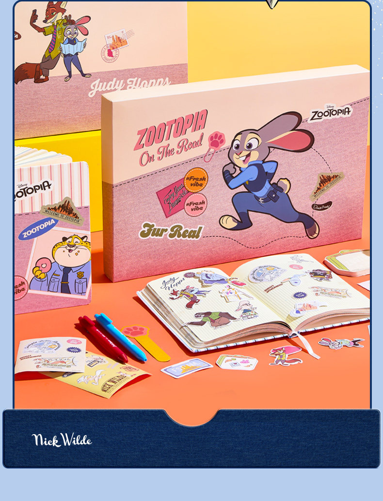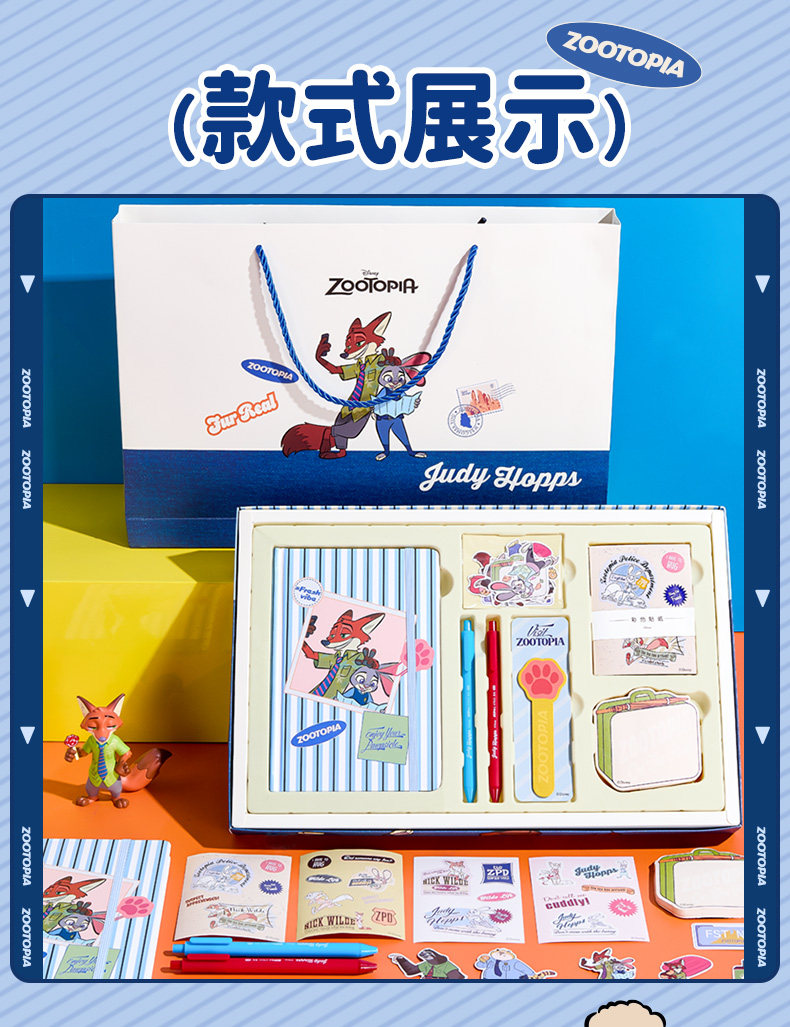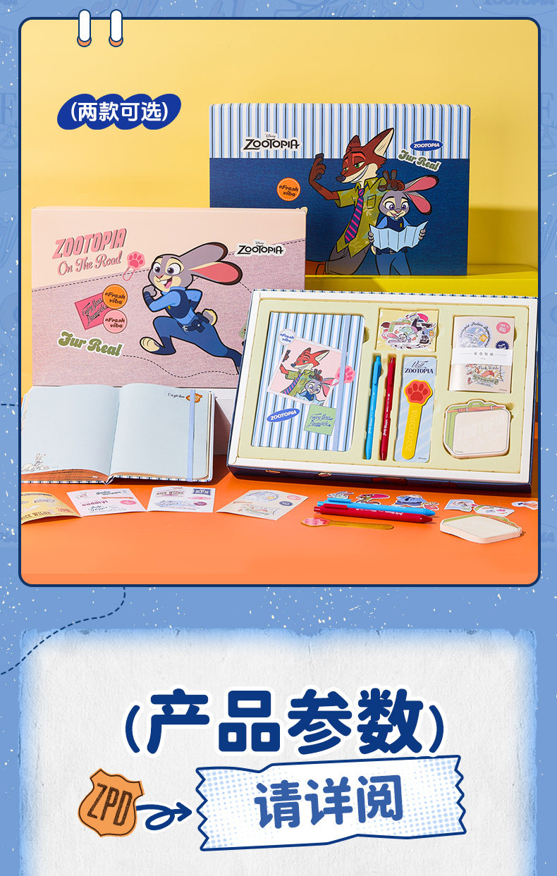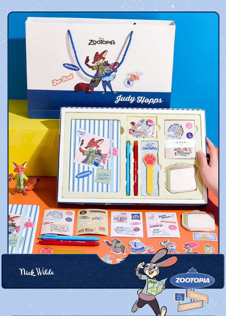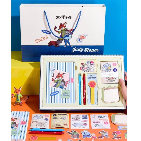 尺寸:30*26.5*4CM 材质:纸/塑料/金属 配置:精装本*1、中性笔*2、金属书签*1、便利贴*1、彩色手帐贴纸*4、异形贴纸*14 卖点: ①主题礼盒,丰富配件,满足各种手帐要求 ②配有朱迪、尼克形象的贴纸、便利贴、笔、尺子、小印章等配件,满足手账创作需求 ③礼盒内带笔记本,可满足日常记事、写日记、做周记等多种书写需求,还能搭配贴纸、便签等做手账创作,实现一物多用 ④适合学生日常使用,也很适合作为生日、六一等节日的礼物