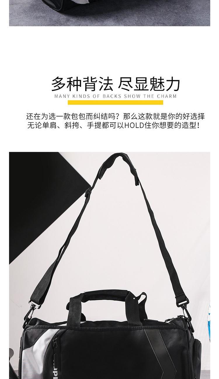 材质:聚酯纤维 尺寸:45x25x25cm 颜色:黑白 运动健身旅行 一包搞定,内部可收纳鞋子、衣物、IPAD、化妆品、毛巾等物品。