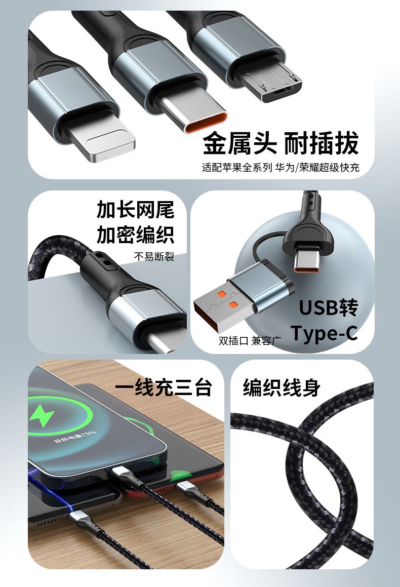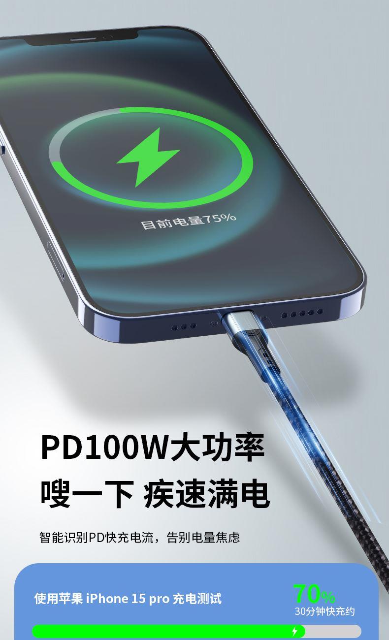 型号:XY-076 长度:1.2M 材质:TPE/ABS/铝合金 功率:100W 适用:TYPE-C/苹果/安卓 颜色:黑色 产品卖点:Type-c接口支持快充, TPE环保材质,防缠绕,耐拉伸,经久耐用,加固接头,广泛兼容,适用市面绝大多数手机。