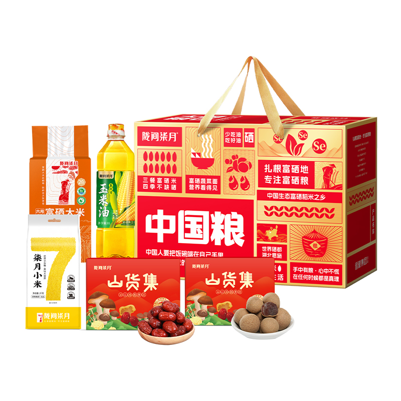 六月富硒大米1kg、柒月小米1kg、玉米油1L 甄选桂圆干100g、新疆灰枣100g 尺 寸:390×130×270mm 产品特色 1、硒有助于维持免疫系统的正常生理功能; 2、富硒大米富含有机硒,更易被人体利用吸收; 3、桂圆干:肉厚核小、果肉香甜,新疆灰枣:肉质紧实、滋补佳品。