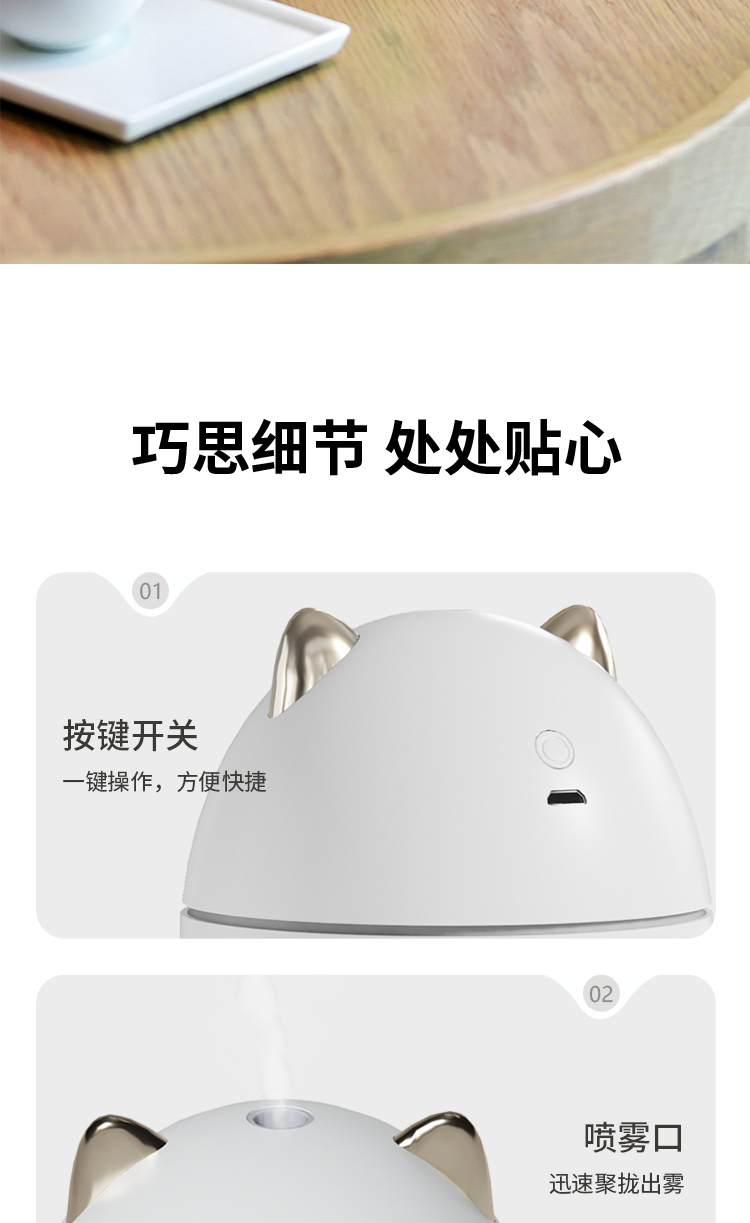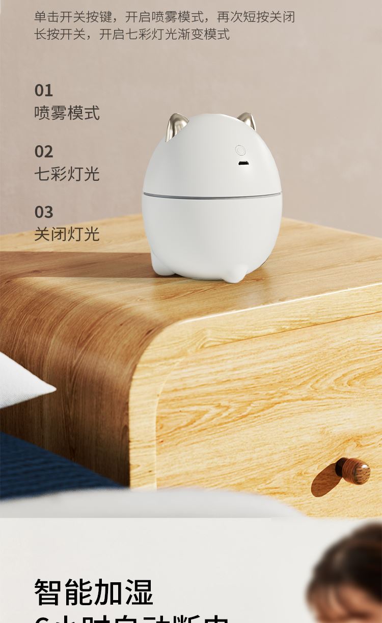 产品尺寸:82*82*113mm 彩包尺寸:95*95*116mm 外箱尺寸:500*405*525mm 单台净重:0.148kg 单台毛重:0.152kg 包装材料:彩盒 69码:6977778241321 水箱容量:200mL、充电电压:5V⎓ 充电电流:1A 额定功率:1.5-2.5W 材质:PP > 小巧萌宠,不湿桌面 > 多彩氛围灯,静音滋润一整晚 > 细雾索绕,空间不燥,出雾迅速,防干烧