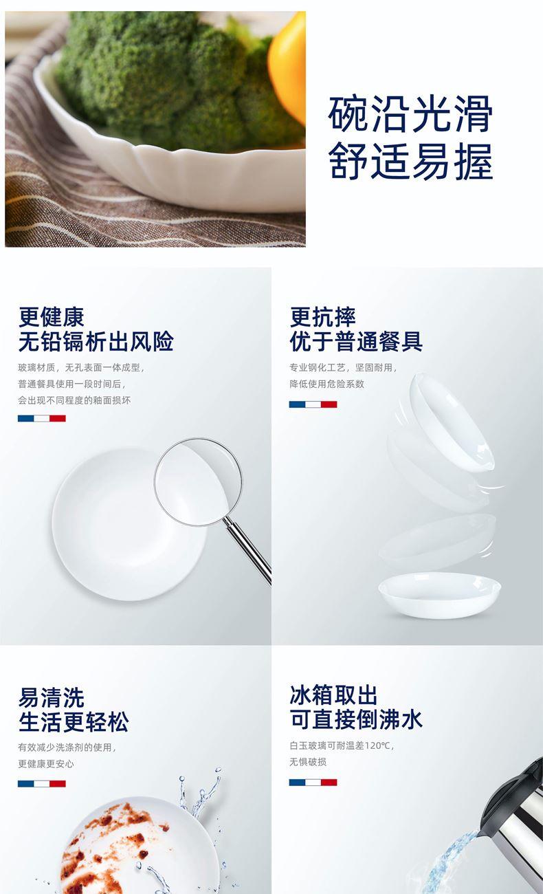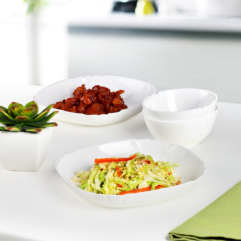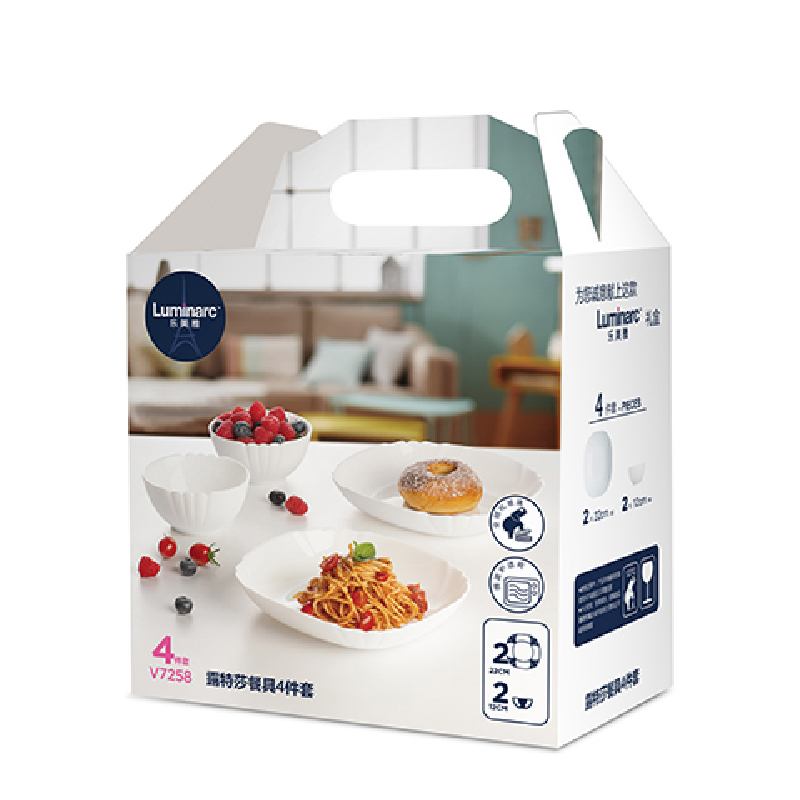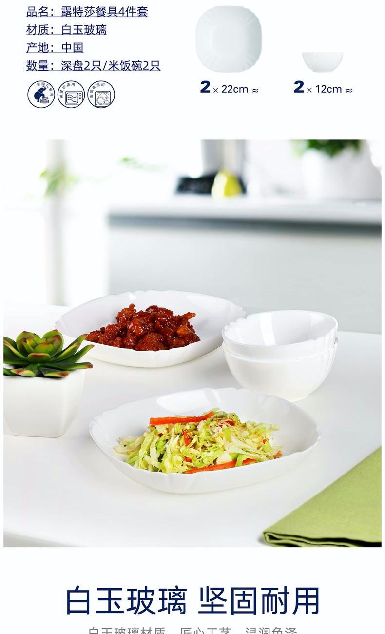 套件组成:饭碗12cm*2+深盘22cm*2 材质:白玉玻璃 工艺:钢化工艺 包装:彩盒 外箱尺寸:438*386*246mm 毛重:1.4kg/8.8kg 特点: 1.无铅玻璃材质,环保、健康 2.全钢化工艺,抗震耐刮擦,耐温差120°C,微波炉、洗碗机、皆适用 3.无孔表面,易冲无残留,减少细菌产生 4.法式设计, 质薄轻巧,方便收纳,节省空间