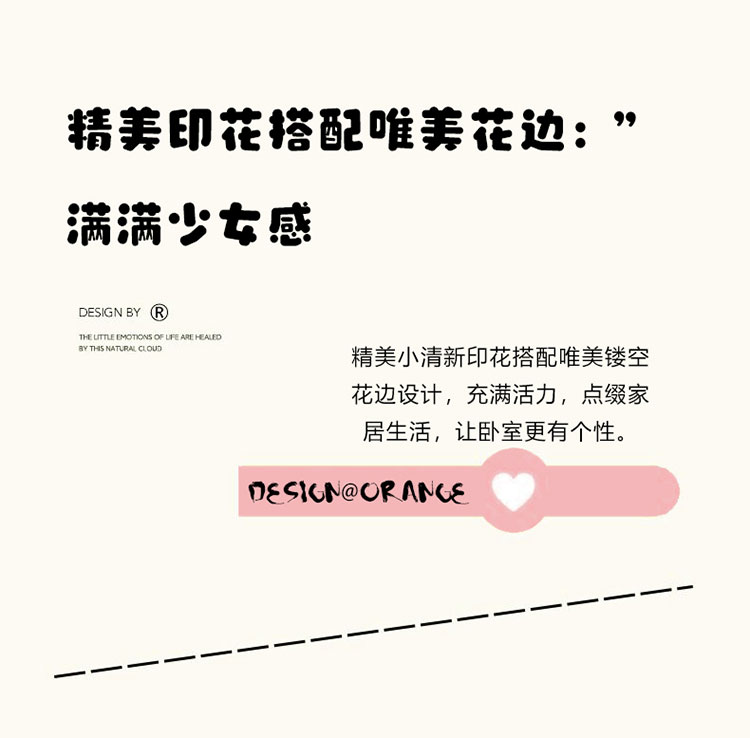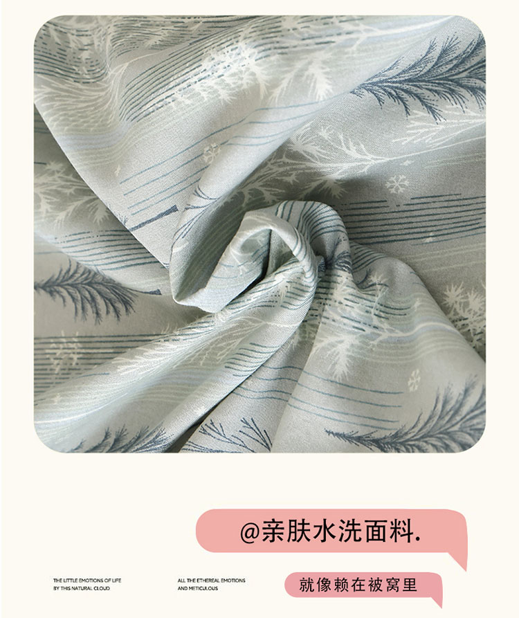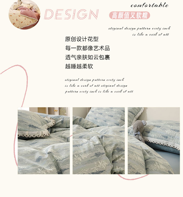 采用全工艺印染技术,牢度优异,颜色鲜艳,不易褪色,植物棉手感柔 软细腻,透气性较好,质地轻盈舒适,精致花边工艺,细密针脚,防止脱线掉线,美观更实用,深受广大消费者欢迎! 面料:水洗棉 工艺:活性印染 规格:被套 200*230cm 床单 245*250cm 枕套 48*74cm*2
