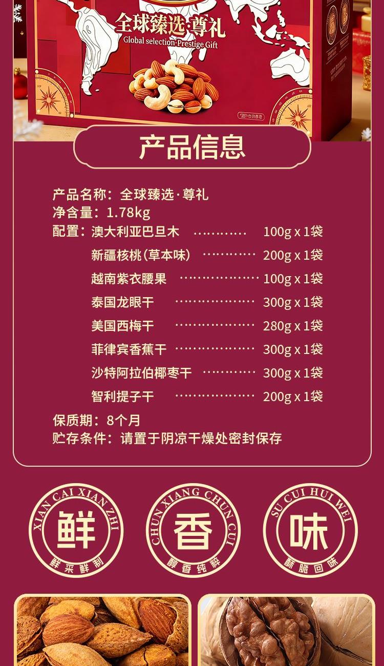 澳大利亚巴旦木100g 中国新疆核桃(草本味)200g 越南紫衣腰果100g 泰国龙眼干300g 美国西梅干280g 菲律宾香蕉干300g 沙特阿拉伯椰枣300g 智利提子干200g